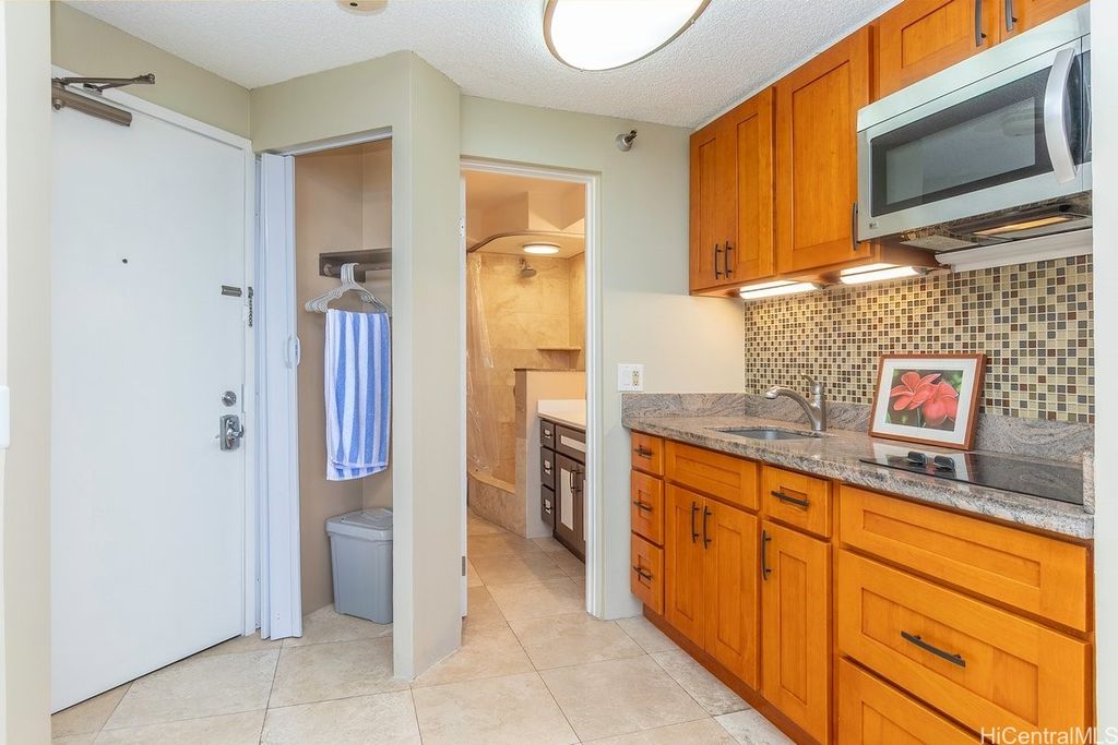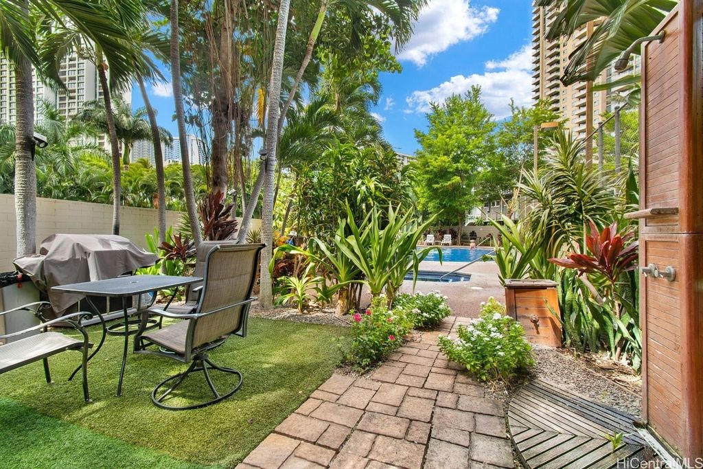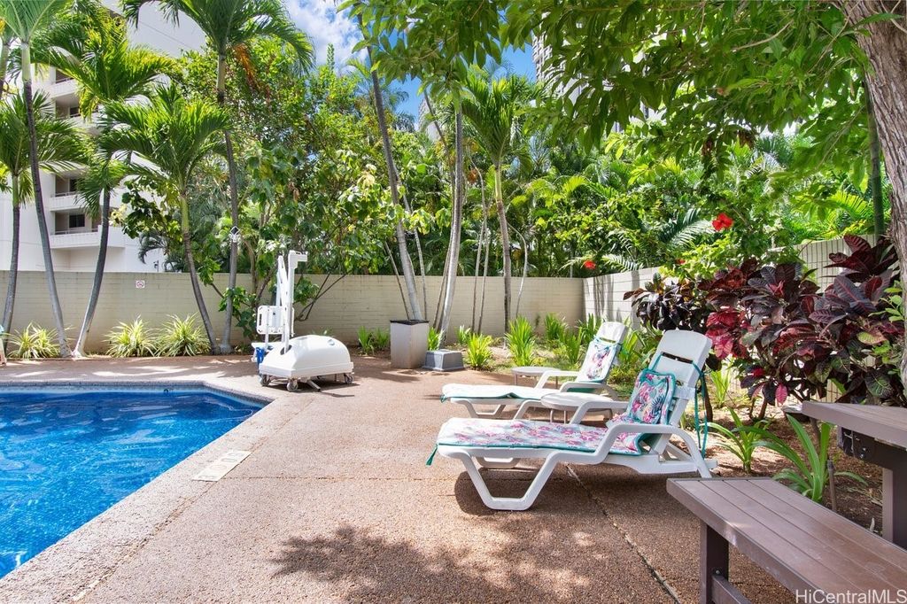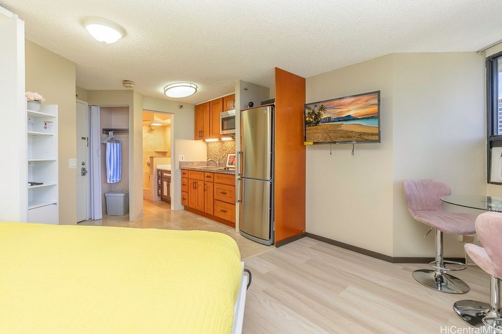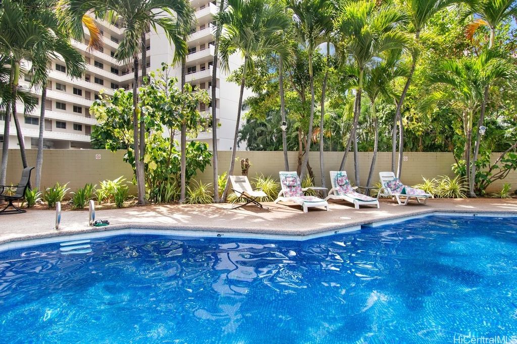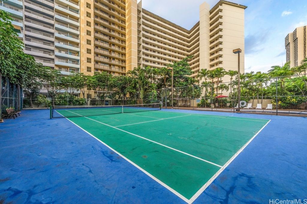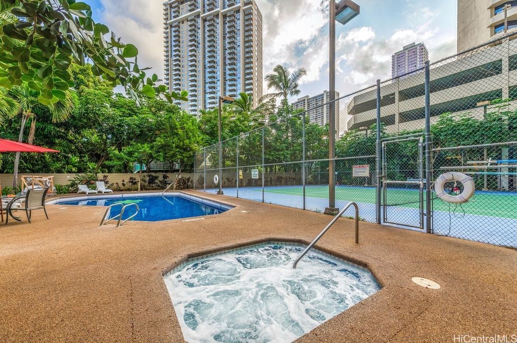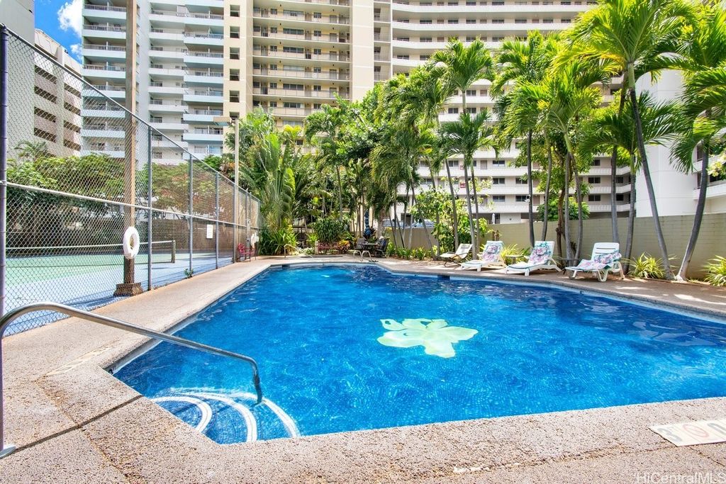 Indulge in breathtaking panoramic views of the ocean, marina, sunsets, and Friday night fireworks from this beautiful Ocean View high-floor studio at Waikiki Marina Condominium. Steps from world-famous beaches, this immaculate, turnkey retreat features sleek appliances, a space-saving Murphy bed, generous built-in storage, and a rare covered parking stall. Picture windows flood the space with natural light and perfectly frame the sparkling turquoise coastline. Resort-style amenities include a pool, jacuzzi, tennis court, BBQ area, and secured entry. With all utilities included in the maintenance fee and an unbeatable location near Ala Moana Shopping Center, fine dining, and entertainment, this ocean-view gem is a rare find in the heart of Waikiki.