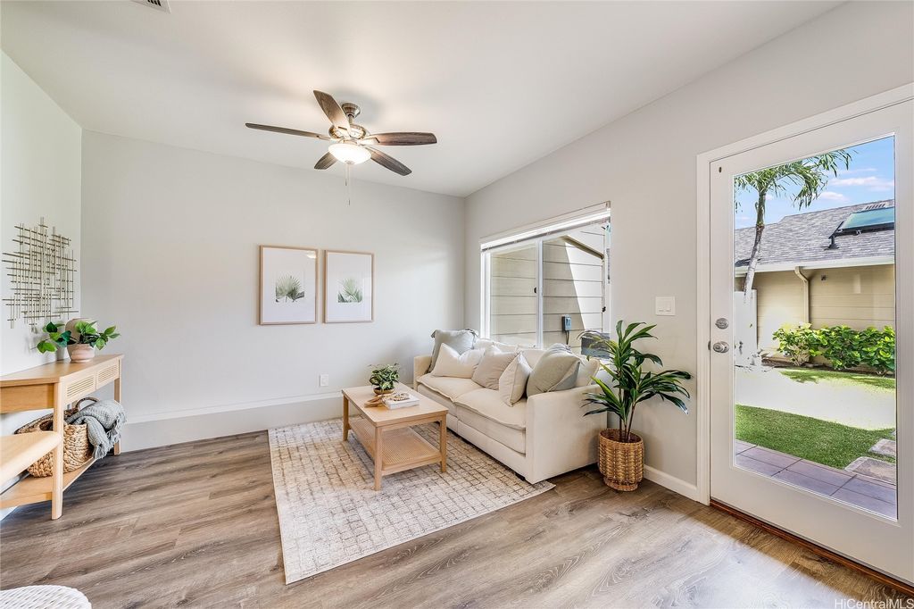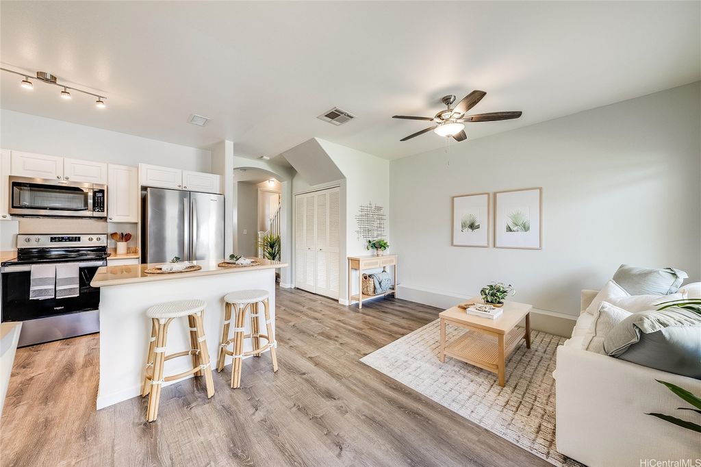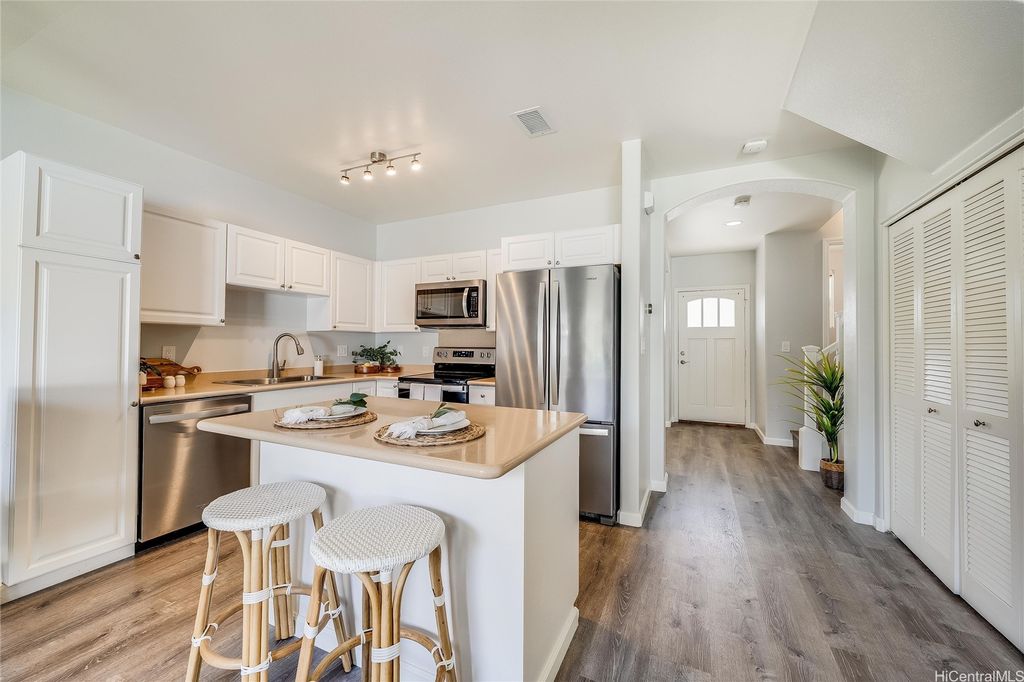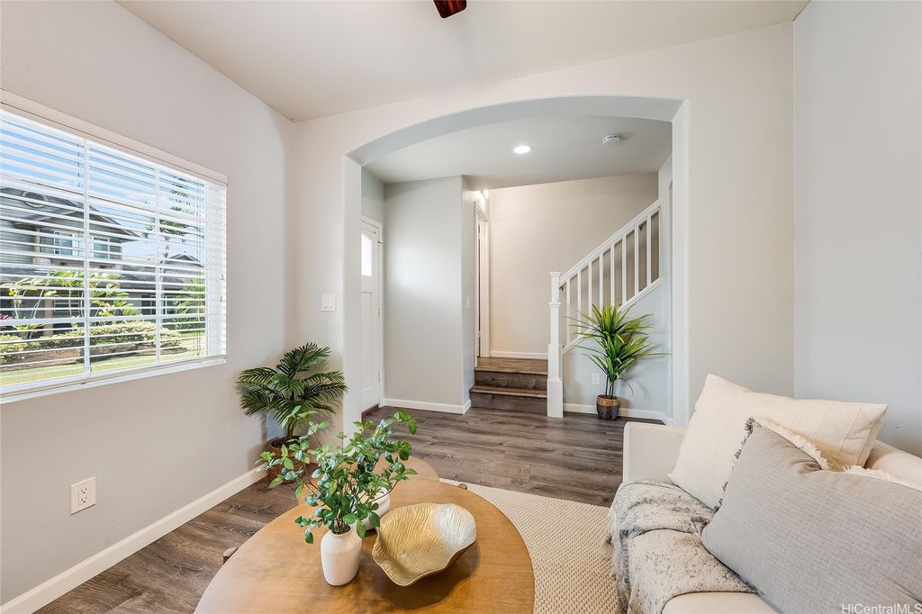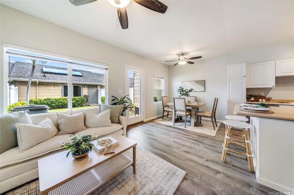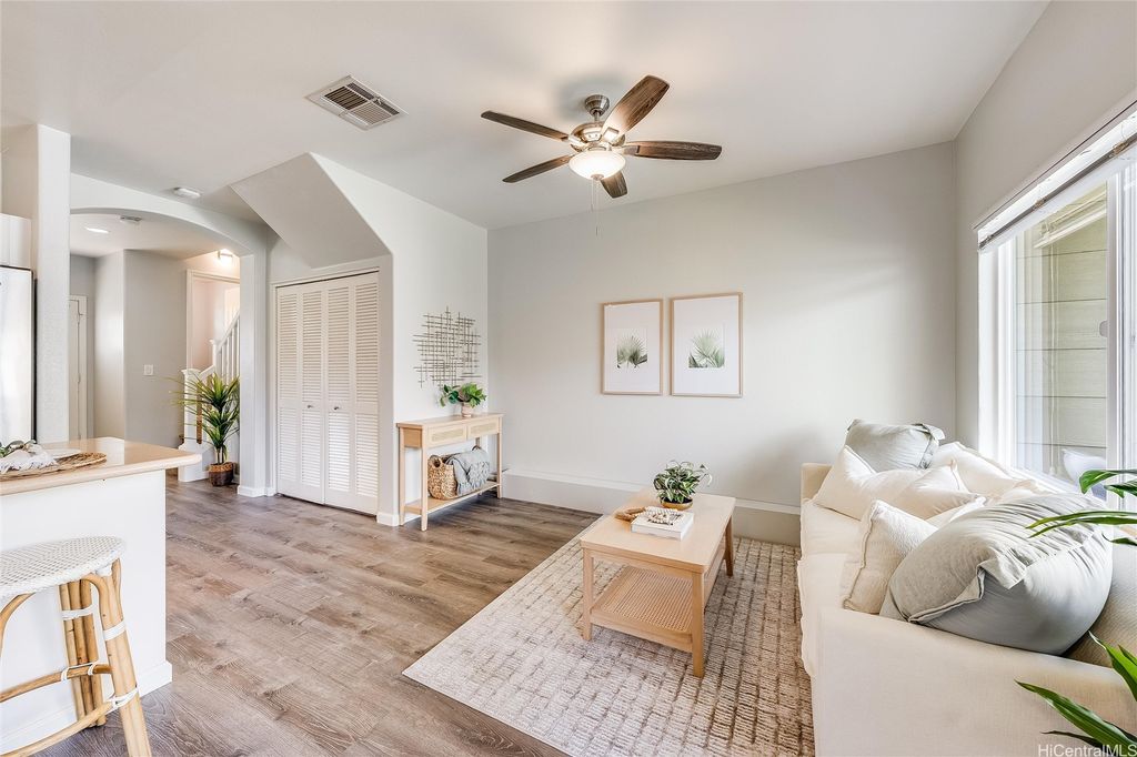 Gorgeous 2-bedroom, 2 1/2 bath townhome in the desirable neighborhood of Fairways Edge. Open concept kitchen, dining, and living room. The kitchen features newer stainless steel appliances. Large den on the first floor that would be perfect for a home office or second living room. Both bedrooms upstairs have their own en suite bathrooms. This home features luxury vinyl plank flooring throughout for easy maintenance. The private yard is beautifully landscaped and ready for entertaining. Located minutes from beaches, shops, and restaurants. Walk to the nearby elementary and middle school. The neighborhood features a pool, bbq area, and walking paths with views of the Hoakalei Golf Course. Come see all this home has to offer!