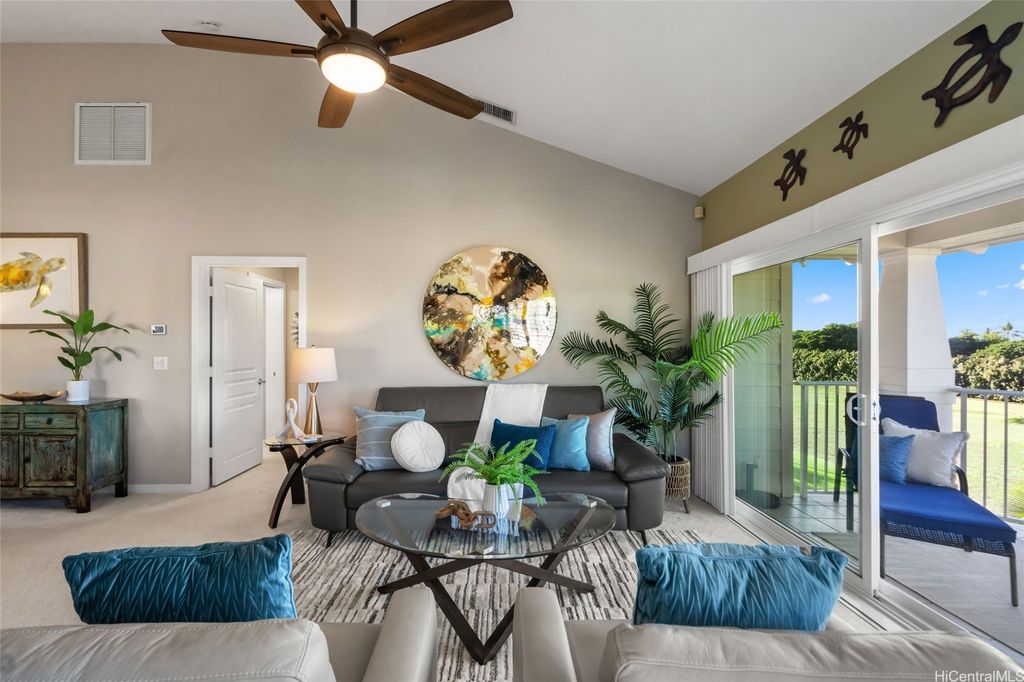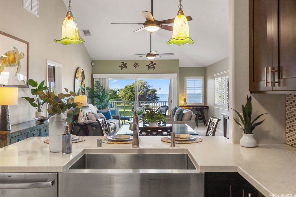 Experience oceanfront luxury in this rarely available "front row" 2 bedroom, 2 bath townhome in Kai Lani. Boasting unparalleled, turquoise ocean views and breathtaking sunsets, this beautifully renovated retreat offers a sophisticated yet inviting ambience. The open-concept living space is fully furnished with elegant, high-end pieces that perfectly balance comfort and style, making it ideal for both relaxation and entertaining. Step out onto your spacious lanai to soak in the serene beauty of the ocean, with whales gracefully swimming by during the season. Added highlights include a 1-car garage with extra storage, an additional open parking space, and a direct oceanfront location that ensures privacy and tranquility. Located within the world-class Ko'Olina Resort, you're just a short stroll from award-winning restaurants, boutique shops, and scenic walking paths along stunning lagoons. This is more than a home- it's a lifestyle of luxury, beauty, and serenity. Don't miss this rare opportunity to own this slice of paradise. Make it yours today!