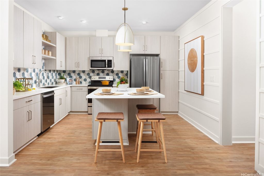 Brand new! A beautiful 3 bedroom 2 bath with a garage available now! This home has 9' ceilings, designer cabinets, solid surface counter tops and stainless steel appliances, Luxury Vinyl Plank, plush carpeting and blinds throughout. Energy savings abound with high efficiency SEER2 Central AC, digital thermostat, Solar hot water heater, spray foam insulation, Insulated garage door, EV ready and more. This open floor plan has spectacular windows and large covered Lanai. A great location to food and shopping with a quick jump to the freeway and a few minutes to the beach! Call for Special Financing incentives! This home is in our Reserve Housing program in cooperation with HCDA. Additional information attached regarding program specifics to qualify. Open Daily to view, some pictures are of model home.