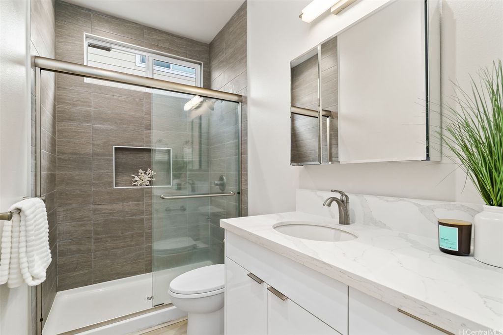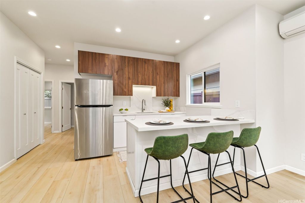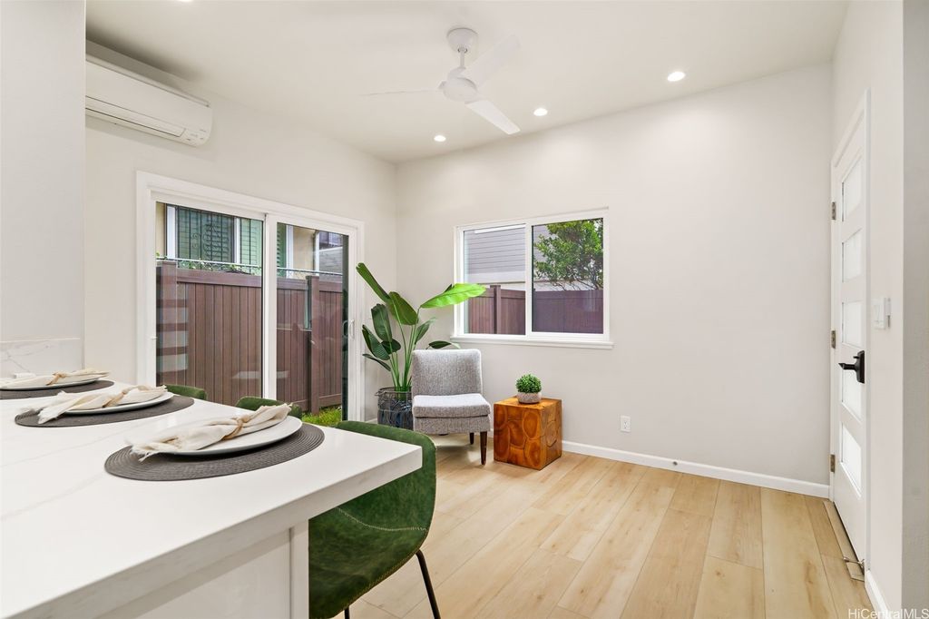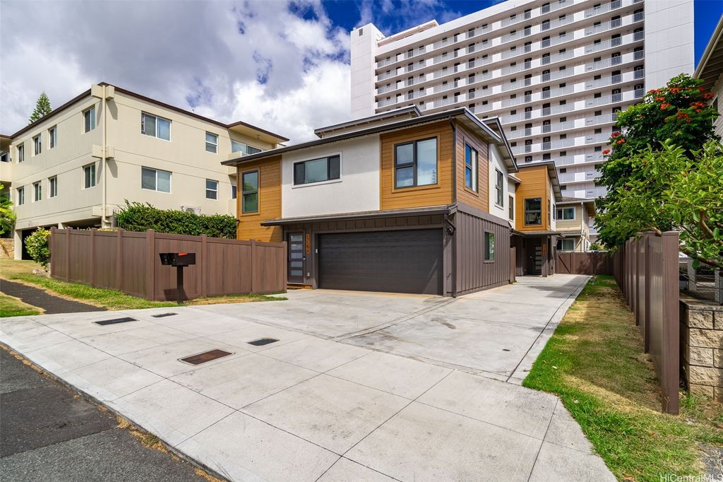 Experience modern living at its finest in this newly constructed home at Villas at Keeaumoku. With its sleek architecture and contemporary design, this property stands out for its clean lines and attention to detail. The main floor offers 3 bedrooms and 2 baths, with an open-concept kitchen, dining, and living area that's perfect for gathering and entertaining. Large windows invite plenty of natural light, and the layout is designed to take full advantage of cooling trade winds. Downstairs, the flexible 2-bedroom, 1-bath space provides additional living options, ideal for extended family or guests. The fully enclosed yard offers privacy and a serene space for outdoor activities, pets, or unwinding at the end of the day. Centrally located in Honolulu, this home is close to Downtown, Ala Moana, and excellent schools, providing both convenience and a sense of community.