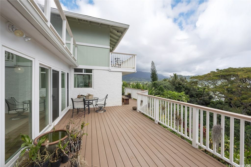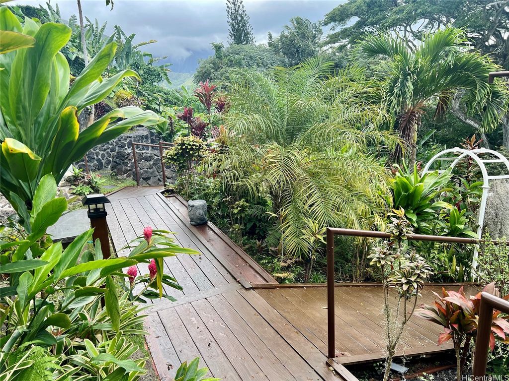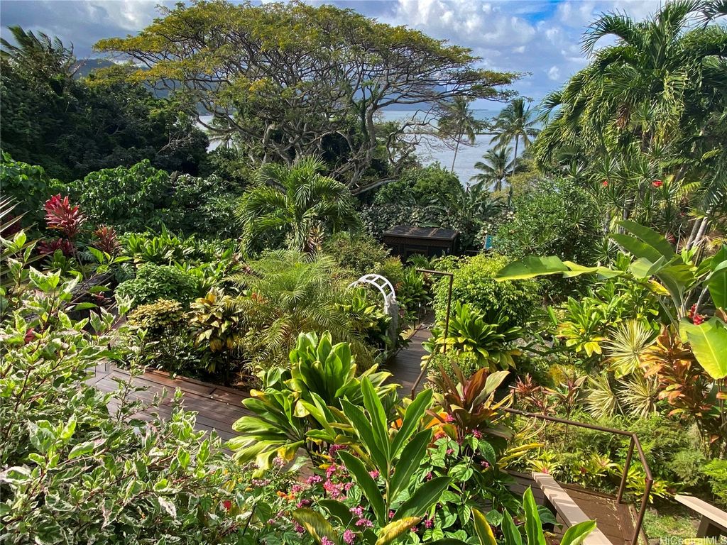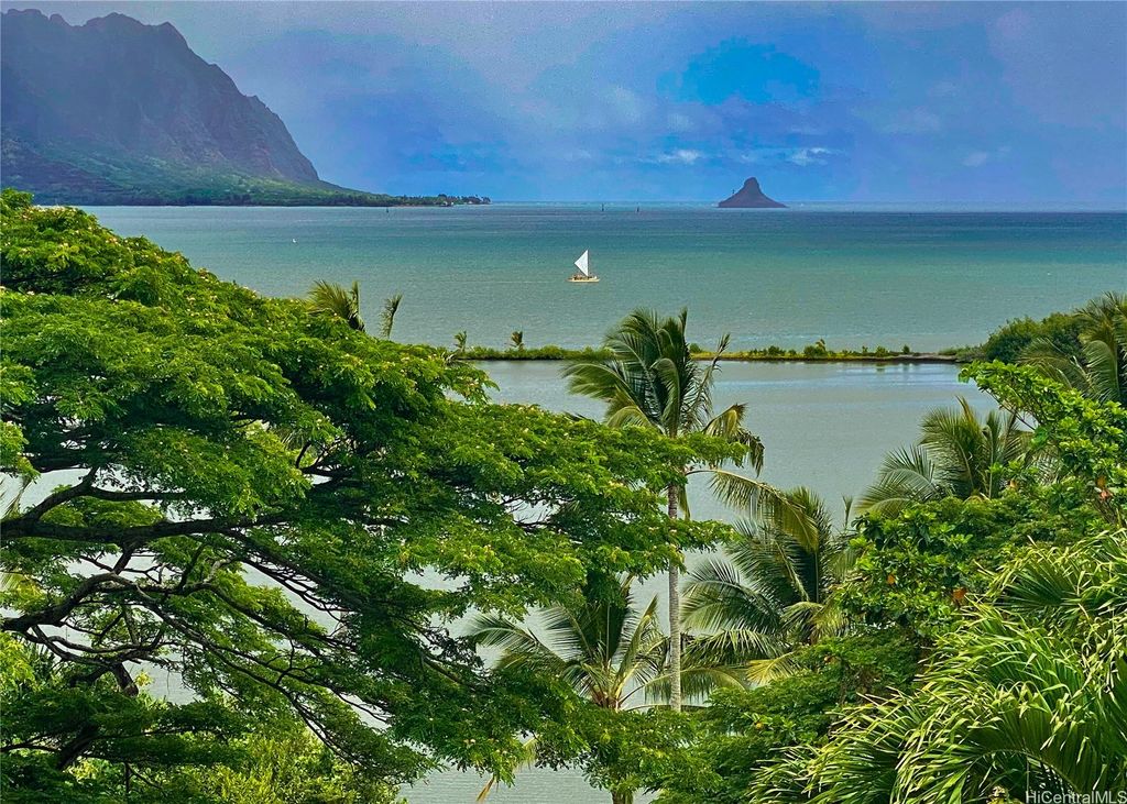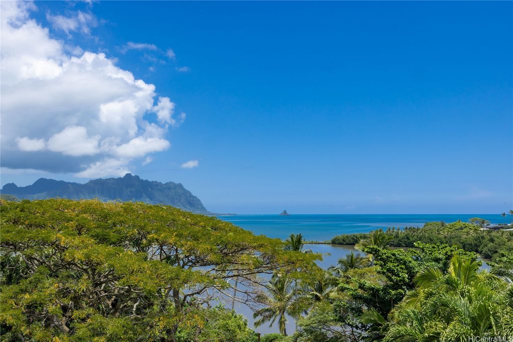 Welcome to beautiful Lulani, a quiet loop above the ocean, where panoramic ocean and mountain views (no wires!) are part of daily life. This property has a special rim lot location and charming setting overlooking one of the few remaining ancient Hawaiian fishponds on Oahu. Rare level entry (no stairs!) into the main living space which opens through walls of glass to wide decks and postcard views. This floor has large living/dining area, kitchen, 2 bedrooms (possible 3rd) and 2 baths. The primary ensuite bedroom opens to private ocean view lanai. Wide interior stairs lead to the lower level containing 2 bedrooms, 2 baths, living area and large deck. Ideal for multi-generation living. On this level, a second primary suite also opens to an ocean view lanai. Professionally landscaped, the backyard is a stunning botanical garden complete with walkways, railings, waterfall, screened high ceilinged gazebo, and gardening shed. Recent renovation of kitchen, updated electrical service, two of the 4 baths, windows and decks. Just 4 miles to major shopping centers, restaurants and stores in Kaneohe town.