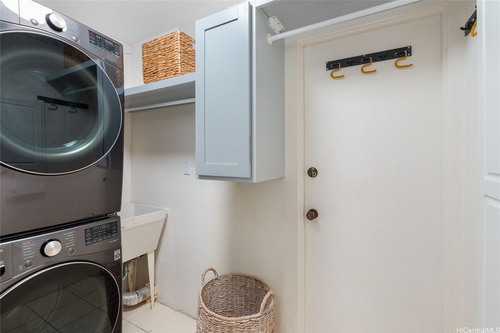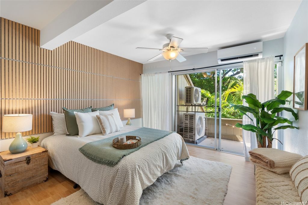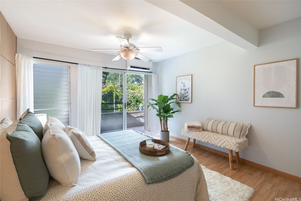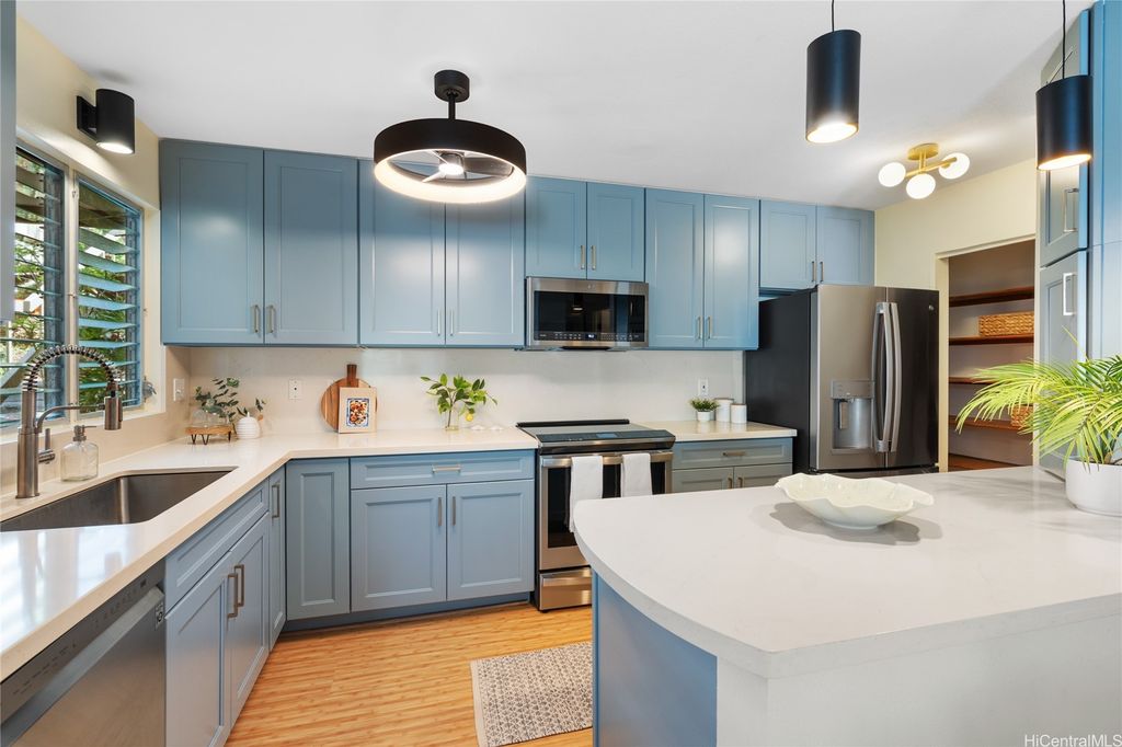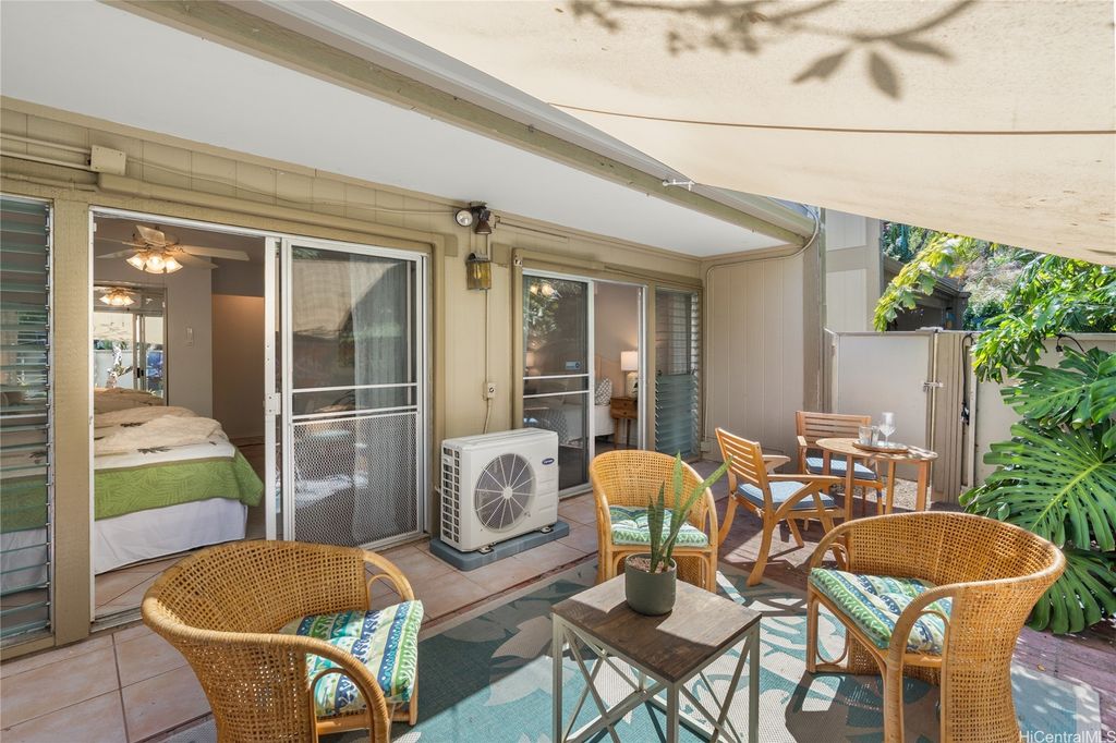 Seller offering $10k CREDIT!! This thoughtfully designed split-level townhome offers the perfect balance of comfort, and functionality. Vaulted ceilings create a bright, open living space that flow from the freshly remodeled kitchen to the dining and living areas. New lighting fixtures enhance the warm, inviting atmosphere, making this space ideal for casual gatherings or entertaining. Step outside to the spacious lanai, where mornings begin with coffee and views of the lush tropical surroundings. The primary suite, conveniently located on the entry level, provides ease and comfort, while the lower level extends the living experience with two additional bedrooms, a private fenced lanai, and a versatile flex space perfect for a home office, hobby room. The lanai also features direct access to wide-open grassy grounds. Practicality is built in with generous storage within the unit and an additional space near your two assigned parking stalls. Recent updates include new lighting, a remodeled kitchen, and four efficient split A/C units to keep the home cool year-round. With quick access to H-3, Kailua, and Kaneohe, this property combines convenience with the relaxed island lifestyle.