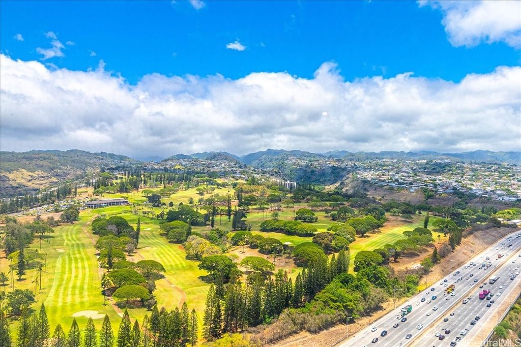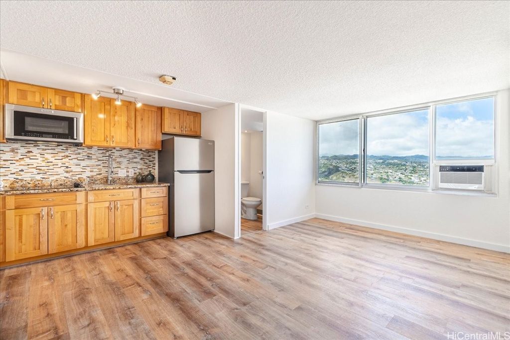High floor! Beautiful and well-maintained studio at Pearlridge Square with 1 covered parking stall. Enjoy stunning views of the ocean, golf course, Diamond Head, Pearl Harbor, mountains, city, and sunrise. Recent upgrades include: brand-new high-quality vinyl plank flooring installed in June 2025, fresh paint, new refrigerator, refinished kitchen, bathroom cabinetry and walk-in shower. Amenities include: pool, sauna, tennis courts, fitness center, tennis courts, library, recreation area, community laundry, on-site resident manager's office in the lobby and ample guest parking. Conveniently located in the heart of Aiea, near Pearlridge Mall, shopping, and dining, Pearlridge Skyline Station, Pali Momi Medical Center, Pearl Country Club, Pearl Harbor, Hickam Air Force Base, HNL airport, and on/off ramps to the H-1 freeway.