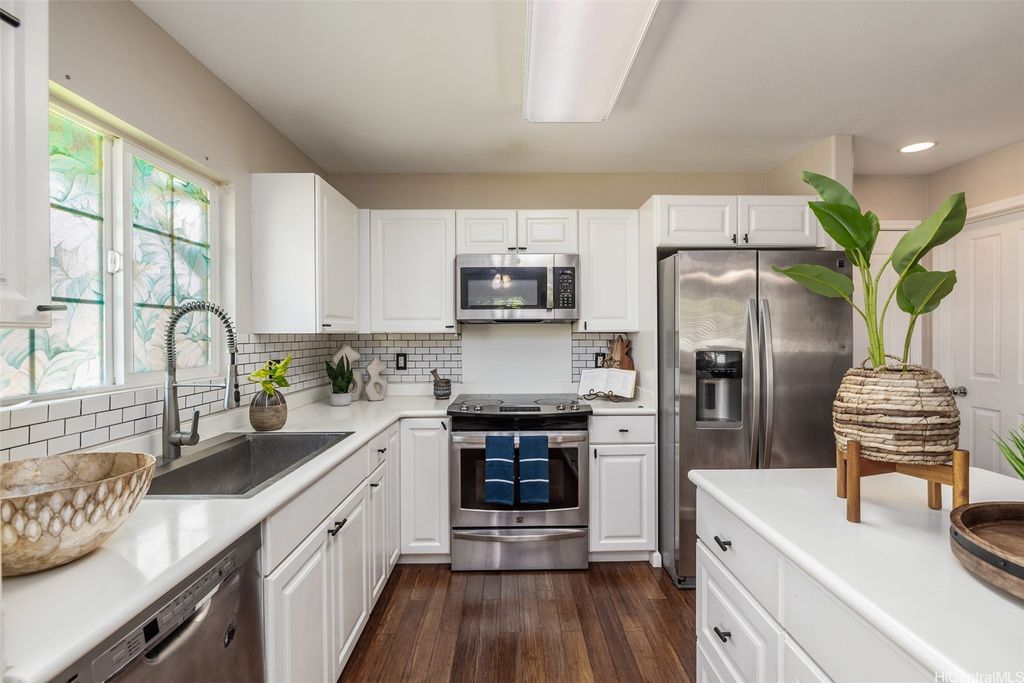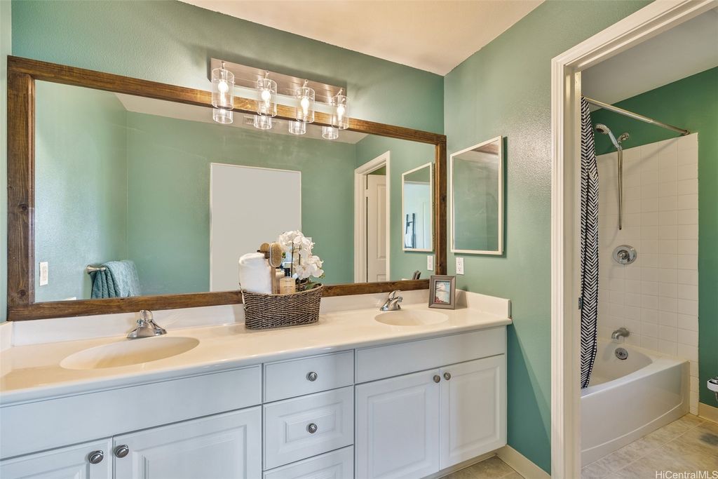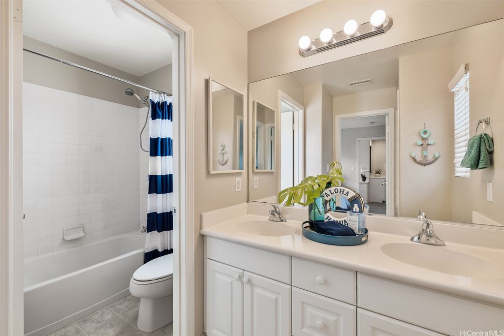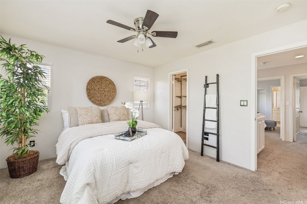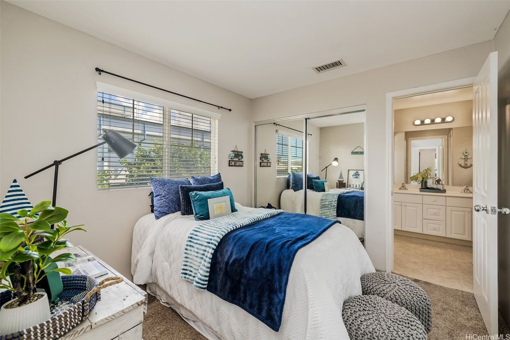 Welcome to this beautifully maintained corner-unit townhome in the sought-after Town Homes at Fairway's Edge. Tucked away in a quiet, private location on the outer edge of the neighborhood, this 3-bedroom, 2.5-bath home offers added privacy, less traffic noise, and a thoughtfully designed layout. A spacious, fenced front yard leads to your private two-car garage with extra storage. Inside, the open living area features warm wood flooring, a recessed entertainment nook, and a dining space that flows seamlessly into the modern kitchen; complete with stainless steel appliances, farmhouse sink, and subway tile backsplash. A convenient half bath is located downstairs, along with the washer and dryer just off the kitchen. Upstairs, the expansive primary suite boasts an ensuite bath and walk-in closet, while the second and third bedrooms are connected by a Jack-and-Jill bathroom. A built-in desk on the upstairs landing provides the perfect spot for remote work or homework. Enjoy easy access to guest parking, the community pool, and BBQ area, all within minutes drive from shopping, dining, schools, and Ewa Beach Park. This home blends comfort, convenience, and location!