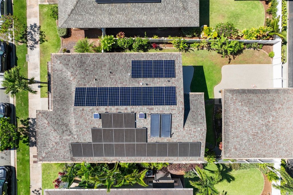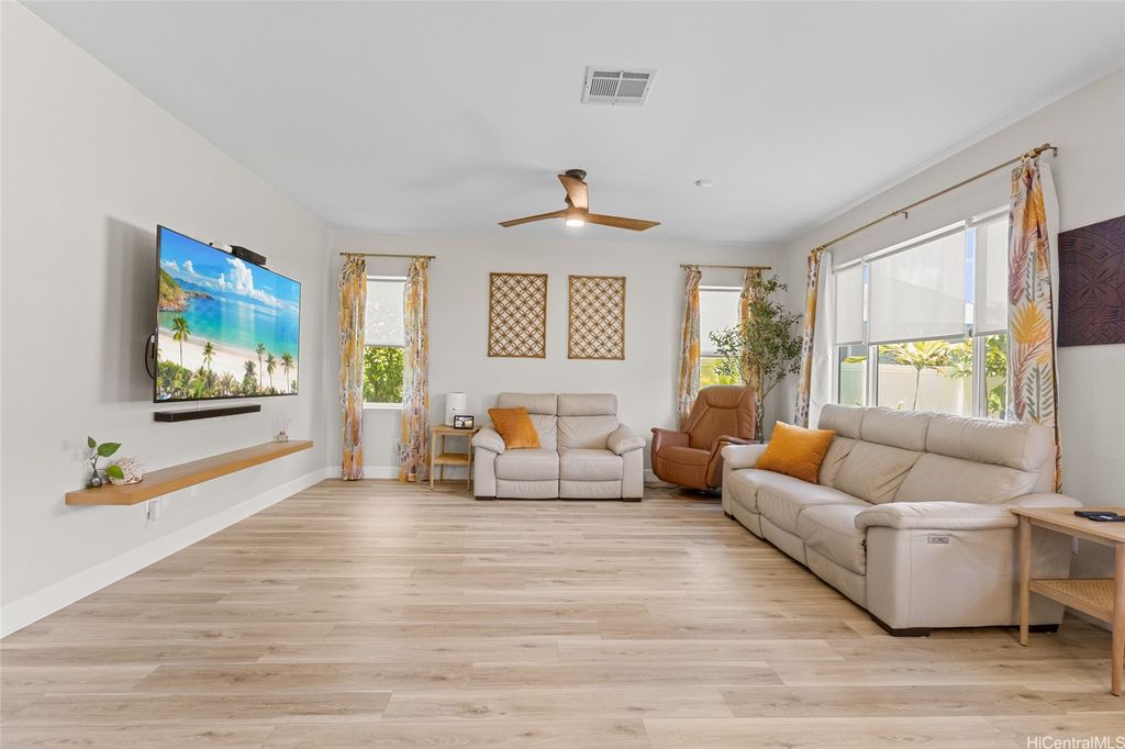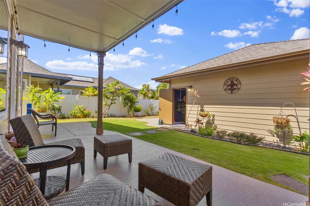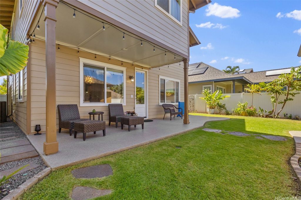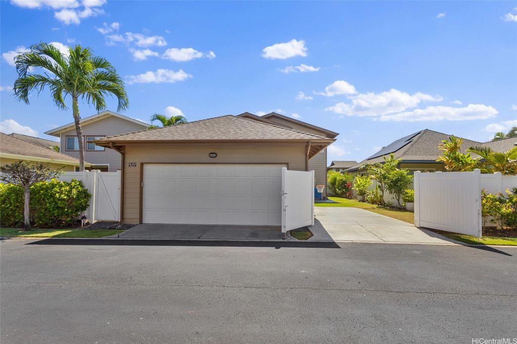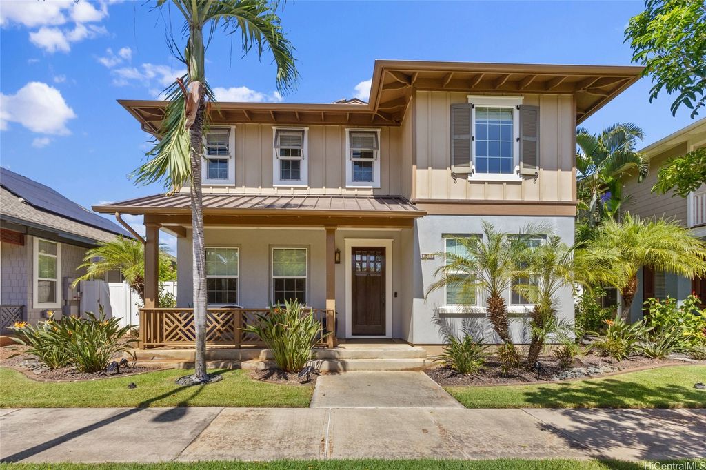 Sellers open to VA buyers"”assumable loan at 2.375%. Discover this stunning 2-story home in Hoakalei - Ka Makana, offering 5 bedrooms and 3 full baths. Enjoy quality finishes throughout, starting with an open-concept front living area featuring soaring ceilings and high windows. The first floor includes a bedroom and full bath, ideal for guests. The spacious great room connects to a gourmet kitchen with a large island"”perfect for cooking and entertaining. Upstairs you'll find 3 additional bedrooms and a luxurious primary suite with a large walk-in closet, king-size layout, soaking tub, and double shower. The landscaped backyard is great for barbecues and outdoor fun. A 2-car garage offers storage lockers, wall organizers, and a coated floor, plus an extra parking pad for a third vehicle. Home includes 33 owned photovoltaic panels and a Tesla battery. Just minutes from the Swim Club with pool, gym, and tennis court, and close to beaches, golf, shopping, and dining.
