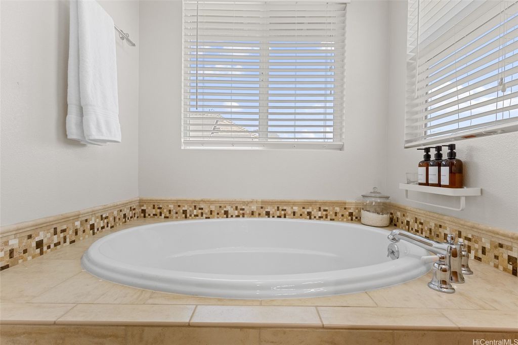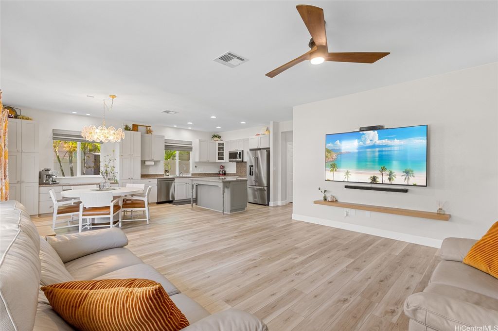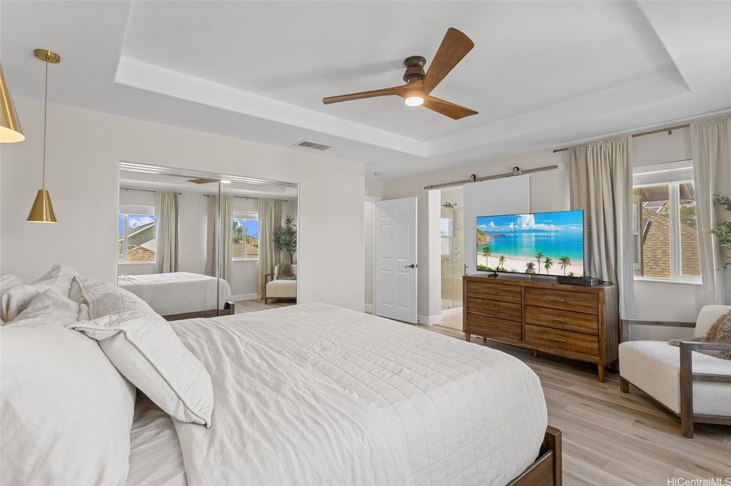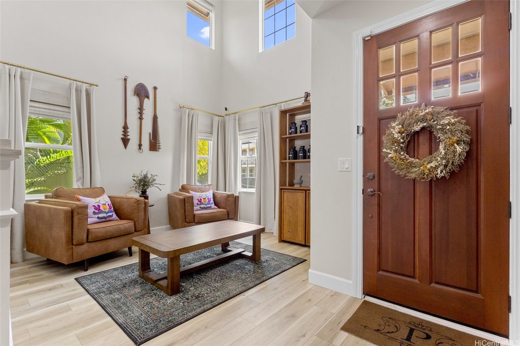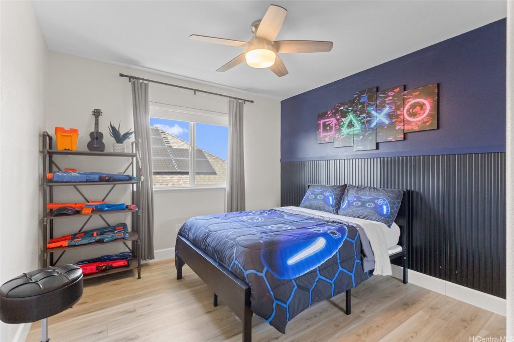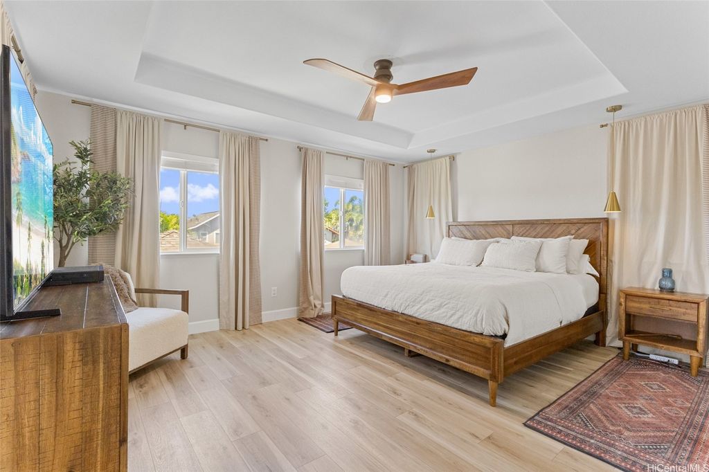 Sellers open to VA buyers"”assumable loan at 2.375%. Discover this stunning 2-story home in Hoakalei - Ka Makana, offering 5 bedrooms and 3 full baths. Enjoy quality finishes throughout, starting with an open-concept front living area featuring soaring ceilings and high windows. The first floor includes a bedroom and full bath, ideal for guests. The spacious great room connects to a gourmet kitchen with a large island"”perfect for cooking and entertaining. Upstairs you'll find 3 additional bedrooms and a luxurious primary suite with a large walk-in closet, king-size layout, soaking tub, and double shower. The landscaped backyard is great for barbecues and outdoor fun. A 2-car garage offers storage lockers, wall organizers, and a coated floor, plus an extra parking pad for a third vehicle. Home includes 33 owned photovoltaic panels and a Tesla battery. Just minutes from the Swim Club with pool, gym, and tennis court, and close to beaches, golf, shopping, and dining.