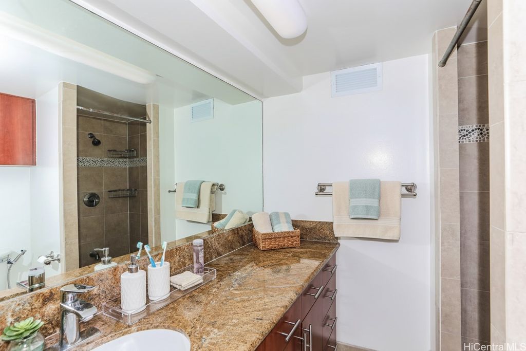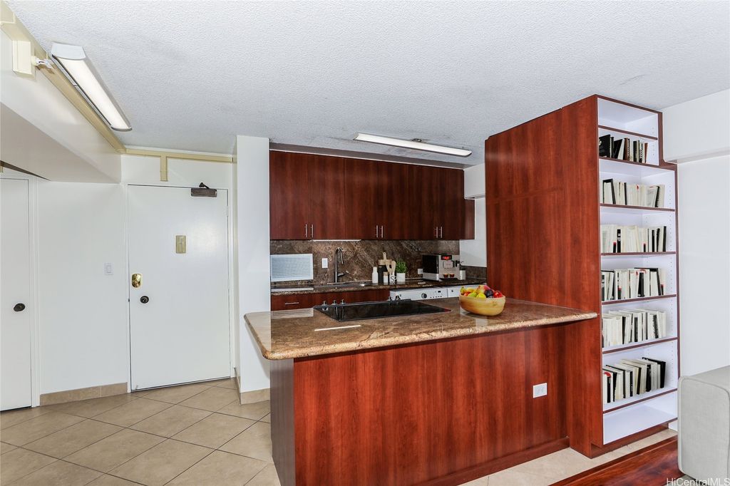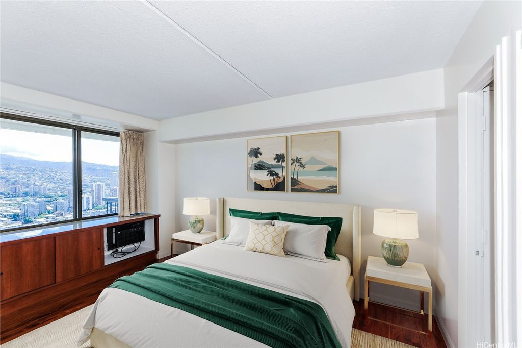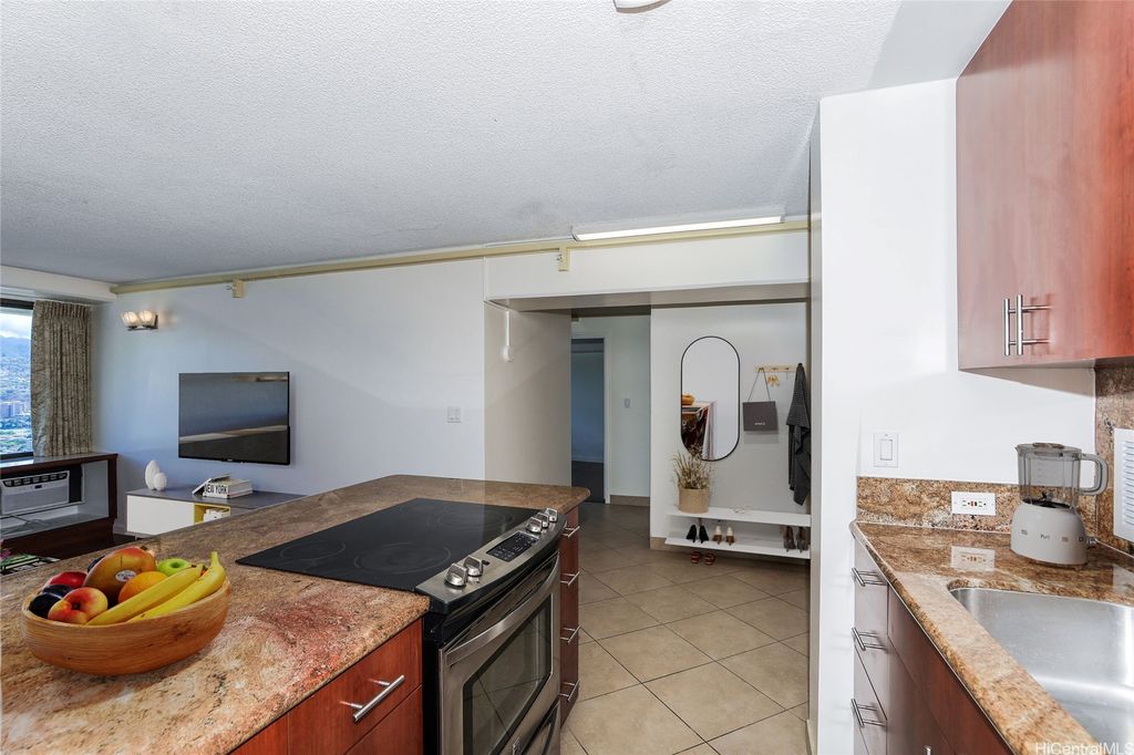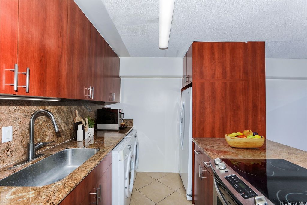 One Level Below Penthouse - Remodeled Condo with stunning views of the Koolau mountains. This beautiful newly remodeled 2-bedroom, 2-bath condo unit offers stunning views of the city and Koolau mountains. The cozy open-concept kitchen features upgraded countertops, backsplash, and appliances, flowing seamlessly into the living area"”perfect for entertaining. Enjoy the convenience of in-unit washer and dryer, alarm/fire sprinkler system, and one covered/secure assigned parking stall. Resort-style living awaits with 24-hour security and an array of amenities including a pool, sauna, guest parking, courtyard, basketball and tennis courts, BBQ areas, putting greens, car wash station, and an on-site convenience store located lobby level. Centrally located near downtown Honolulu, UH Manoa, Ala Moana Center, Waikiki, beaches, dining, shopping, and public transportation. Urban living meets island comfort"”don't miss this rare opportunity! Sold As Is, enhanced and virtually staged photos.