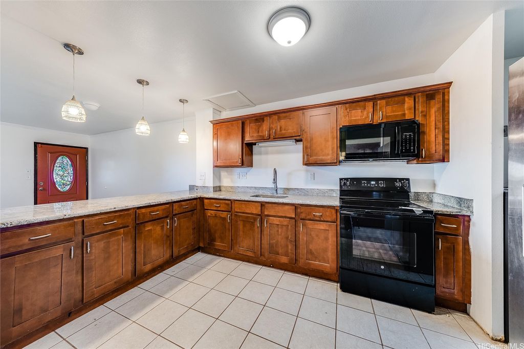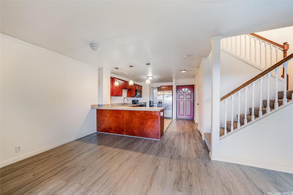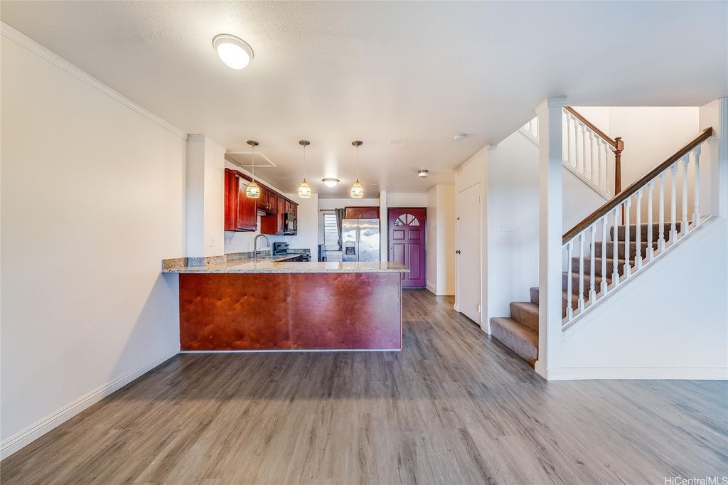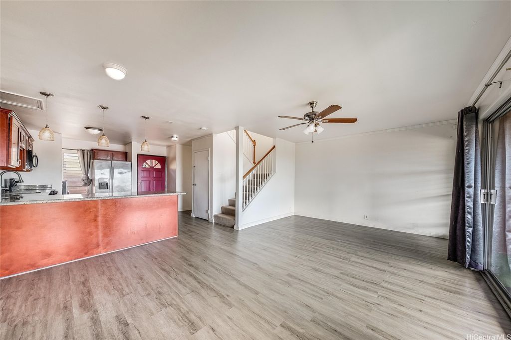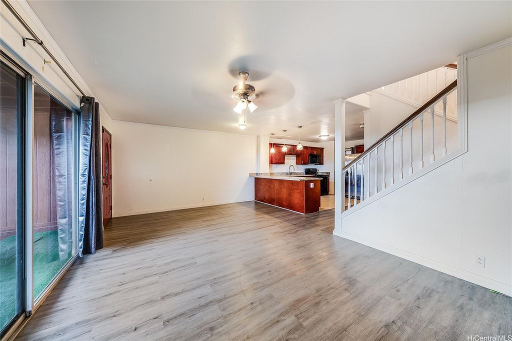 Welcome to this spacious and beautifully updated 4-bedroom, 2-bathroom two-story townhome located in the heart of Kapolei. This home features a stylish open-concept kitchen with rich wood cabinetry, granite countertops, and modern black appliances, including a refrigerator, oven, microwave, and range. Enjoy ample storage, pendant lighting over the breakfast bar, and a seamless flow into the bright living and dining areas. The home also boasts tile and luxury vinyl plank (LVP) flooring throughout, ceiling fans, in-unit washer and dryer, and two assigned uncovered parking stalls (#40 & #44). Enjoy relaxing on the private patio or take advantage of the community amenities including a pool and nearby parks. Rent includes water sewer trash and landscaping