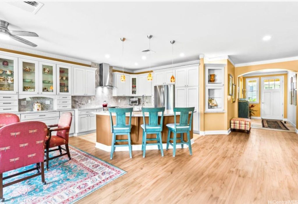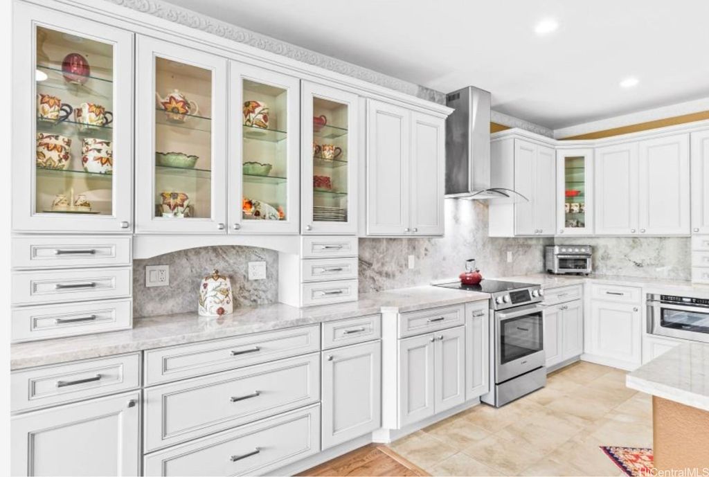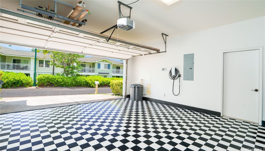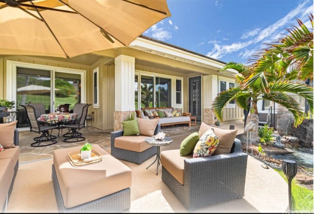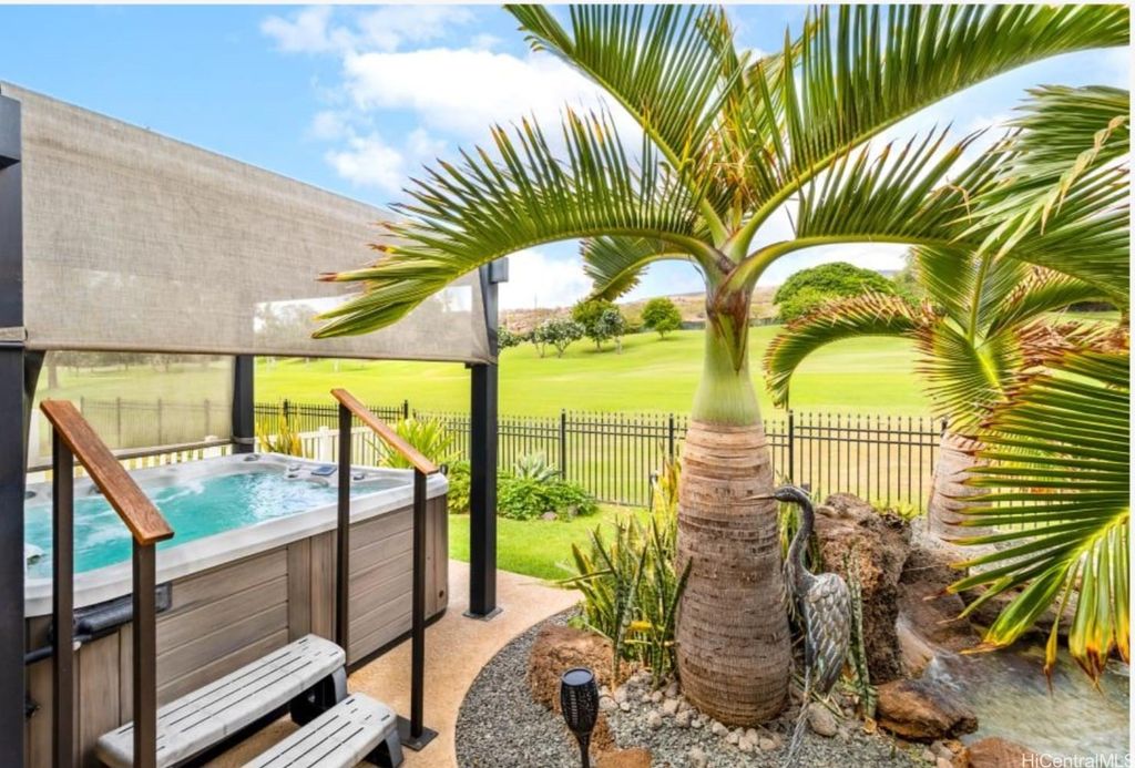 Truly a one-of-a-kind-work-of-art!! Fully furnished, located along the 14th fairway of Ko Olina Golf Course, this grand Estate is an exquisite single level 3BR/2.5BA home, fully renovated with refined, modern upgrades throughout. The amazing kitchen is a masterpiece with new stainless-steel appliances, custom cabinetry, and built-in hutch & display case. Beautiful quartzite slabs adorn the countertops, oversized island & backsplash. The beautifully landscaped backyard offers a spa-like retreat, complete w/a tranquil water feature & therapeutic 65-jet hot tub. The extended lanai, w/multiple seating areas, is ideal for dining, lounging, or entertaining. Bathrooms reflect the home's elevated design w/custom cabinetry & matching stone countertops. Plantation shutters & new double-pane windows throughout. New high-efficiency central air conditioner, 24 TESLA SOLAR PANELS /Two house batteries keep energy costs low. The stunning garage features an abundance of built-in cabinets & sleek race-inspired flooring. An opportunity like no other, this fully renovated, owner-occupied gem is perfect for anyone looking to immediately move in turn-key, and live the Ko Olina Life right now!