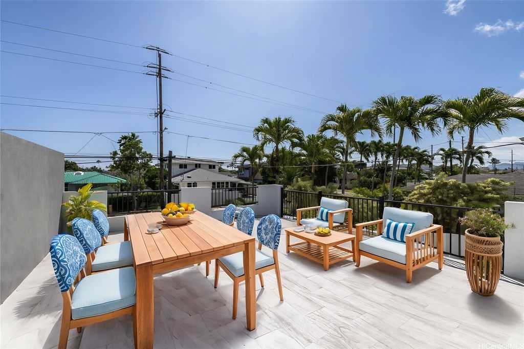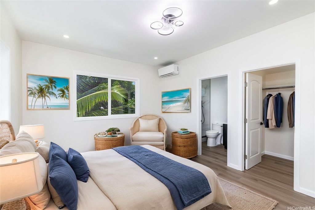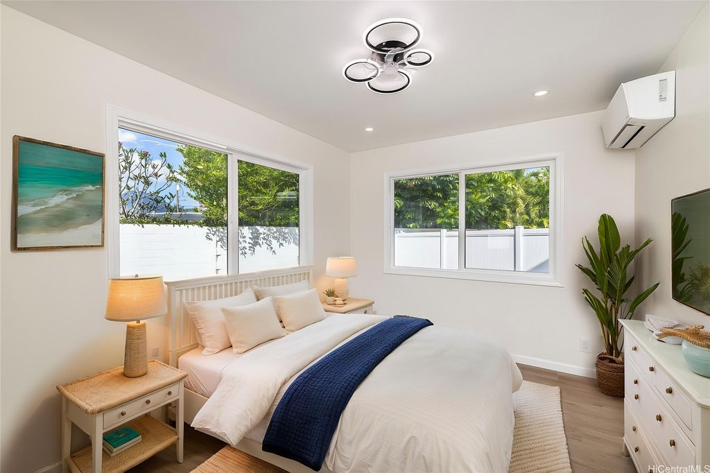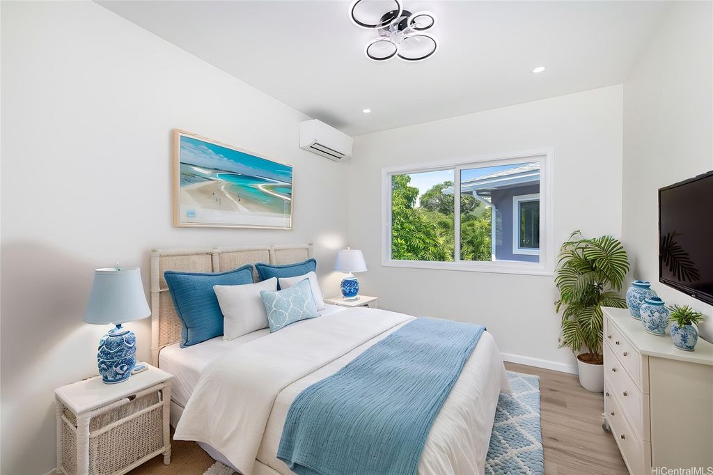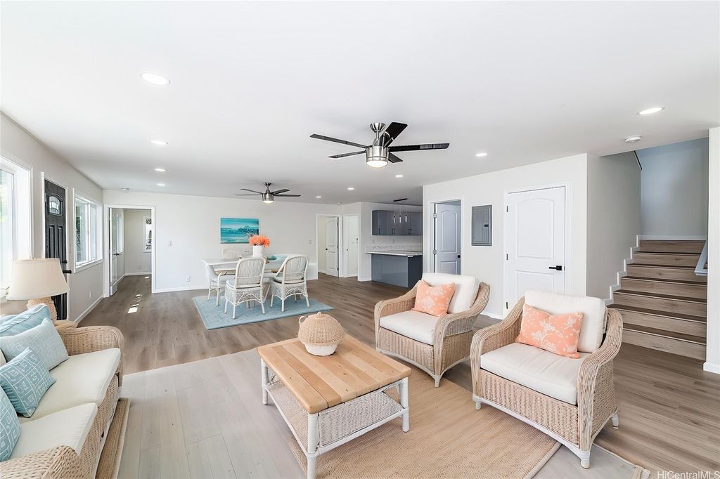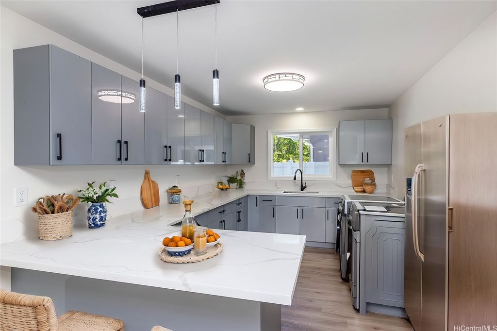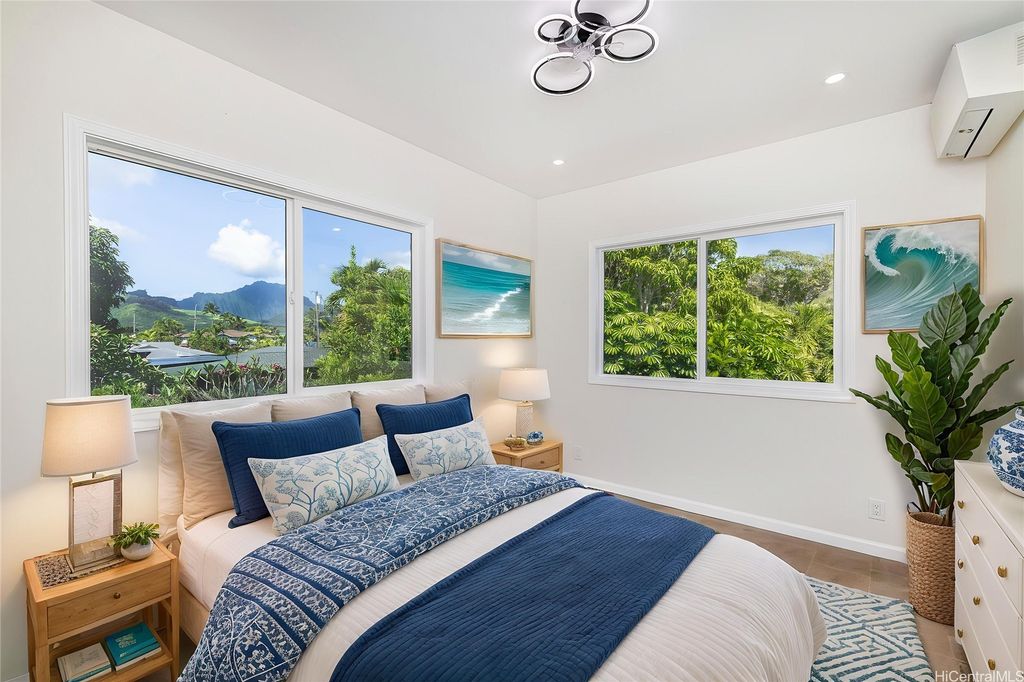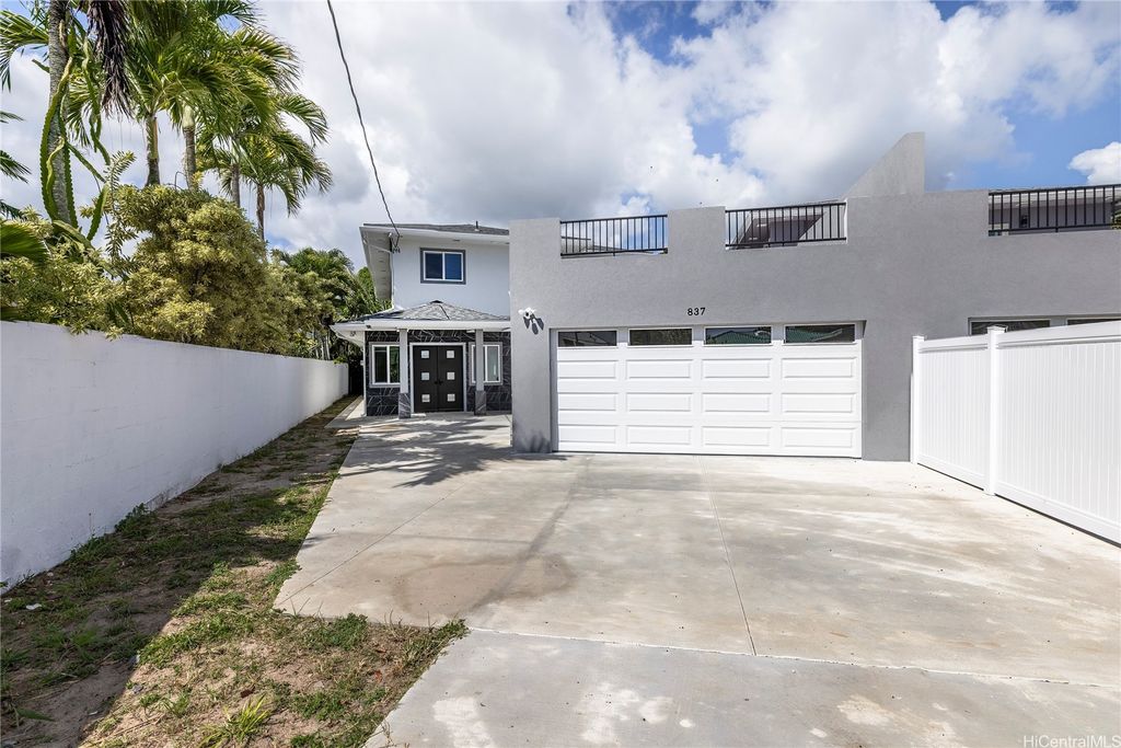 Where modern meets the Kailua lifestyle! This premier location is mere minutes to sandy beaches, surf spots, parks, farmers market, Kailua Town, restaurants, shopping, & more! Offering a wonderful opportunity for multi-generational living in the heart of Kailua! A modern entry flanked with a tiled façade greets you to vaulted ceilings with an expansive, open, and seamless floor plan. The upper level, offers three bedrooms, two bathrooms, and a outdoor deck - ideal for entertaining! The lower level offers three bedrooms, one bathroom, a spacious family room, and a expansive wet bar/laundry area. Stylish kitchen and bathrooms filled with contemporary touches highlighting Calcutta Stone countertops, soft-close cabinet drawers, stainless steel appliances, and contemporary shower. All bedrooms are equipped with split AC units, and the entire home has ceiling fans to cool you off. A wide driveway allows for added on-site parking and a 2-car garage with a convenient EV charging station. It's truly ready for you to move in and start enjoying right away. This is a must-see property!