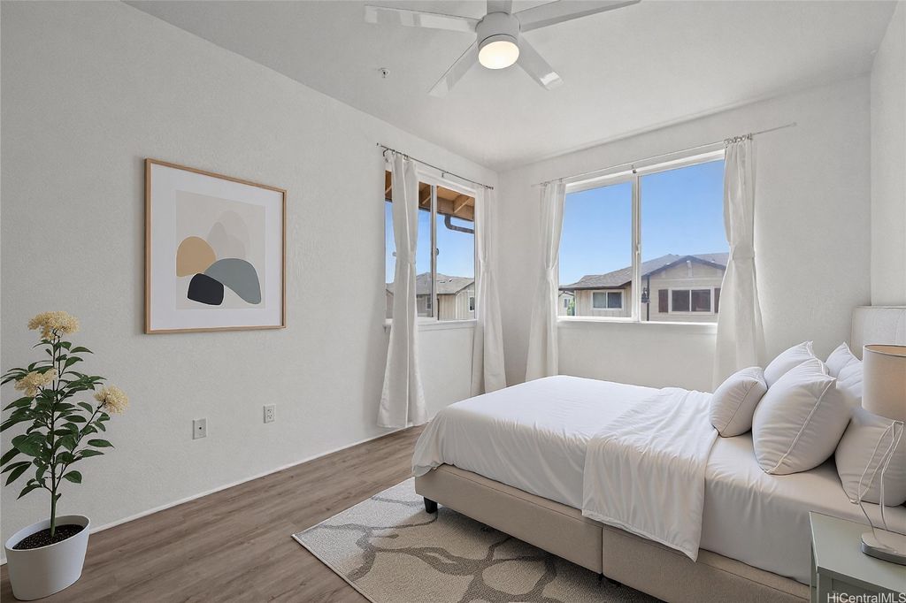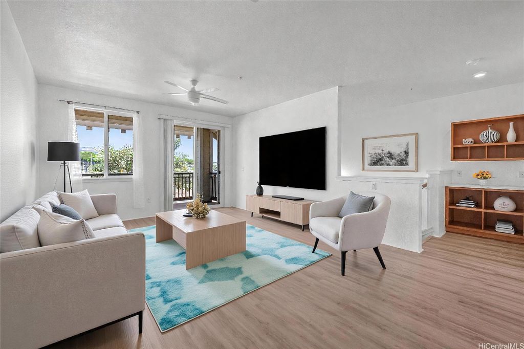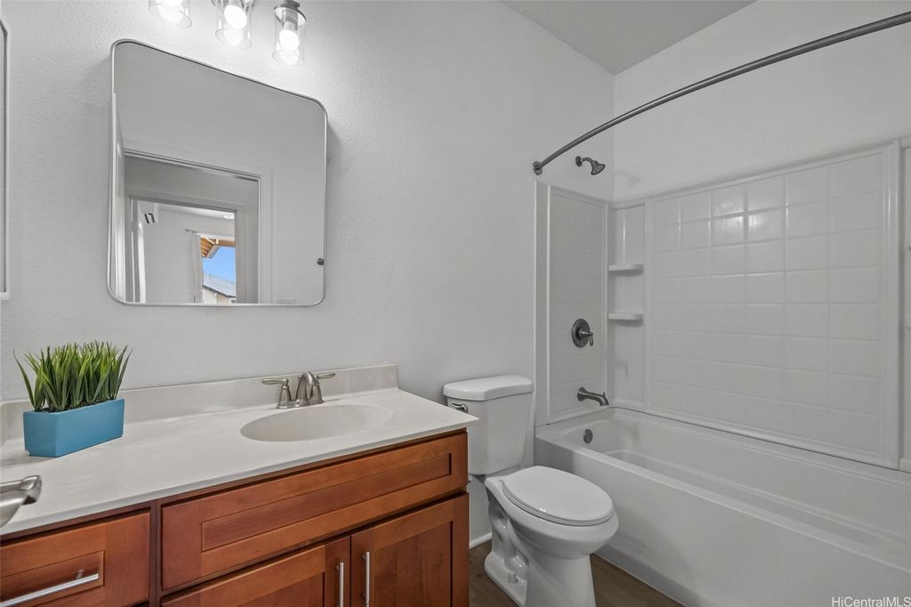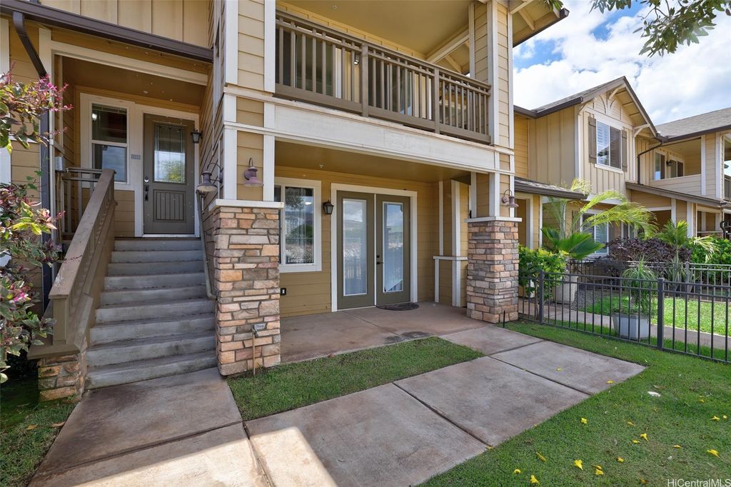 This is the largest unit with view in the community called Kahiku at Mehana. Conveniently located in heart of Kapolei. ADA bathroom on the ground level that is all in good condition and could conduct small business with a different access - "FLEX " unit. The main living space is on the 2nd level accompanied with modern kitchen, large living room and lanai with view. Price for a quick sale and Sell "as is" condition. This Community is well-maintained. This potential income property could yield approximately $3800-$4000 per month in rent according the previous history and fair rental market. The future land development in front of the balcony is supposed to have Commercial Mixed Use establishments according to the Urban Design Plan for Kapolei. ( Enclosed in Supplements as reference.)