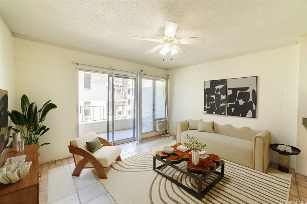 Welcome home to Makiki Wind Apartments! Here is your opportunity to own a spacious 1 bedroom x 1 bathroom unit in the heart of Makiki! This home is the perfect starter home or investment property. Enjoy an open + spacious lanai with built-in storage for added convenience. The unit includes a spacious + partially covered parking stall located right next to the main entrance for easy access. The building also offers secured key entry, an elevator, and community laundry area on the 1st floor. LOW monthly maintenance fees covers: cable TV, internet, water, sewer, and common area expenses. Property to be sold in AS-IS condition.
