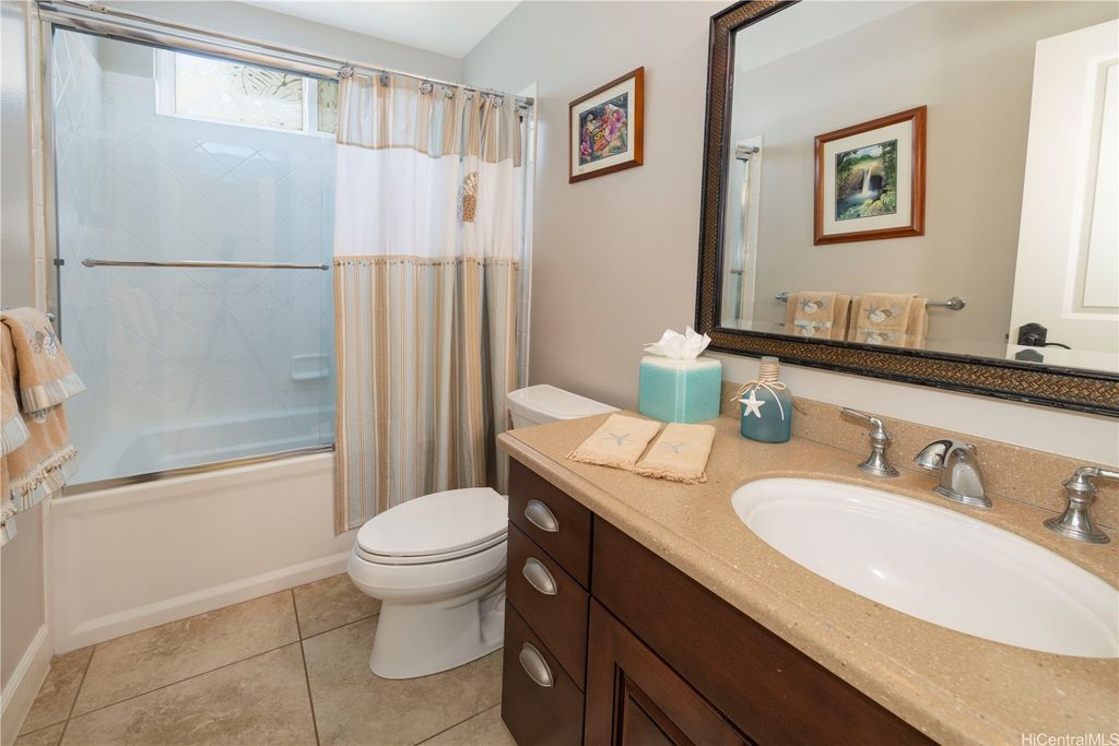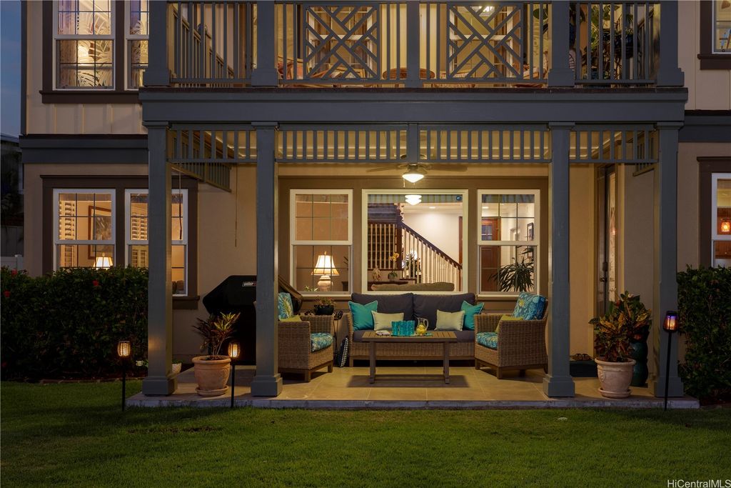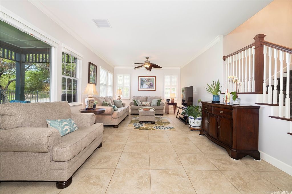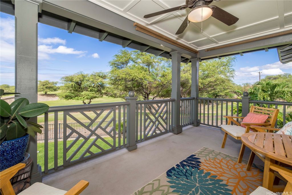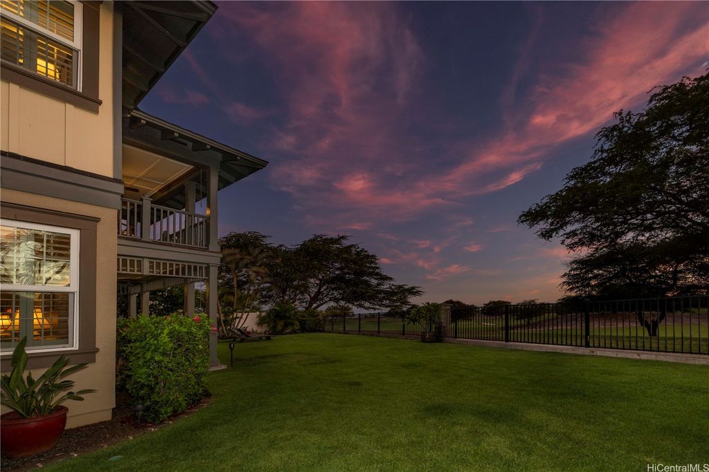 Fronting the Hoakalei Golf Course, this meticulous 4-bedroom home is refined island living! From the welcoming foyer, the French doors open to a bonus room"”ideal as a private office, reading retreat, or den"”along with a main-level bedroom & full bathroom, perfect for guests or multi-generational living. The modern kitchen has upgraded cabinetry, stainless steel appliances, granite counters, and a large island with additional seating. One of the home's most captivating features is the expansive yard"”a canvas to design a pool, tropical gardens, or an entertainer's paradise, this oversized outdoor retreat is the ultimate private oasis! Energy efficient w/24-panel owned, net-metered photovoltaic system, 2 solar hot water panels, a whole-home water softening system, and reverse osmosis drinking water as an added bonus. Located in an award winning resort community, residents enjoy HOA amenities including high-speed internet & cable, pool and spa, fitness center, tennis and pickleball courts, a dog park, and 3 playgrounds. Just moments away, you'll find beaches, shopping, dining, and the best of island living. This is more than a home, it's a lifestyle with golf course living!