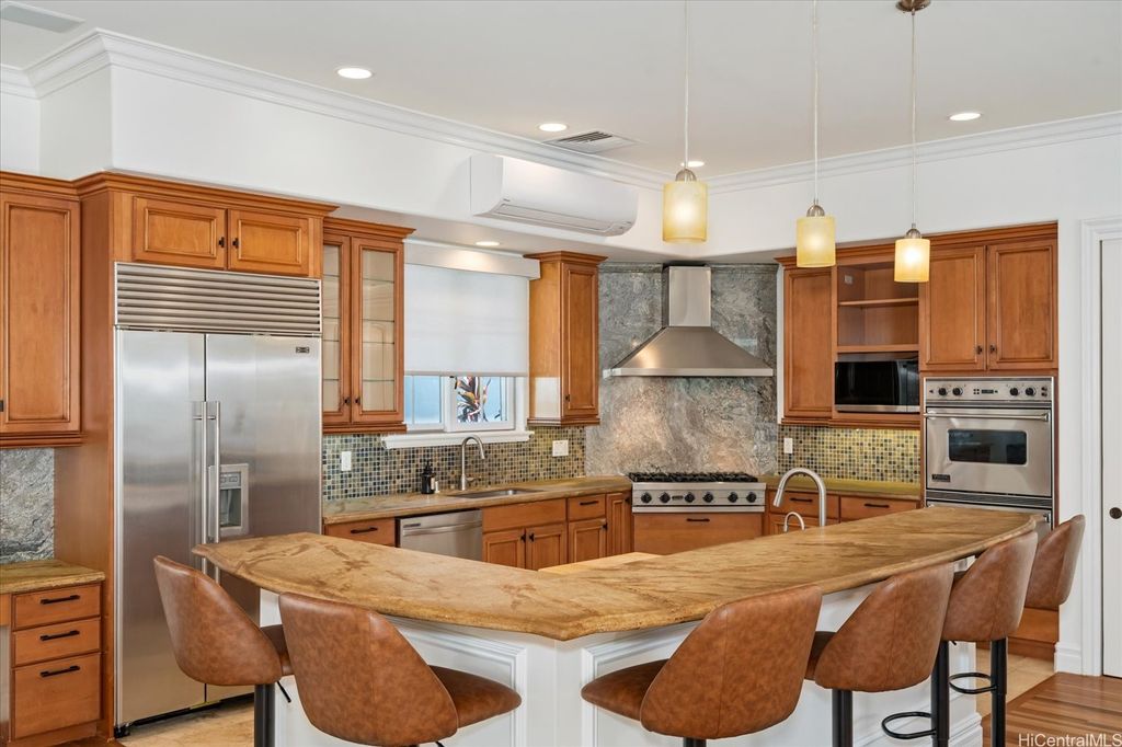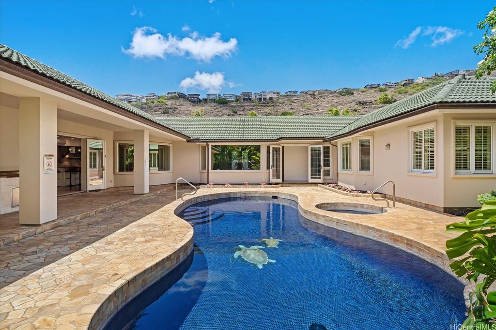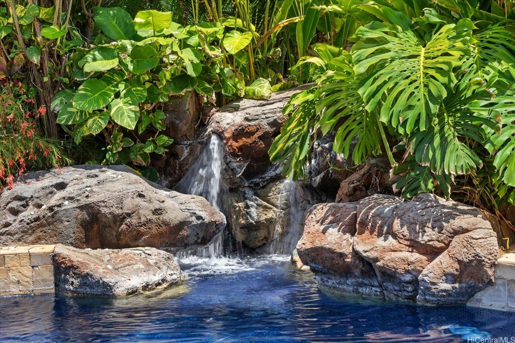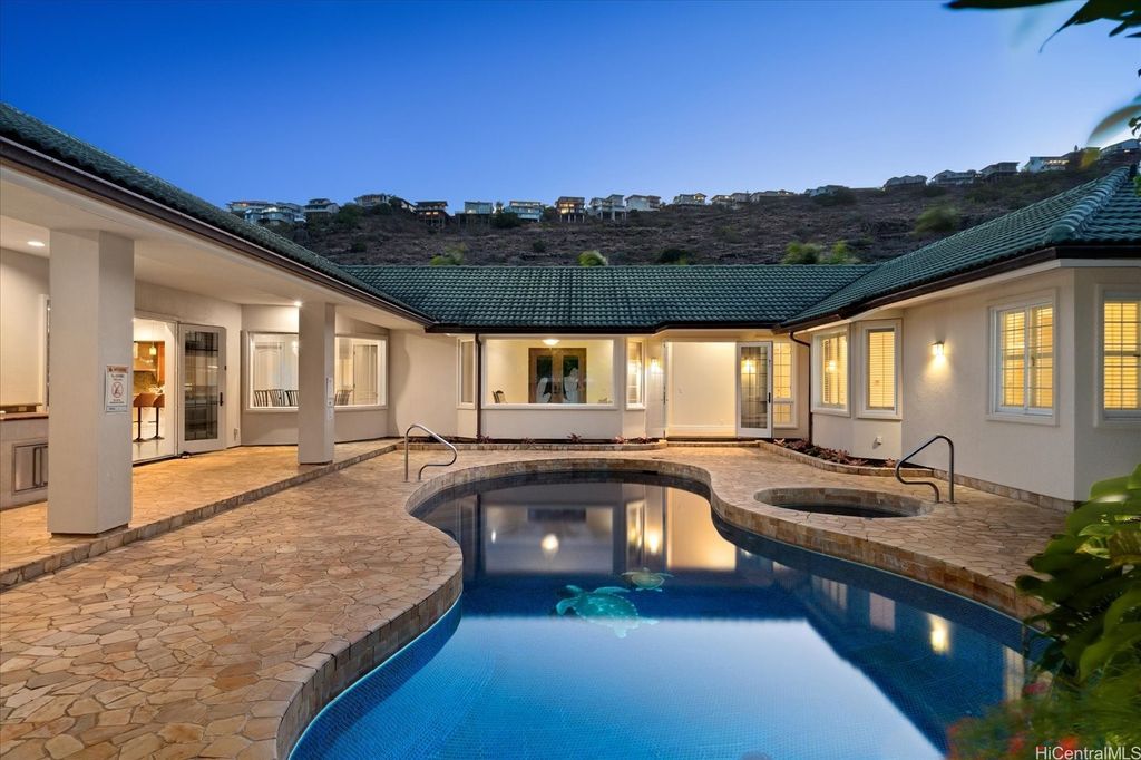 Experience the perfect blend of island elegance and modern comfort in this rarely available single-level custom home. The open layout with high ceilings flows into a chef's kitchen with Viking and Sub-Zero appliances"”perfect for casual meals or entertaining friends. The expansive primary suite offers relaxing views of the pool and garden, plus a spacious closet and spa-like bath. A second suite with its own entrance and bath adds flexibility for guests or a caretaker. Just outside is your own retreat with a lava rock waterfall, saltwater pool, and spa surrounded by tropical landscaping"”ideal for unwinding or weekend gatherings. Natural light fills the home, while central and split A/C keep it comfortable year-round. A two-car garage, full lava rock wall, tile roof, and 44-panel PV system add convenience and efficiency. Close to markets, restaurants, schools, beaches, parks and freeway access, this home blends elegance, comfort, and unmatched convenience.