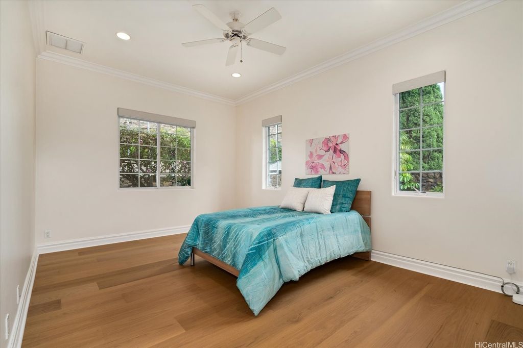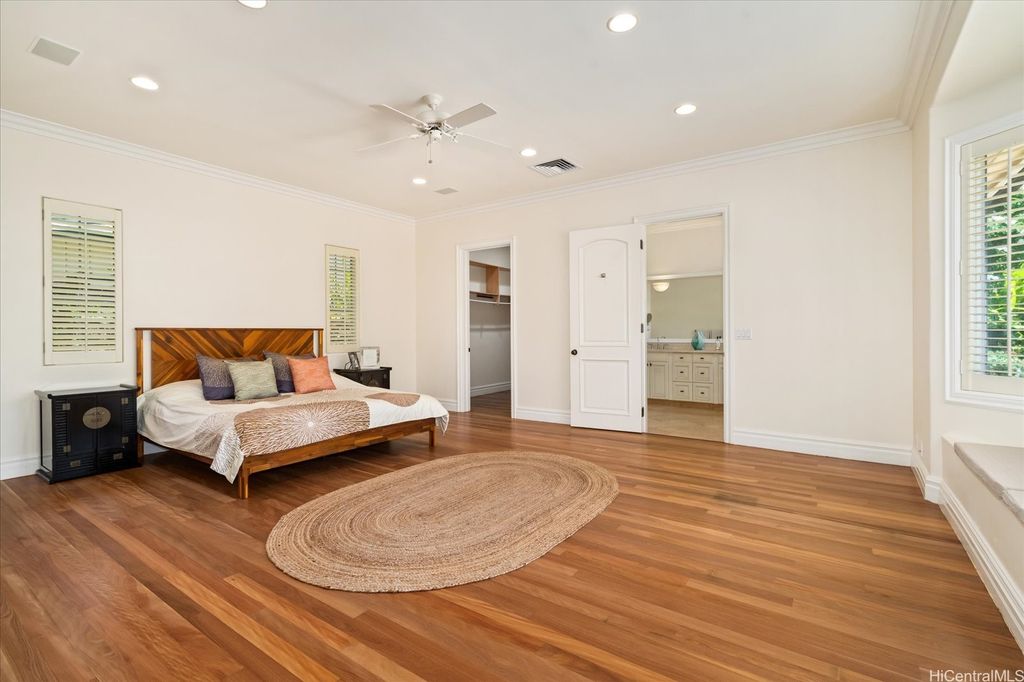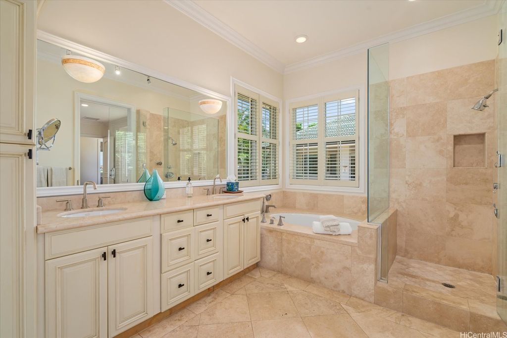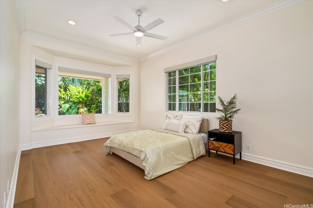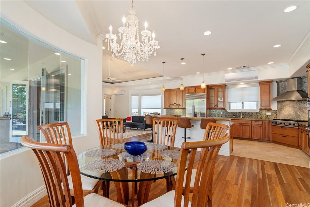 Experience the perfect blend of island elegance and modern comfort in this rarely available single-level custom home. The open layout with high ceilings flows into a chef's kitchen with Viking and Sub-Zero appliances"”perfect for casual meals or entertaining friends. The expansive primary suite offers relaxing views of the pool and garden, plus a spacious closet and spa-like bath. A second suite with its own entrance and bath adds flexibility for guests or a caretaker. Just outside is your own retreat with a lava rock waterfall, saltwater pool, and spa surrounded by tropical landscaping"”ideal for unwinding or weekend gatherings. Natural light fills the home, while central and split A/C keep it comfortable year-round. A two-car garage, full lava rock wall, tile roof, and 44-panel PV system add convenience and efficiency. Close to markets, restaurants, schools, beaches, parks and freeway access, this home blends elegance, comfort, and unmatched convenience.