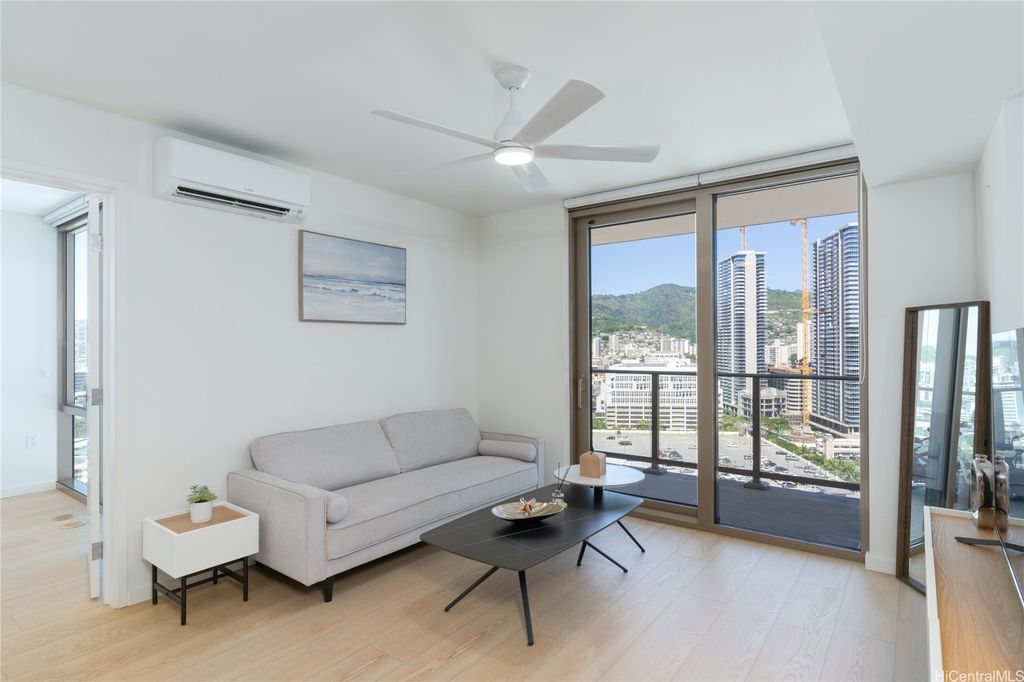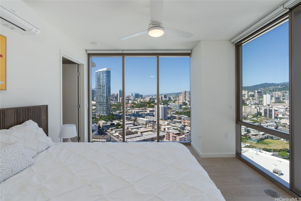 Conveniently located, newer and contemporary Sky Ala Moana West is located in the center of Ala Moana area close to Ala Moana Beach Park, Ala Moana Shopping Center, Waikiki. This beautiful, fully furnished 2-bedroom residence offers upgraded flooring and wrap around window in the primary bedroom where you'll wake up to breathtaking mountain views and unwind with dazzling city lights at night. Enjoy resort-style amenities, including two spas, poolside cabanas, a private dining room, BBQ pavilions, and a vibrant outdoor space with a playground. Residents also have access to a wonderful spa and sauna at the adjacent Renaissance Residence hotel. Food & beverage can be conveniently purchased at poolside. This fully furnished residence is equipped with kitchenware, silverware, pots/pans, bedding and towels. It has everything you need! Don't miss this wonderful opportunity!