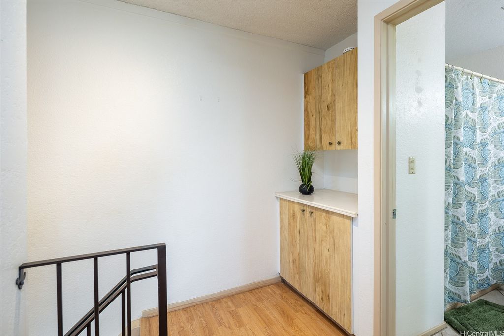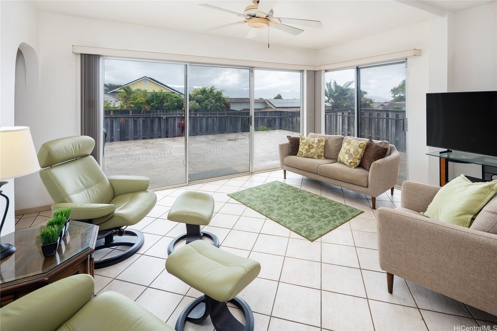 Move-in ready and in excellent condition, this rarely available 3-bedroom, 1.5-bath townhouse at Liolio in Waipio Gentry stands out with a valuable permitted extension. Originally 1,094 sq. ft., the home now offers approximately 1,334 sq. ft. of living space (to be verified in appraisal), a rare bonus that expands how you can enjoy and use your home. The extension also allows for the washer and dryer to be located inside the house, neatly tucked behind closet doors. Step outside to the upgraded lanai, about 700 sq. ft., with a retractable awning. Once a sloping, unusable area, it has been raised and leveled to create a flat, functional outdoor space where you can relax or entertain while taking in panoramic mountain views. With its elevated position above a peaceful walking/jogging path and no homes directly behind, the setting offers a welcome sense of privacy. Fresh interior paint brightens the home, and parking is convenient with one covered stall and one open stall located nearby. Liolio is a clean, well-kept community close to Costco, Waikele Shopping Center, and freeway access. An outstanding opportunity in a highly desirable neighborhood.