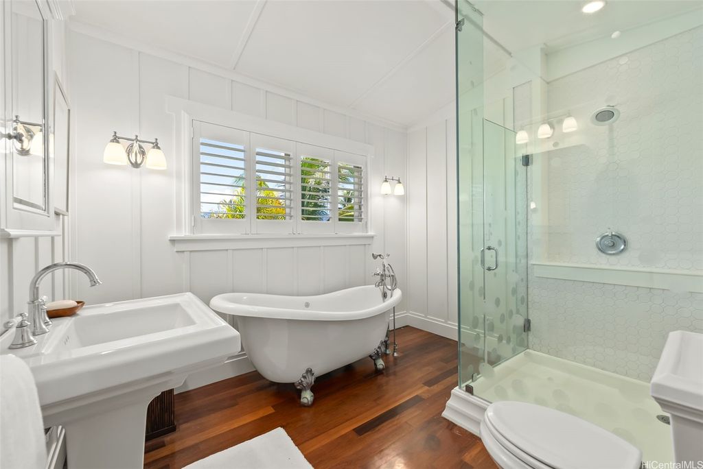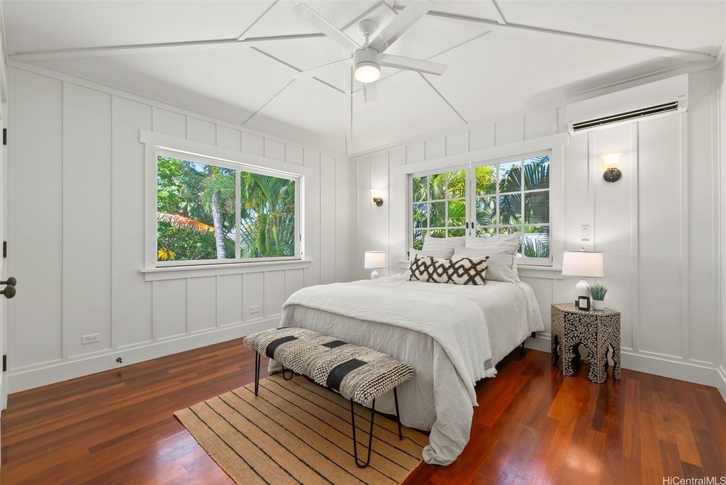 Situated only 4 homes off of Kailua Beach on a private lane this exquisite sanctuary awaits, where coastal charm meets elegant design! This custom beachside residence is a testament to unique architectural creativity, offering the perfect embodiment of the beach lifestyle. Begin your journey on a stunning wrap-around Ipe deck, leading you to an inviting interior adorned with luxurious Brazilian chestnut floors and meticulously crafted African Mahogany cabinetry. The home's design beautifully integrates with its lush surroundings, enhanced by expansive pocket windows that draw the outdoor beauty inside, creating a seamless blend of nature and comfort. The meticulously landscaped gardens further enrich the outdoor living experience, providing a tranquil escape that's ideal for both relaxation and everyday life. This home not only promises supreme comfort and style but also an unparalleled coastal living experience.