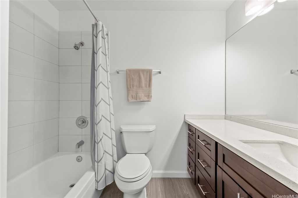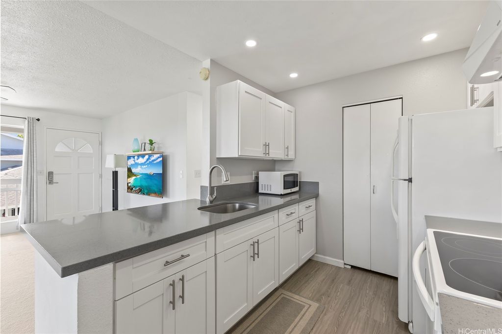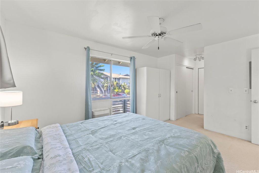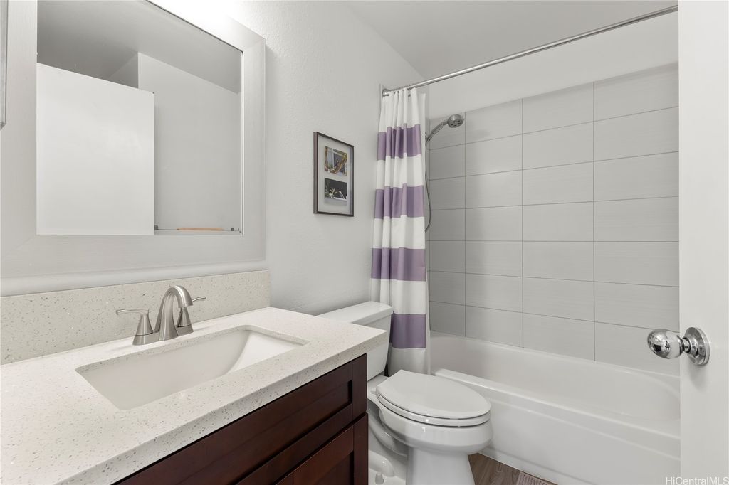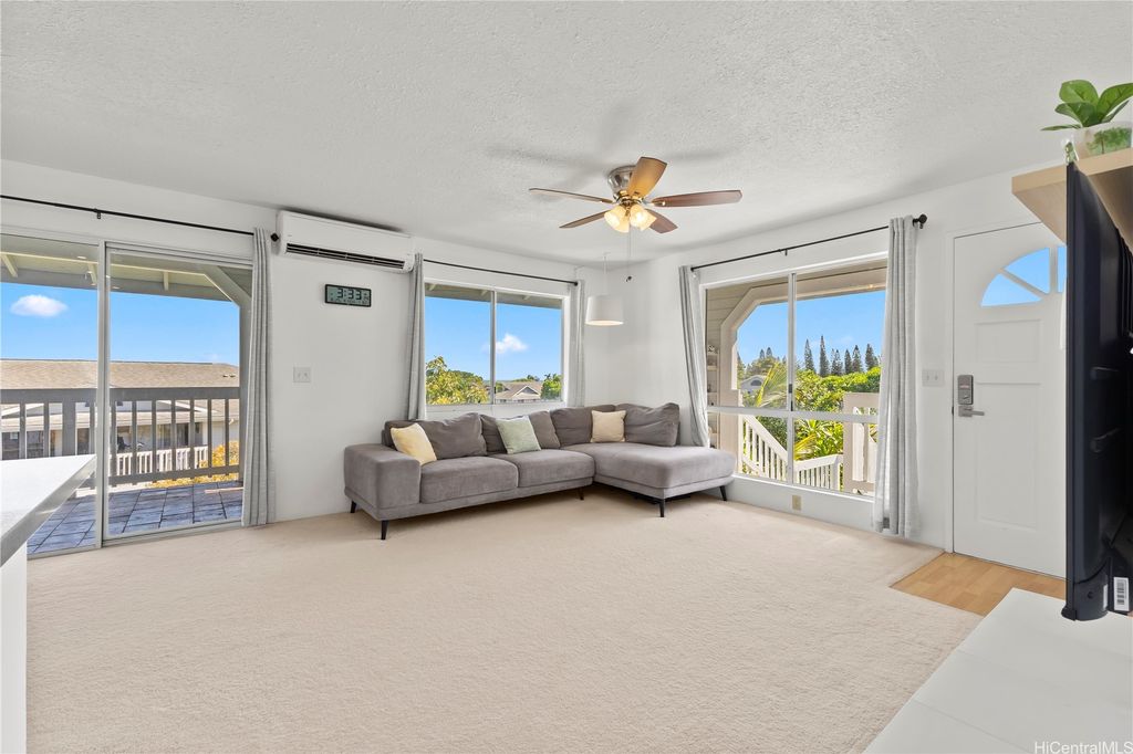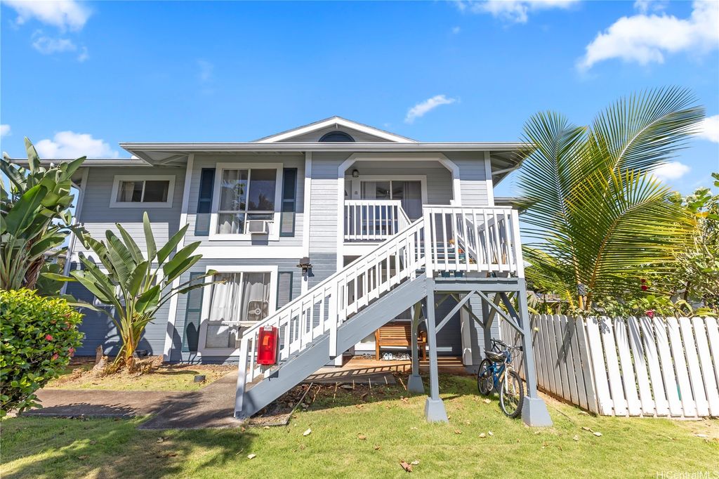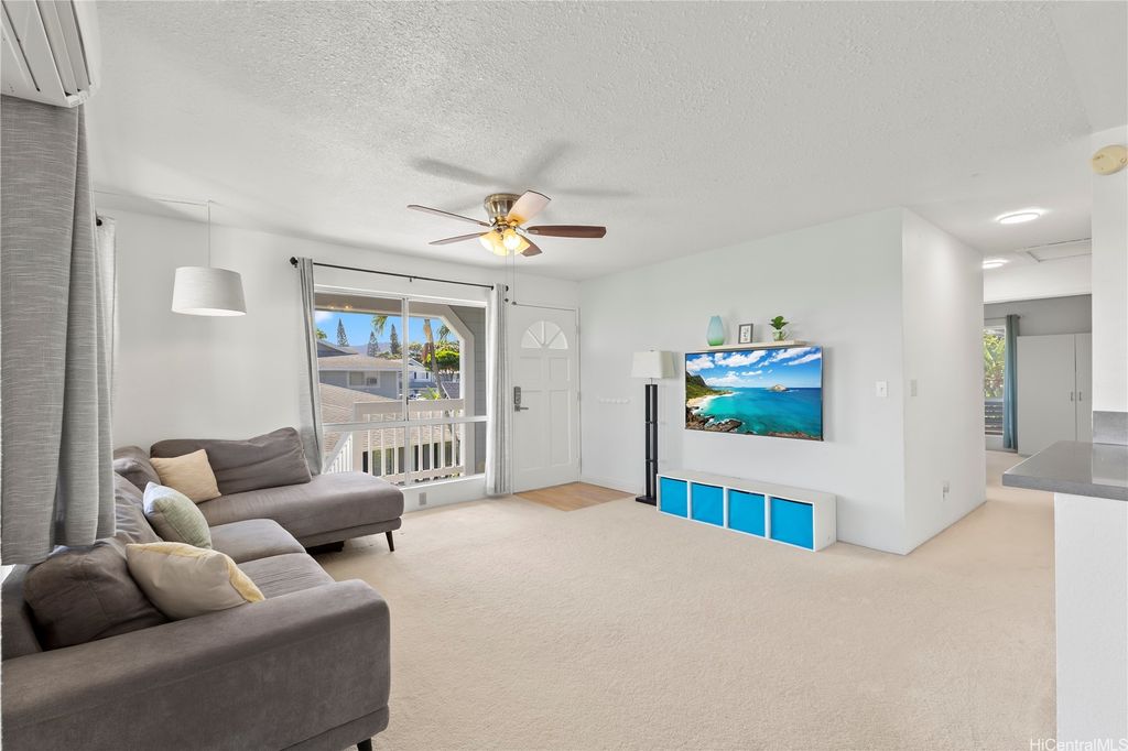Desirable corner 2-bedroom 2-bath residence with partial ocean views in The Fairway Village at Waikele. This spacious unit of over 850 interior square feet and a 90+ square foot covered lanai has 2 assigned parking stalls. Features an updated kitchen with recessed lighting, quartz counter tops, hardwood cabinetry, and luxury vinyl flooring. The two baths provide modern tile surrounds, updated vanities, luxury vinyl flooring, lighting and new fixtures. A split AC in the living room and window ACs in the bedrooms will help you stay cool in the summer months. Convenient storage in the kitchen pantry closet and on your lanai. This pet-friendly and well-managed community has ample guest parking, a car wash, and access to the recreation center for gatherings and parties. Minutes to the Waikele Golf Course, Patsy Mink Community Park, Waikele Premium Outlets, Costco, Starbucks, Safeway, Foodland, Lowe's, and many other shops and restaurants.