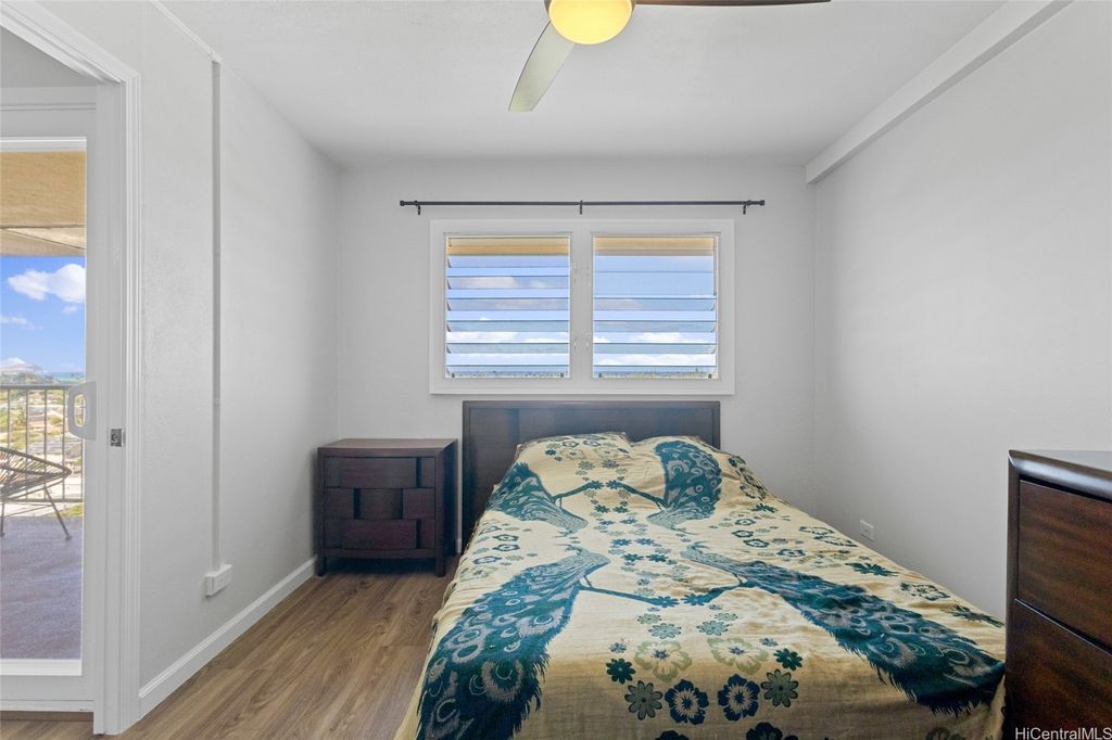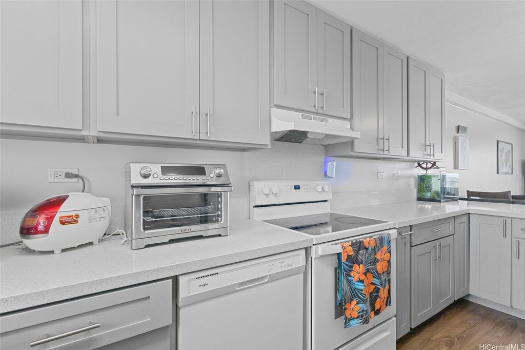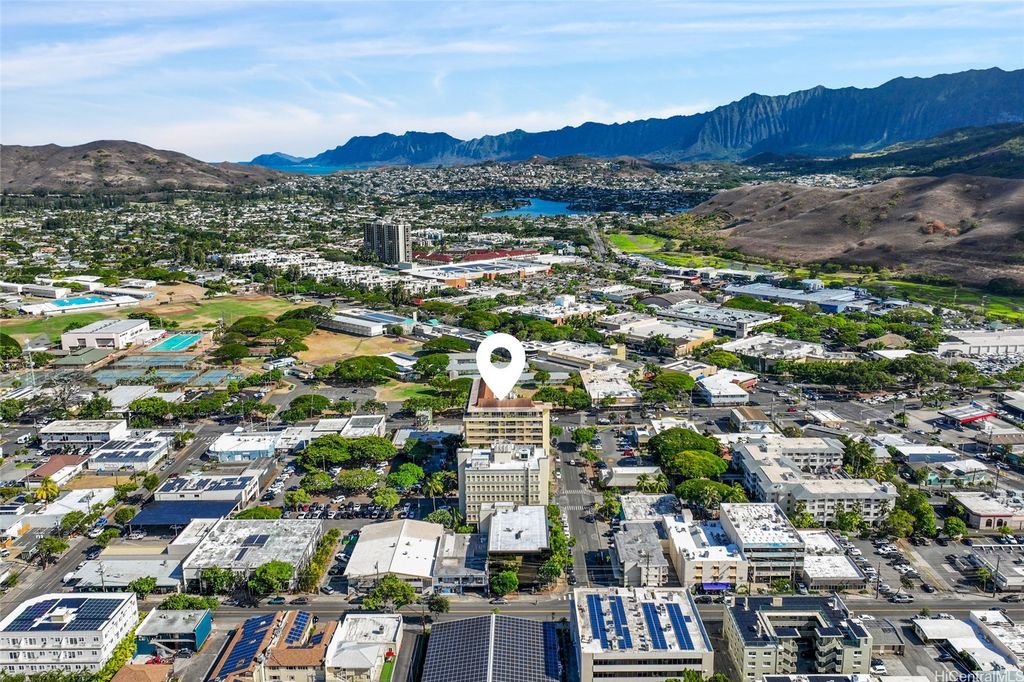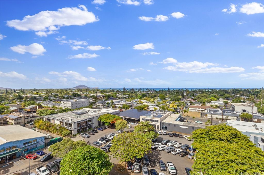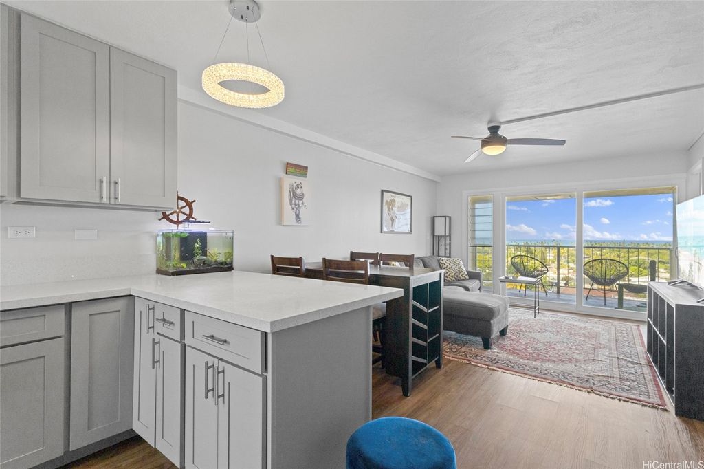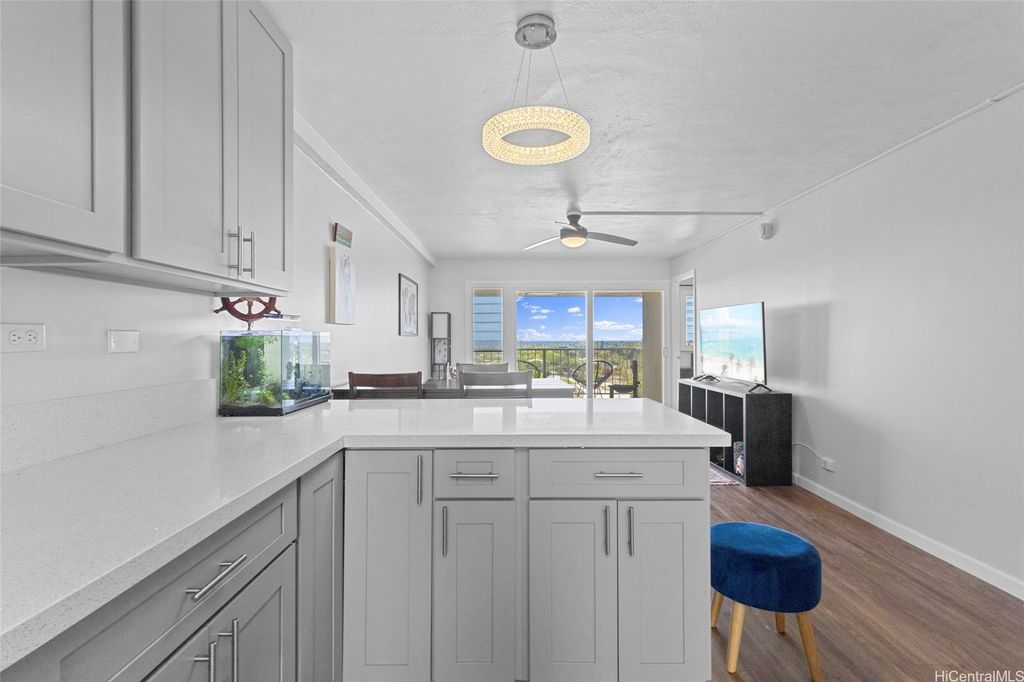 Stunningly updated high-floor corner unit at Meridian East, offering sweeping views of Kailua Bay from an expansive lanai. This 2-bedroom home boasts modern finishes, including quartz countertops, rich hardwood cabinetry, updated appliances, and luxury vinyl and ceramic tile flooring throughout. The open-concept living space extends seamlessly to the lanai, where you can enjoy the sights of Kailua town with the ocean as your backdrop. New vinyl windows and ceiling fans enhance airflow and natural light. The kitchen features bar seating andopens up to the main living area"”perfect for entertaining. Enjoy relaxing by the pool or take a quick trip to the world-renowned Kailua Beach. Includes one covered parking space in a secure, pet-friendly building surrounded by popular shops and dining options. Take advantage of a VA assumable loan at just 2.5%! An incredible opportunity in today's market.