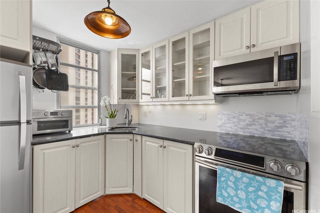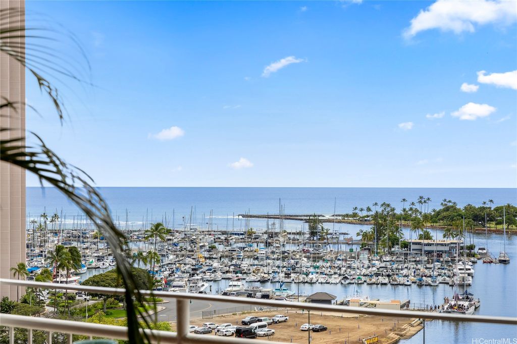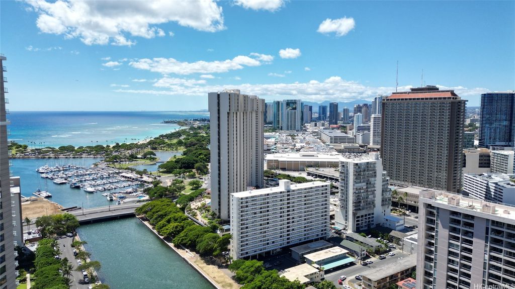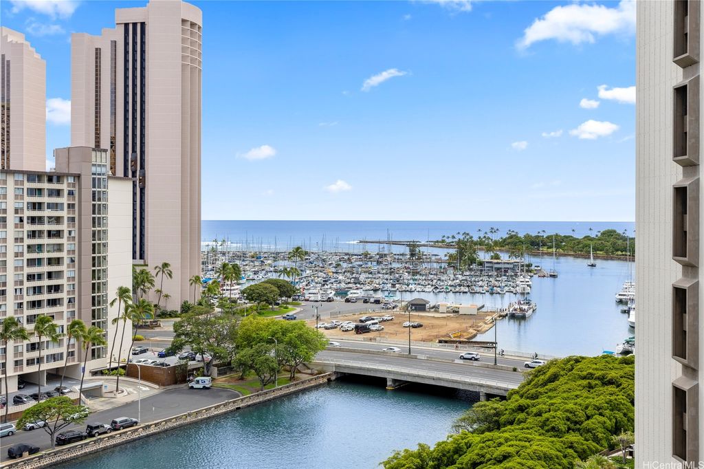 PRIME PRIME LOCATION between Waikiki & Ala Moana neighborhood! One block to Shopping Mall and Beach! Spacious, upgraded unit with Fabulous Ala Wai Canal & Yacht Harbor/Ocean Views! 2 Bedrooms converted to Large Spacious 1 Bedroom with 2 closets, laminate flooring, full size washer/dryer. Enjoy beautiful yacht harbor views in this breezy unit from entry and lanai doors! Owner has private storage locker on same floor. Other Fee: $328 parking