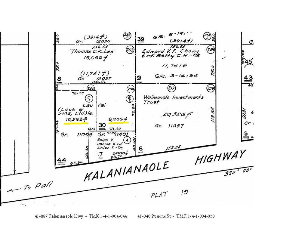 New Price. Prime highway front B1 zoned property directly on Kalanianaole Hwy & adjacent vacant lot zoned B1 in Waimanalo . Currently tenant occupied by Bobby's Market. Rebuild or renovate to maximize the potential. Great opportunity for investor or owner operator. Building has existing business downstairs and residential space upstairs. Structure is in poor condition and property is to be sold AS IS. To be sold together with adjacent vacant lot located at 41-040 Puuone St. TMK 1-4-1-4-30-0000 - Lot size 8206sq ft. Assessed land value $662,000 and property tax $684/mo for vacant lot. Combined lot sizes of 18,769 sq ft. Listed price is for both properties. Do not disturb business or employees. Buyer to do own due diligence. Tenant (Bobby's) vacating 12/31/25. Unknown at this time what fixtures, furnishings and equipment will be left by tenant.