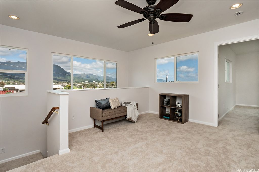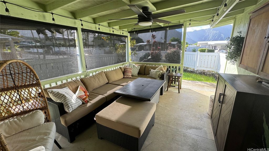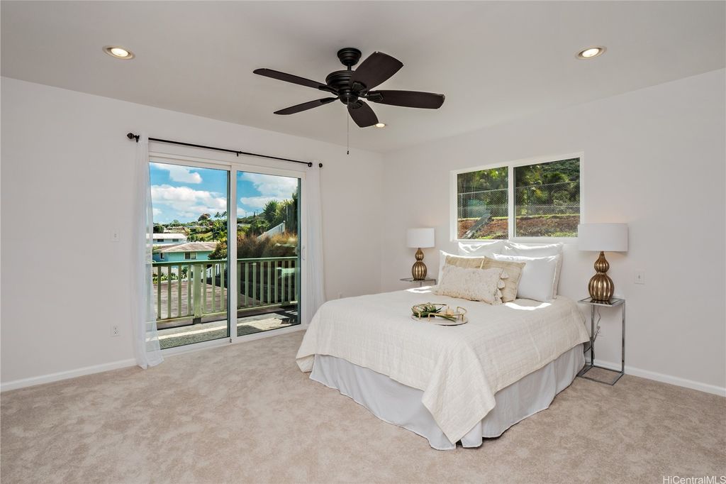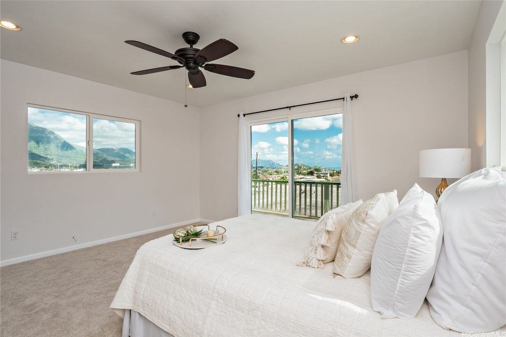 ****Showings begin Sunday the 7th for open-house 2:00pm-5:00pm*** Welcome to the Windward side! Wake up in your own second-floor main suite and enjoy a cup of coffee on your private lanai while taking in views of the spectacular Ko'olau mountain range. Open your large windows and feel the cool windward breeze flow through the home. Entertain family and friends with ease in the open living spaces and covered patio. Need extra space? To the right side of the home, with optional private lock-off with its own separate entrance offers flexibility for multigenerational living, hosting guests, or generating rental income. The owners have added gutters and 45 solar panels, plus 2 Tesla batteries with a monthly payment of $304.02