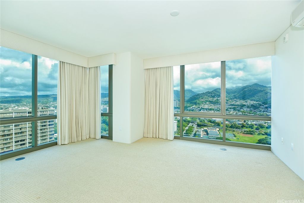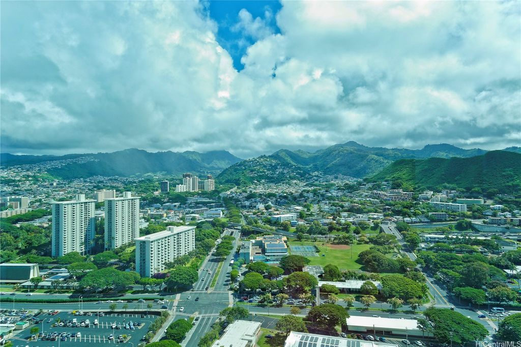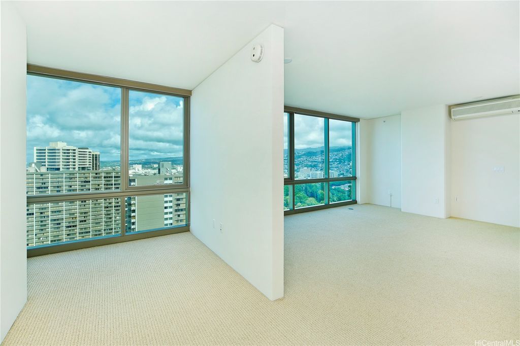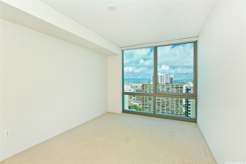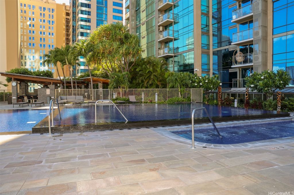 BACK ON THE MARKET. Downtown Penthouse living at its finest. Just minutes from downtown, restaurants, shopping and entertainment. This corner-end unit with floor to ceiling windows offers panoramic views of the city, ocean, Waianae mountains, Punchbowl and the Koolaus. The spacious 1,268 sq. ft. unit provides open concept living with a den area, walk-in closet and much more. Modern chef's kitchen with Viking appliances and a wine refrigerator! Split A//C in every room. Luxury resort-like amenities include a movie theater, infinity pool, jacuzzi, fully equipped fitness center, BBQ cabanas, yoga and music rooms, dog park, playground and party room. Large storage locker in garage. Photos were taken when the unit was vacant.