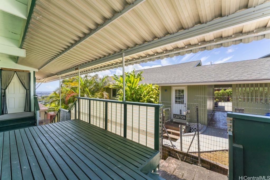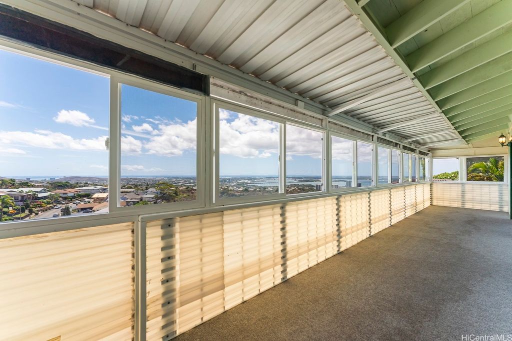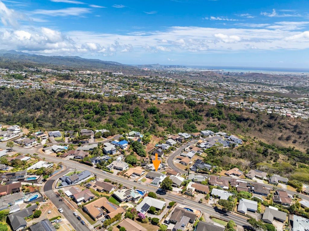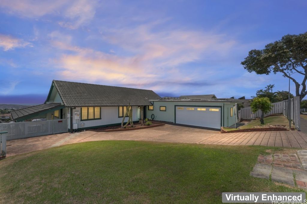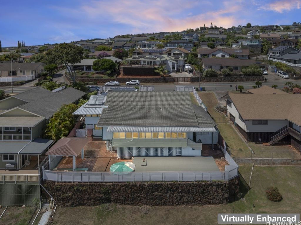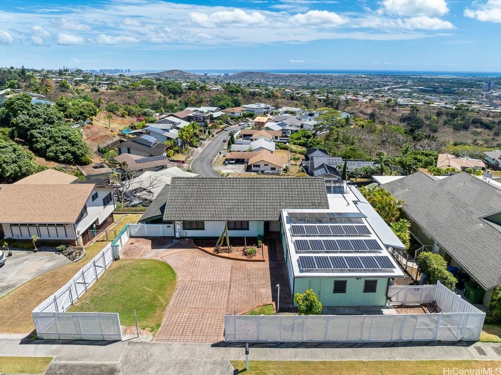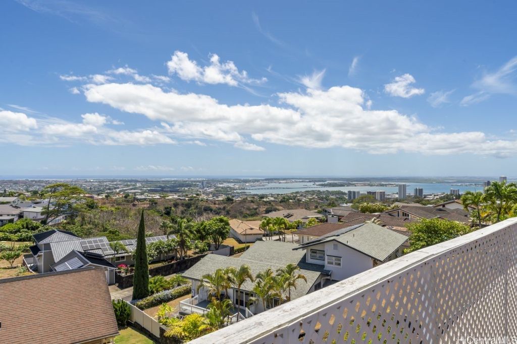 Panoramic Ocean Views with beautiful sunsets. Move in condition home in Pearl City/Aiea with 5 Bedrooms & 3 Baths upstairs with new shower heads & Double sink with new faucets. All Screens and frames replaced with new ones. Downstairs 1 bedroom,1 Bath in Law suite with a Kitchen which has a separate entrance and also can be a rental for income. New electric sub panel added 2005 for downstairs area. Roof is tile. Large, enclosed work area plus under the home large storage area. Pool and hot tub covered up because they had cracks. Newly Painted. 26 PV Panels owned-Halekale & Hawaii Energy Connection.New electric water Heater .Underground electrical.