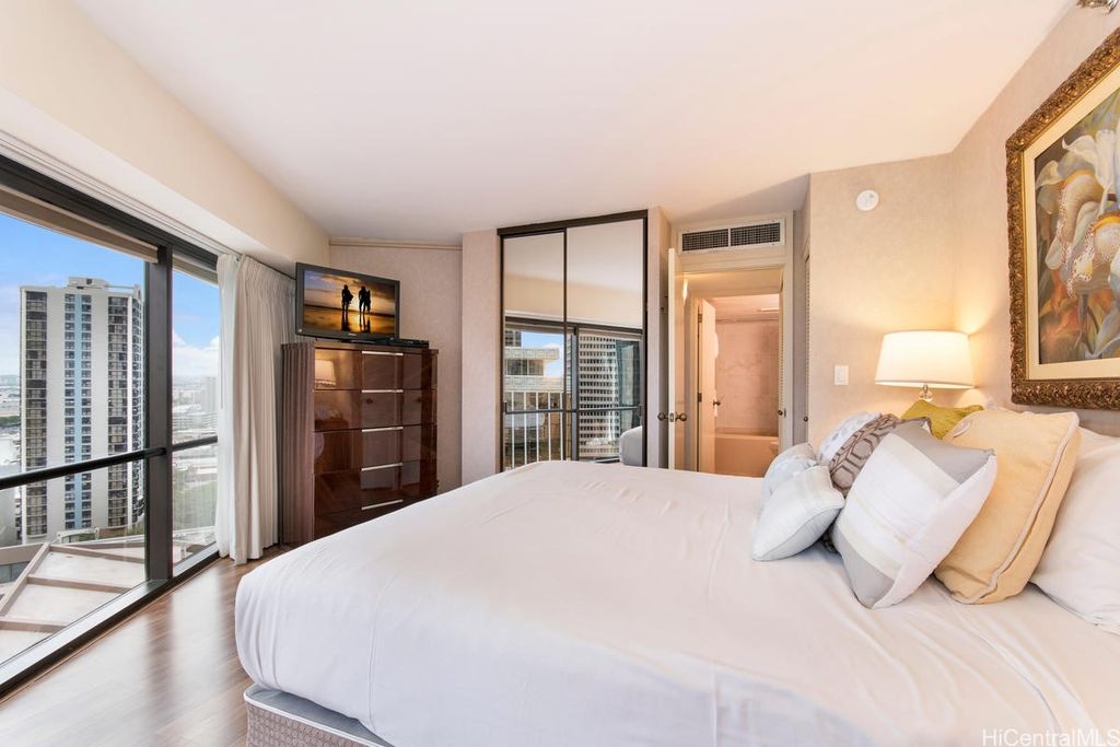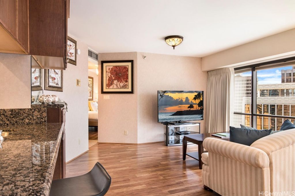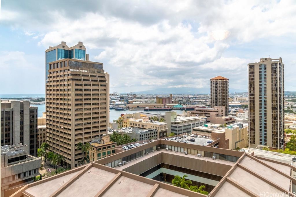 THE ONLY LEGAL SHORT-TERM DAILY RENTAL CONDO-HOTEL in the heart of the downtown Honolulu district. This tower suite largest 1-bedroom/1-bath floorplan offers a separate foyer entrance, floor-to-ceiling glass windows, upgraded full kitchen and bath, washer/dryer, central AC, and comes fully furnished including 1 assigned covered parking stall. Enjoy the high floor views of the Honolulu harbor, coastline and the brilliant colors of city lights. Great flexible mix use as rental and/or enjoy as a vacation or primary home and/or simply as an office living suite. Executive Centre is a reputable mixed use condo-hotel/office building conveniently located in short distances to offices, Hawaii Pacific University, eateries, art galleries, night market festivals, historic Chinatown, medical facilities, shopping centers, bus-lines, freeway access & many more essentials of the Honolulu's Downtown district. Maintenance fee includes cable TV, internet, (hot) water, sewer, common area expenses and capital reserves.
