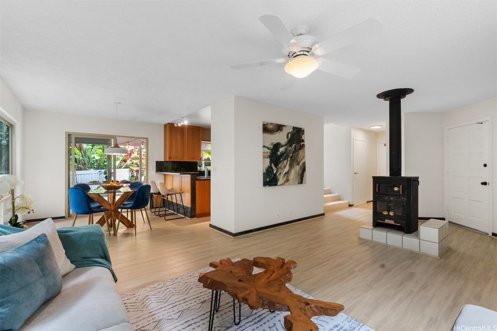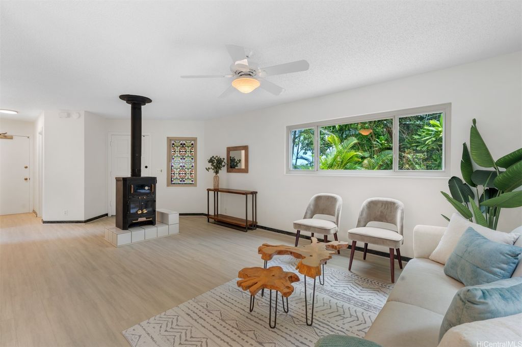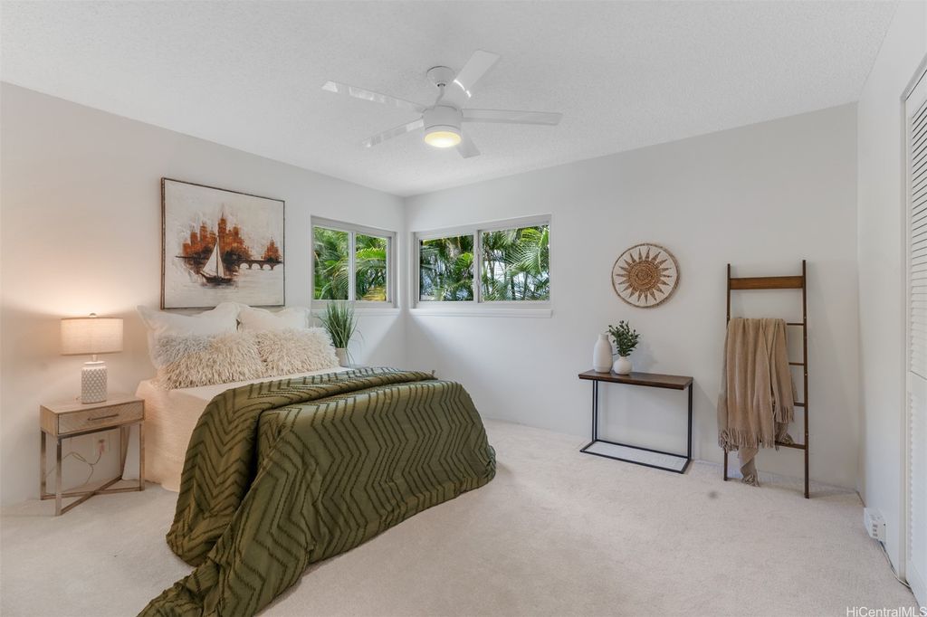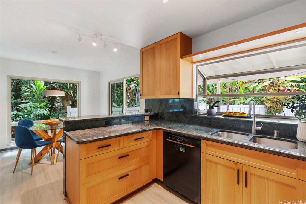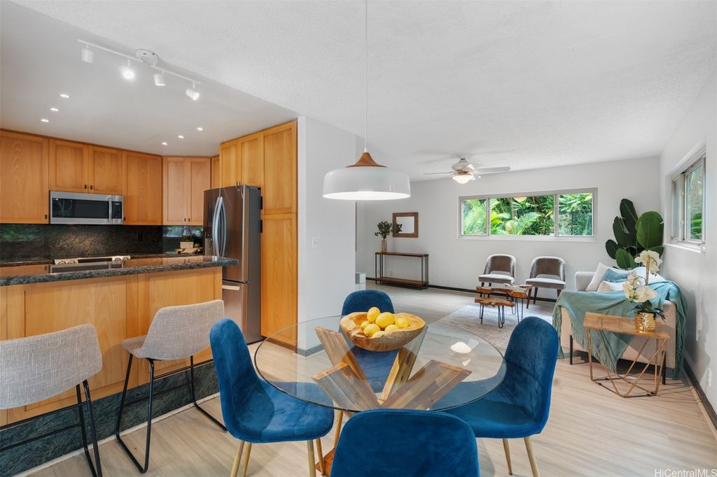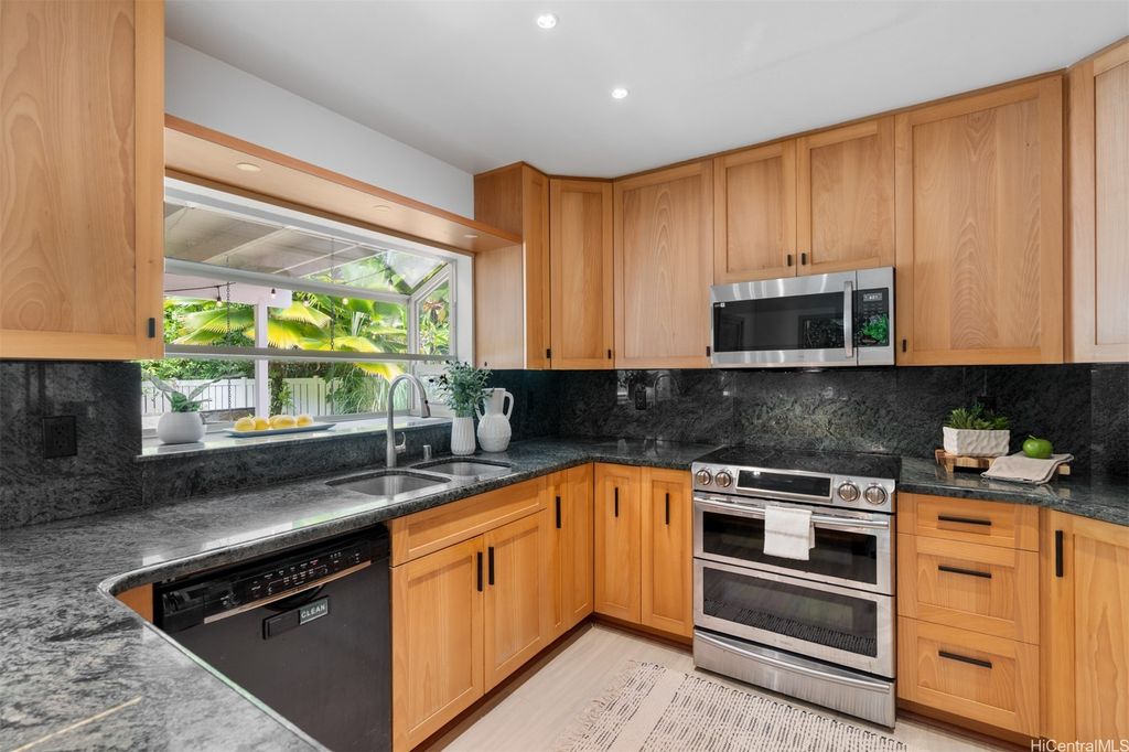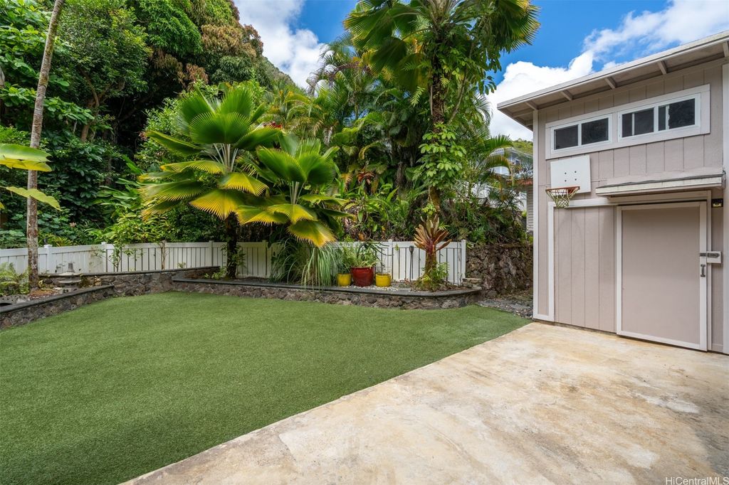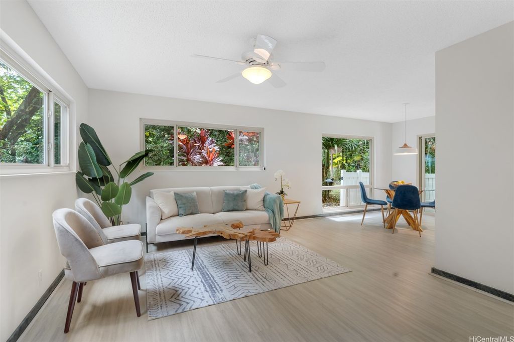 Welcome to your private escape on the Windward side. Nestled in a lush, tropical setting, this thoughtfully updated 3-bedroom, 2.5-bath residence offers the perfect blend of comfort and natural beauty. In a neighborhood surrounded by majestic Koolau mountain views, this home provides a tranquil oasis just minutes from H-3 and an abundance of shopping, restaurants and theaters in Windward Mall. Step inside to a light-filled, open-concept layout featuring fresh interior paint, new carpet upstairs. The inviting living area flows seamlessly into the dining space and updated kitchen, complete with granite countertops and bar seating. Large sliding doors open to a lush, tropical backyard with no back neighbors for added privacy. This home is ideal for relaxing, entertaining, or simply enjoying the peaceful sounds of nature and the stream that flows from the preservation area. Enjoy the serenity of Windward Oahu in a move-in-ready home that captures the essence of island living. Please make sure to check out the video!