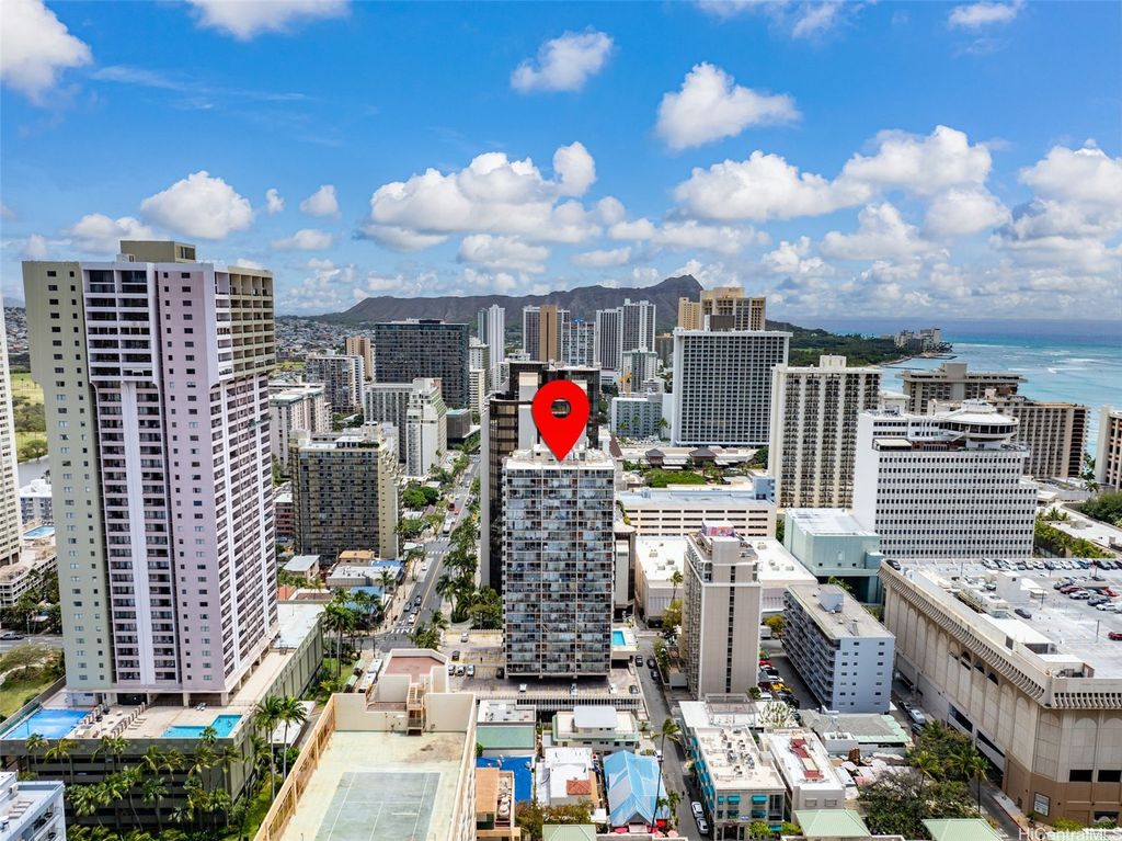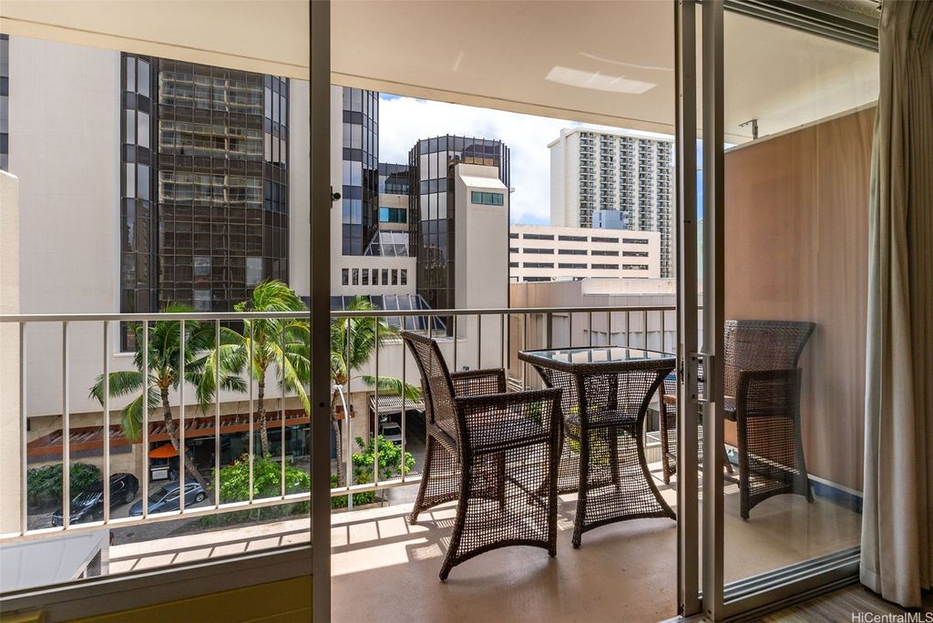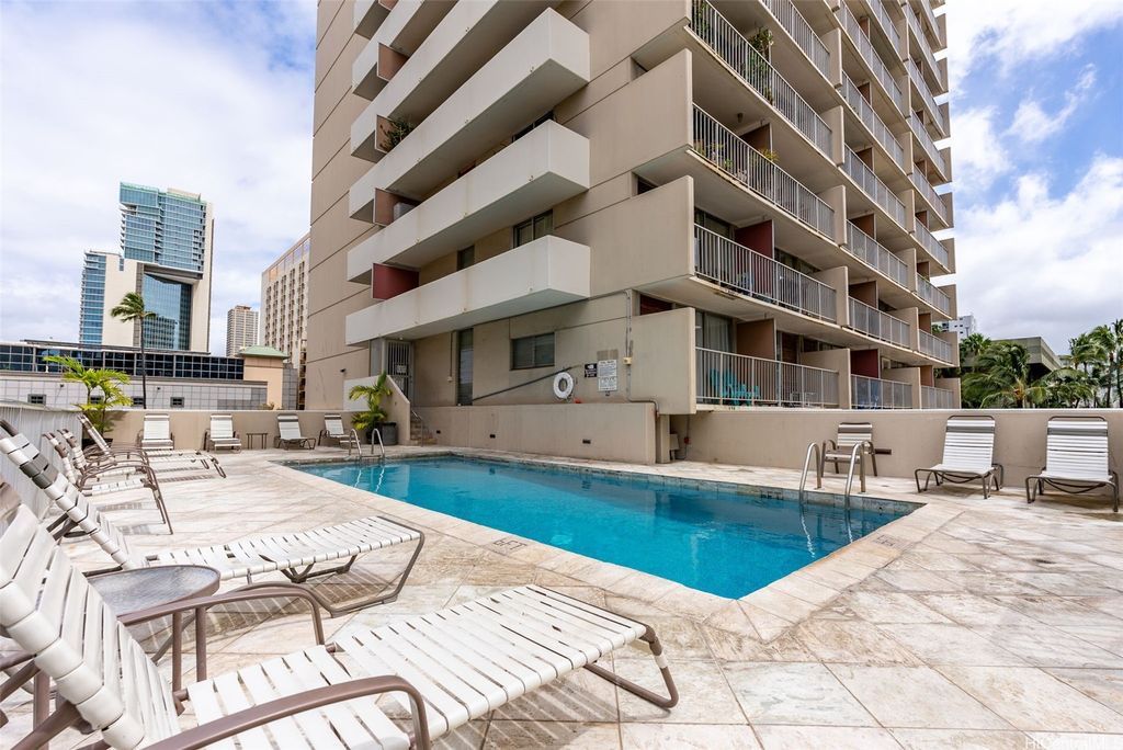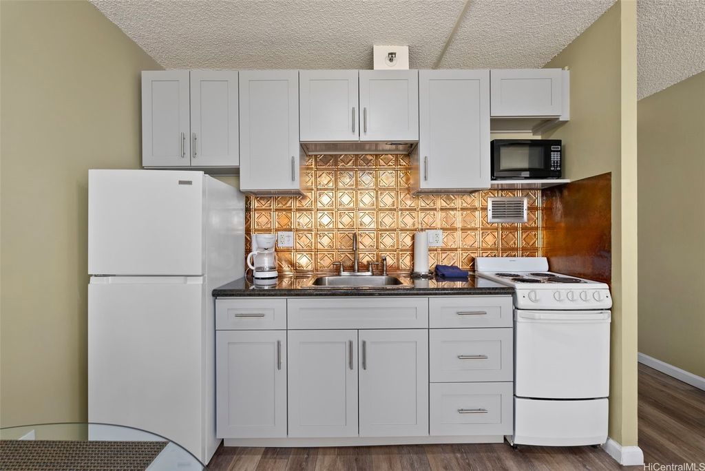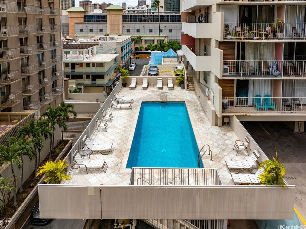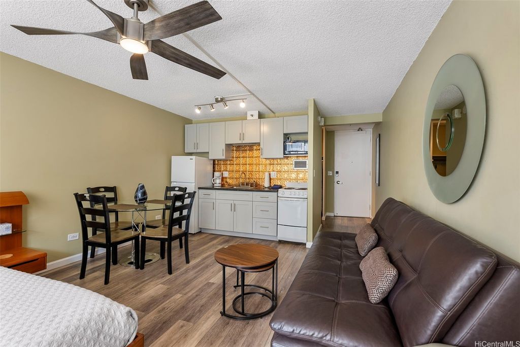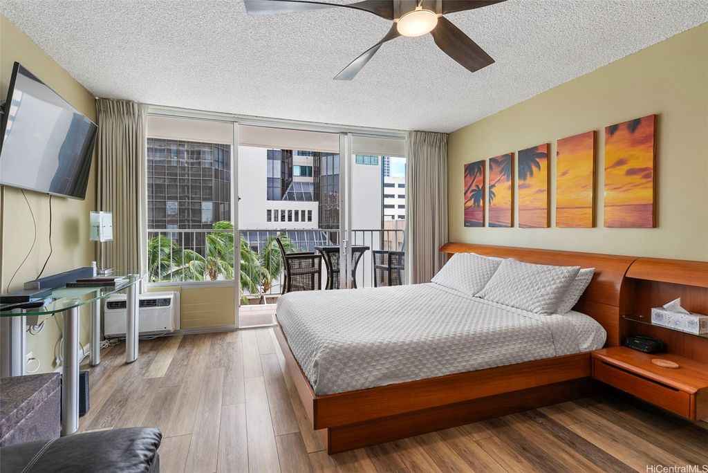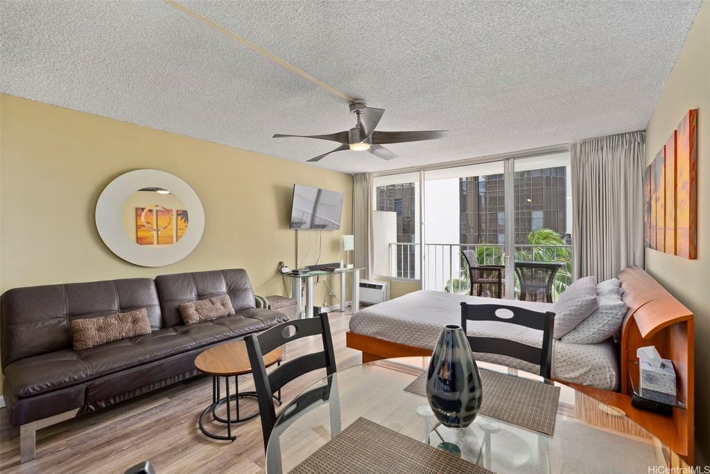 Amazing price for this legal short-term rental. A turn-key opportunity, ideally located right in the heart of Waikiki. This property is a gem for those looking to soak in the ambiance of a vacation stay at a world-class location, with renowned Waikiki Beach, diverse shopping experiences, and an array of amenities all within easy reach. This upgraded sleek and modern studio unit has both a cozy and versatile layout. The kitchen is a standout with its recent enhancements, featuring new cabinets and countertops along with the kitchen's gold-patterned backsplash that injects a dose of elegance. Relax and take in the sights around you on the comfortably sized lanai. The unit comes with a secured, assigned parking stall, community laundry on each floor, and a building pool.