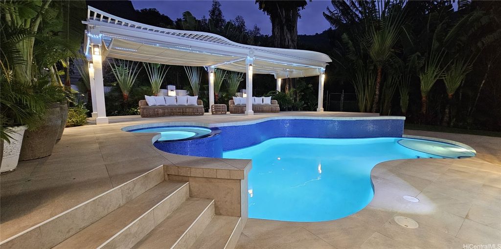 Classic island elegance harmonizes with contemporary luxury at this distinguished Nu'uanu estate. Thoughtfully designed, this residence offers four bedrooms (including 2 expansive primary suites & 2 private guest suites), along with 4.5 bathrooms & a spacious three-car garage, providing generous accommodations for both family & visitors. A custom architectural layout effortlessly blends indoor & outdoor living, creating seamless spaces for everyday comfort & stylish entertaining amidst lush natural surroundings. The gourmet kitchen is appointed with a striking curved Labradorite granite bar, professional-grade appliances & refined cabinetry, making it both beautiful & functional for culinary endeavors. Meticulously landscaped grounds foster a serene ambiance, anchored by an inviting pool & jacuzzi complemented by a custom-built gazebo for leisure & privacy. A newly constructed meditation deck overlooks Niniko Stream & its tranquil waterfall, adding to the home's sense of retreat. Upon arrival, guests are greeted by a resort-style porte-cochère & leading to a private sanctuary in the heart of Nu'uanu Valley. A TRULY UNIQUE RETREAT THAT MUST BE EXPERIENCED TO BE FULLY"‹"‹"Œ"‹"‹"‹"‹"Œ"‹"Œ"‹"‹"‹"‹"Œ"‹"‹"Œ"‹"‹"‹"‹"Œ"Œ APPRECIATED!