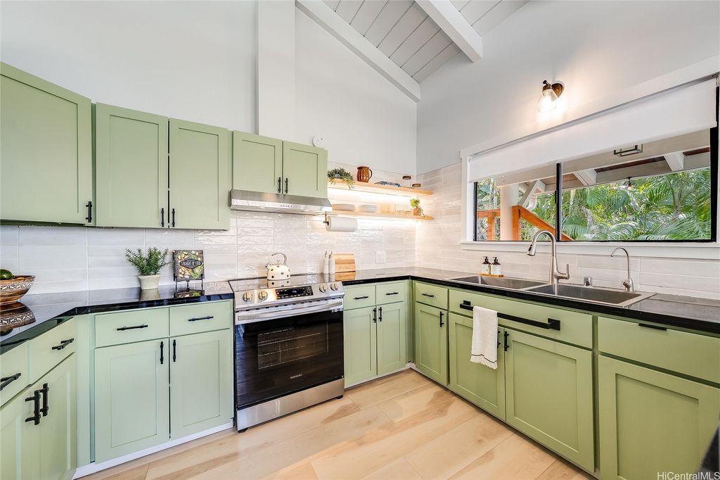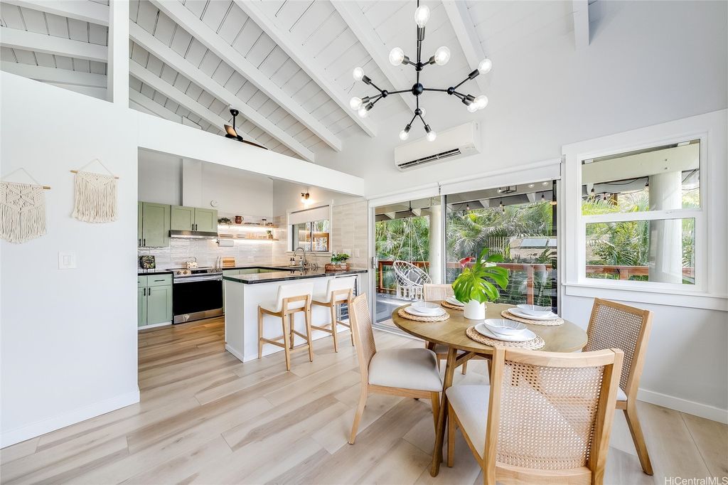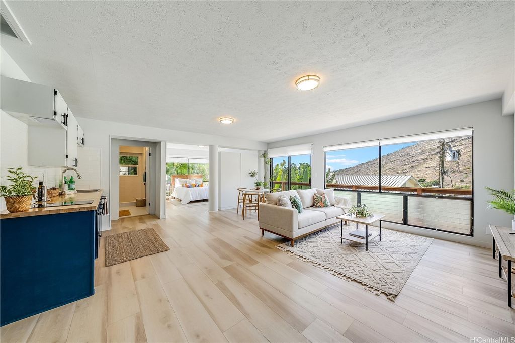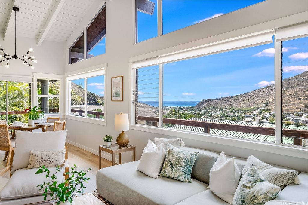 Perched between the mountains and the sea, this newly renovated Aina Haina property is a private retreat designed for active island living. The 3-bedroom, 2-bathroom main home features soaring ceilings, modern upgrades and panoramic ocean views that flow seamlessly to a wraparound lanai, perfect for enjoying your morning coffee or BBQs with friends. The well laid out kitchen is designed for those who love to cook or entertain and flows seamlessly into the open concept dining and living areas. The spacious primary suite includes two closets, a beautifully updated en suite bath and direct access to the deck to take in the serene surroundings. Split A/C's throughout and cool breezes provide year-round comfort. A separate rental unit below offers income potential or flexibility for extended living. Additional highlights include a large workshop, ample storage and a 2-car carport with surfboard racks. Nestled in a quiet hillside setting, this home feels secluded yet is just minutes from Aina Haina Shopping Center, dining, and surf breaks. This rare property truly combines privacy, modern living, panoramic views, and flexible spaces all in one exceptional home!