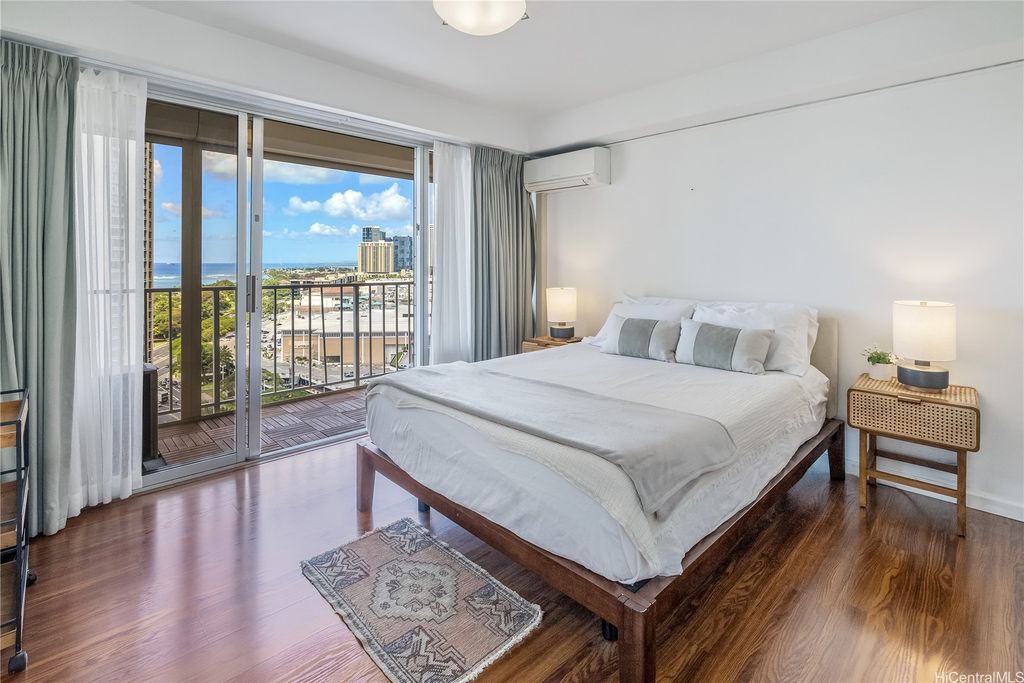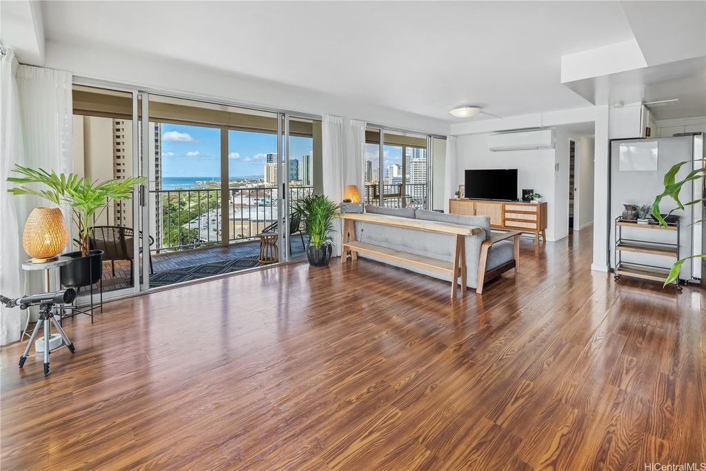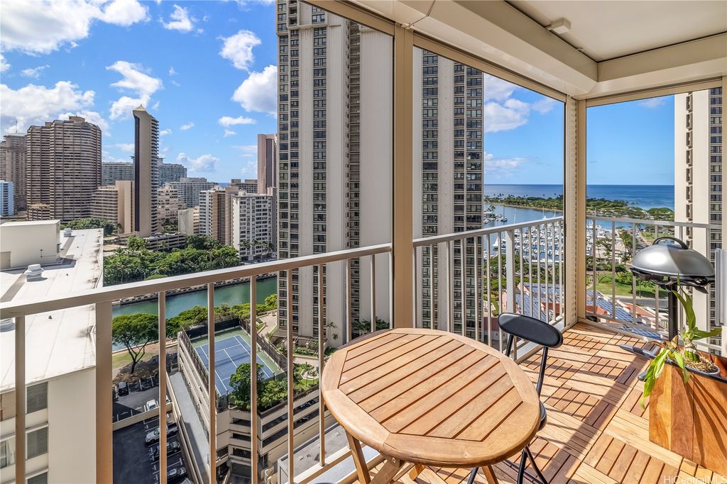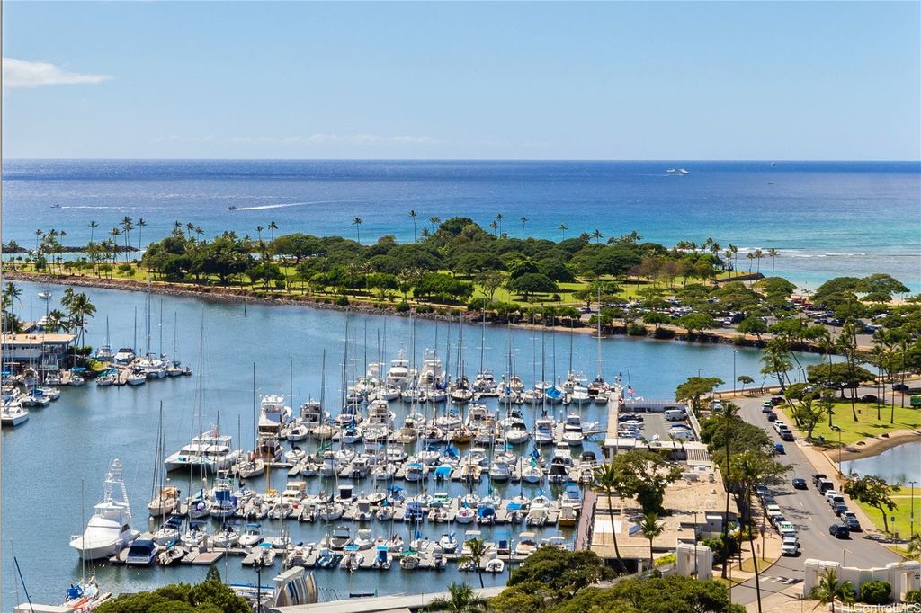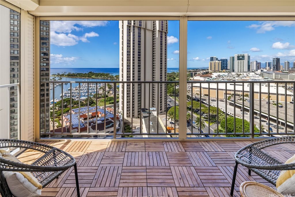 Sunset Towers #PH-2004 is rare find! Ideally located between Ala Moana and Waikiki, it's orientation is optimal for expereincing vibrant, surreal sunsets to inspire your soul! Offering a cosmopolitan lifestyle and stunning views from mountain to sea. This mid-century modern corner unit at the top of the buidling, features a generous wrap-around lanai (~273 sq. ft.) on the preferred Diamond Head (East) side, showcasing panoramic views of the ocean, harbor, canal promenade, Magic Island, and beyond. Floor-to-ceiling windows that invite natural light and breezes, emphasizing indoor-outdoor harmony. Thoughtful updates include motorized shades across the lanai, ideal for frequent travelers. Split AC units in every room ensure year-round comfort. Currently rented for over $5,900/month, #2004 also enjoys lower HOA fees than other two-bedroom units in the building. Mid century charm meets modern comfort and accessibility. NO showings until 10/1/25.Pet-friendly with some restrictions; buyer to verify. VA approved