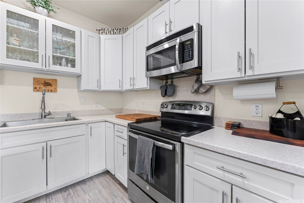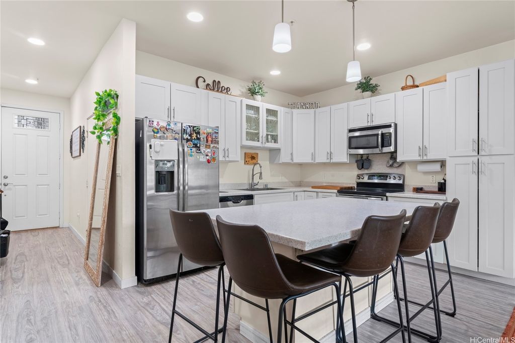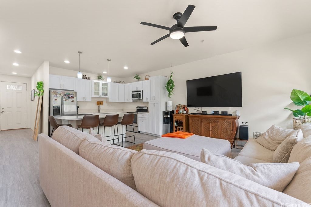 Welcome to O'ahu's "Second City"! Discover this stunning and highly sought-after 3-bedroom, 2.5-bath townhome in the vibrant community of Olino at Mehana in Kapolei. This beautifully updated home features remodeled kitchen cabinets, upgraded flooring, and an inviting open floor plan perfect for entertaining or relaxing. Recent updates include a new upstairs AC unit and kitchen fixtures. Enjoy the convenience of nearby shopping, dining, and entertainment, along with two parking spaces; one private garage and one open tandem stall. This home is located short drives to beautiful beaches, and lots of shopping options in proximity. Mehana residents enjoy resort-style amenities including a large pool, BBQ areas, parks, playgrounds, and the MAC center with a gym and party room. The neighborhood offers great local conveniences such as Dental offices, massage, salons, snack shops, barber shops and more. A wonderful home in a caring, tight-knit community. VA Loan of 2.375% interest rate, $2,887.75 monthly and loan balance $600,429.93.