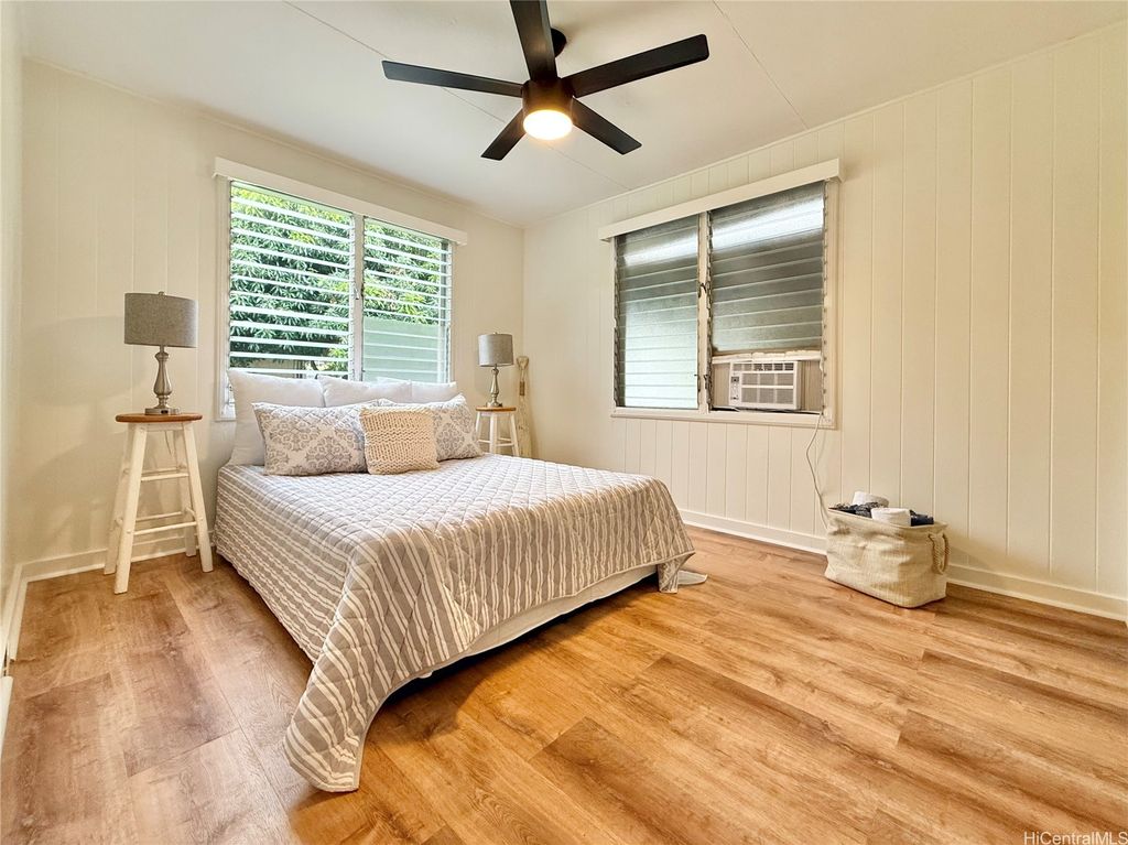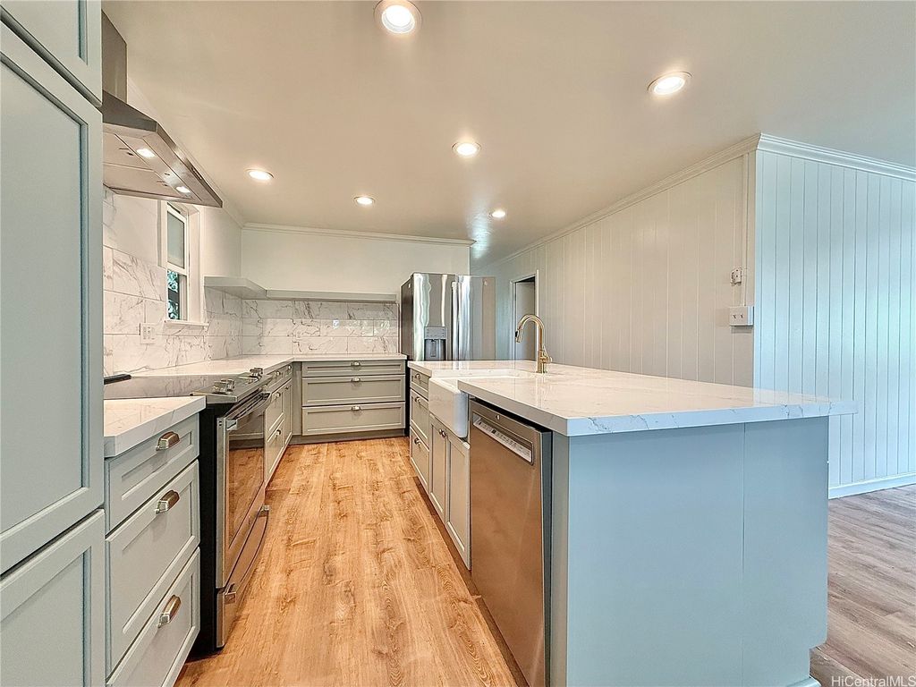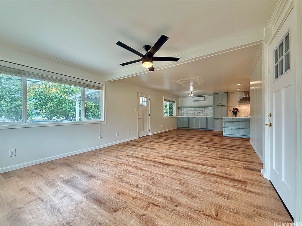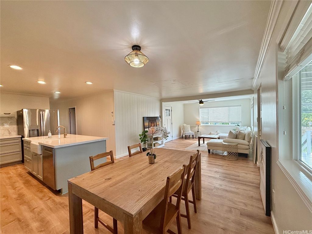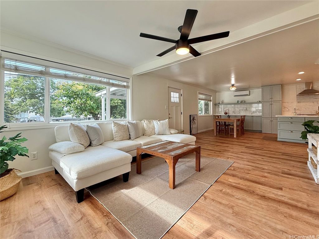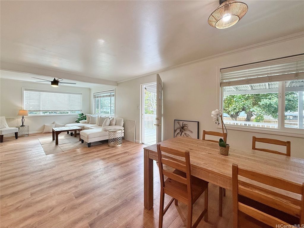 Island charm meets modern comfort in this beautifully remodeled 3BR/1BA Kaneohe cottage just blocks from the bay access and an ocean-hugging drive, minutes to shopping, dining, theatre, freeway access, and 15 minutes to Kailua or MCBH. The upgraded kitchen is a showpiece with solid wood cabinets, quartz countertops, pantry, extra storage, stainless steel appliances, and elegant gold fixtures. Inside, you'll also find consistent luxury vinyl plank flooring, new ceiling fans throughout, and a fully renovated bathroom. Nestled on a large corner lot, the home enjoys cool trade-wind breezes, has a green fenced front yard, front porch lanai, and covered parking for 2 cars. The tropical front and back yards have mature mango, ulu, banana, lime, papaya, puakenikeni, trees and more. Move-in ready with freshly painted exterior, and space to expand. This Hawaiian-style cottage blends location, lifestyle, and thoughtful upgrades for true island living. Note: Photos have been taken within the past six months, but home will have different furniture now as Sellers prepare to move.