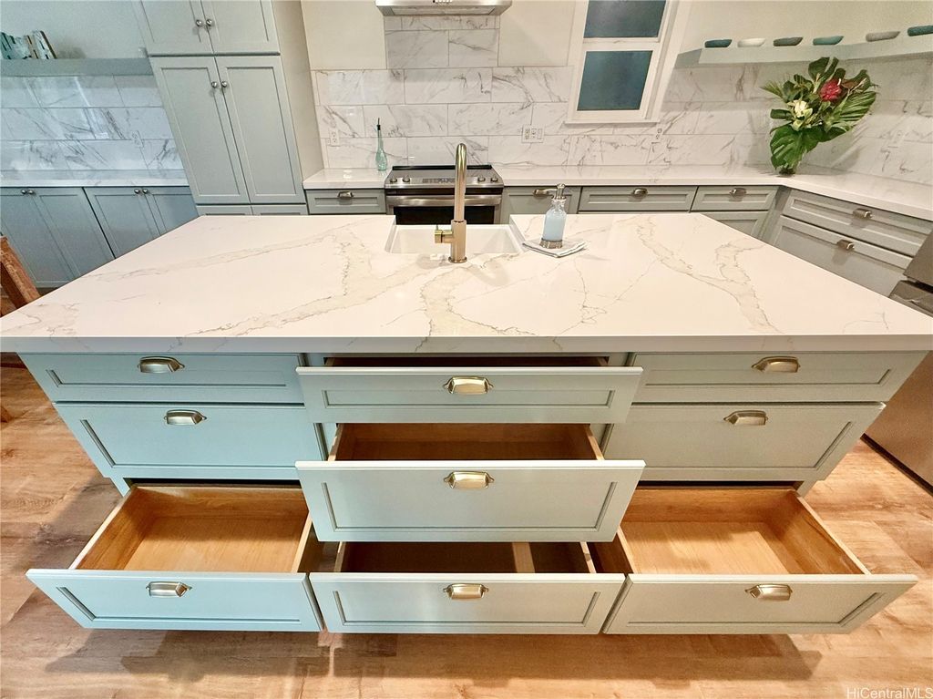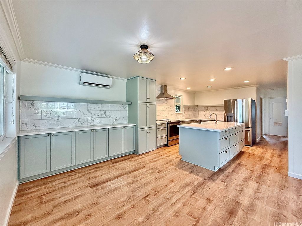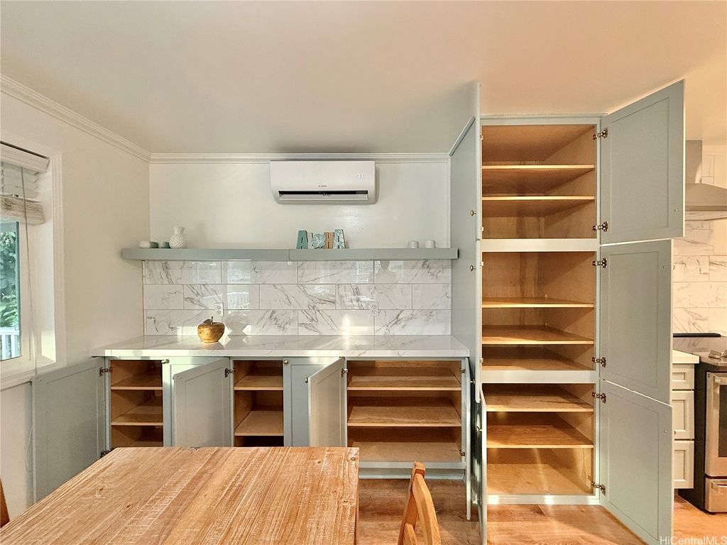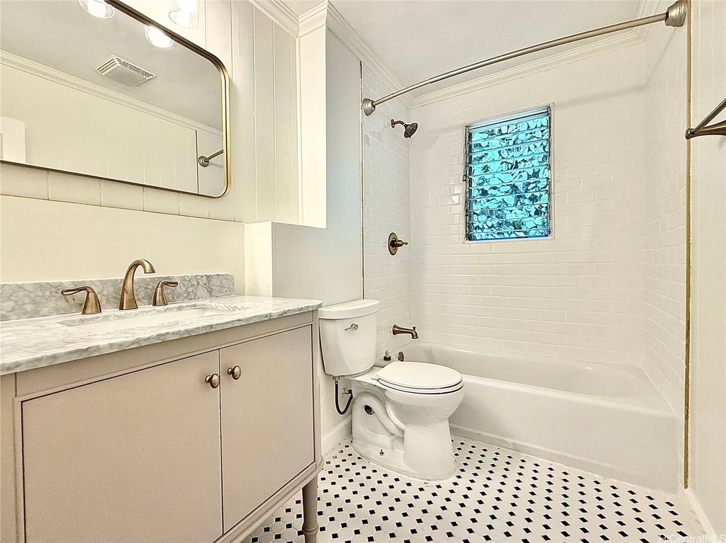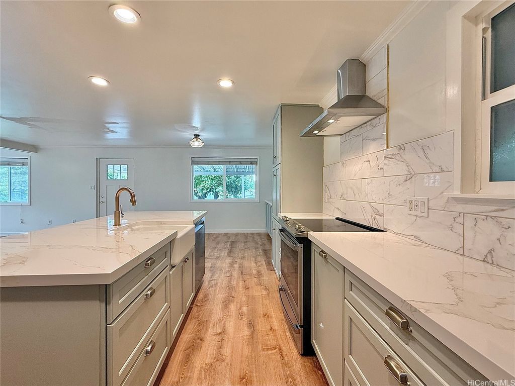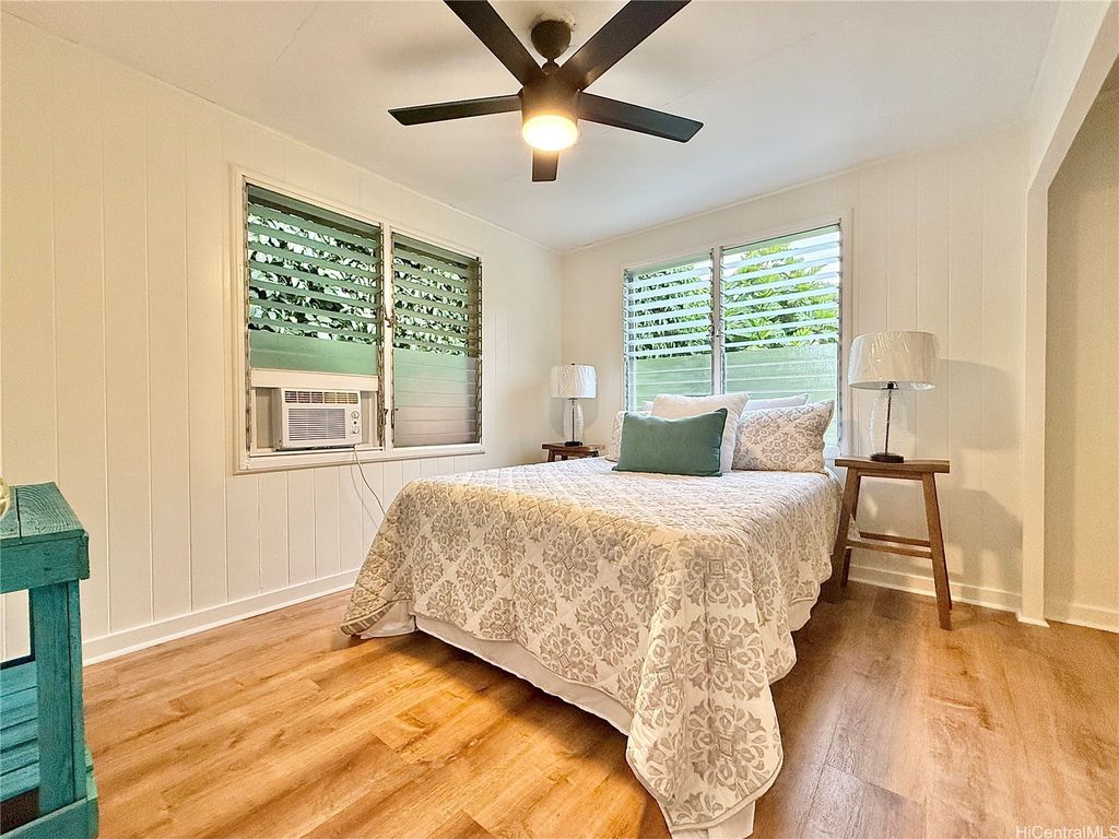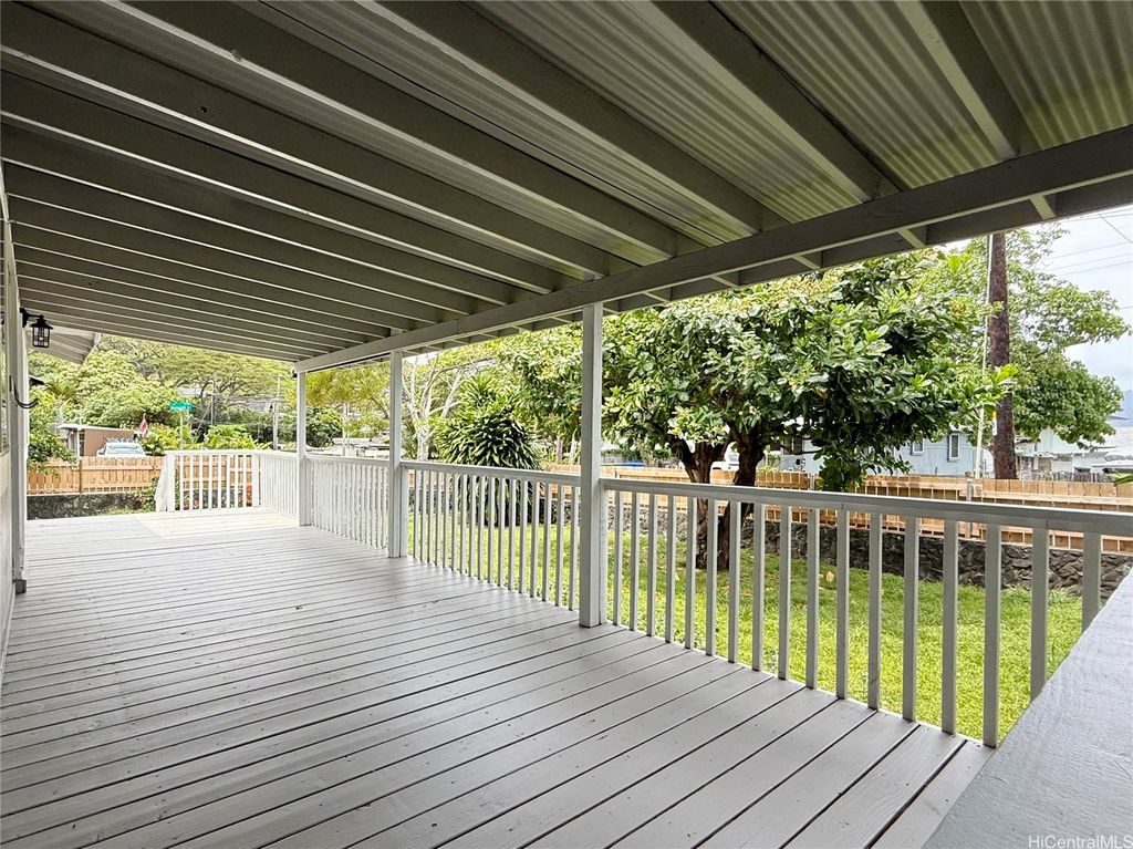 Island charm meets modern comfort in this beautifully remodeled 3BR/1BA Kaneohe cottage just blocks from the bay access and an ocean-hugging drive, minutes to shopping, dining, theatre, freeway access, and 15 minutes to Kailua or MCBH. The upgraded kitchen is a showpiece with solid wood cabinets, quartz countertops, pantry, extra storage, stainless steel appliances, and elegant gold fixtures. Inside, you'll also find consistent luxury vinyl plank flooring, new ceiling fans throughout, and a fully renovated bathroom. Nestled on a large corner lot, the home enjoys cool trade-wind breezes, has a green fenced front yard, front porch lanai, and covered parking for 2 cars. The tropical front and back yards have mature mango, ulu, banana, lime, papaya, puakenikeni, trees and more. Move-in ready with freshly painted exterior, and space to expand. This Hawaiian-style cottage blends location, lifestyle, and thoughtful upgrades for true island living. Note: Photos have been taken within the past six months, but home will have different furniture now as Sellers prepare to move.