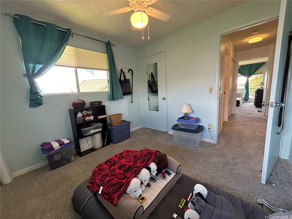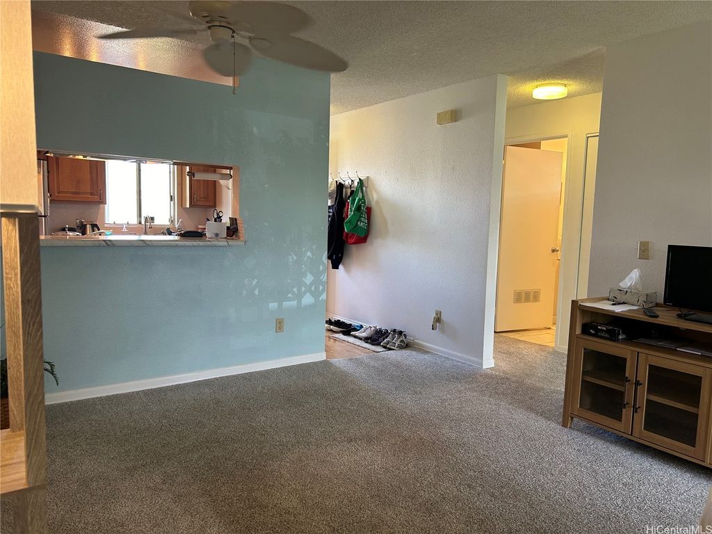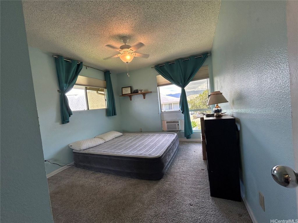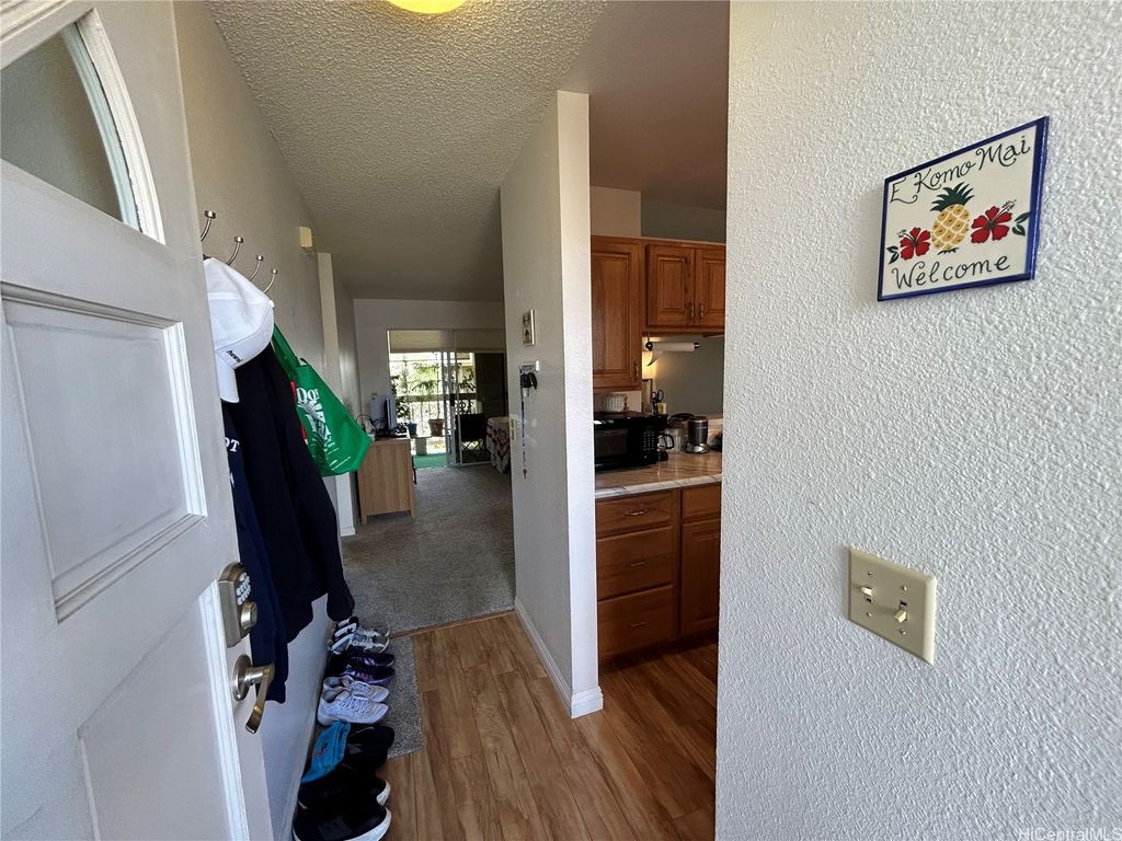 Well maintained move-in ready: Fee-simple, 2 bdrm/1ba 2nd floor end unit in quiet well maintained Ho'okumu at Waikele. The unit features plenty of natural light, west facing lanai for enjoyable sunset views. Bedrooms, living rm have ceiling fans. The primary/main bedroom has a window mounted A/C, and mirrored closet doors. New wall-to-wall carpet installed Oct. "˜24 in bdrms, hall, and living rm. The bathroom has a tub/shower combo w/sliding glass doors, recently installed porcelain tile floor and alcove with the in-unit washer/dryer. Kitchen has ceramic top stove w/self-cleaning oven, garbage disposal, and refrigerator. All cabinets are solid wood, a pass-through bar, and custom countertops. Kitchen and entryway has laminated wood flooring. Other features; EcoNet water heater less than 3 yrs old, RING doorbell system, electronic programmable front door lock, tinted windows with honeycomb style light filtering blinds, Hawaiian Telcom fiber- optic internet and cable access. 1 assigned parking stall, uncovered, guest parking avail with restrictions, nearby street parking. Complex offers car wash areas.