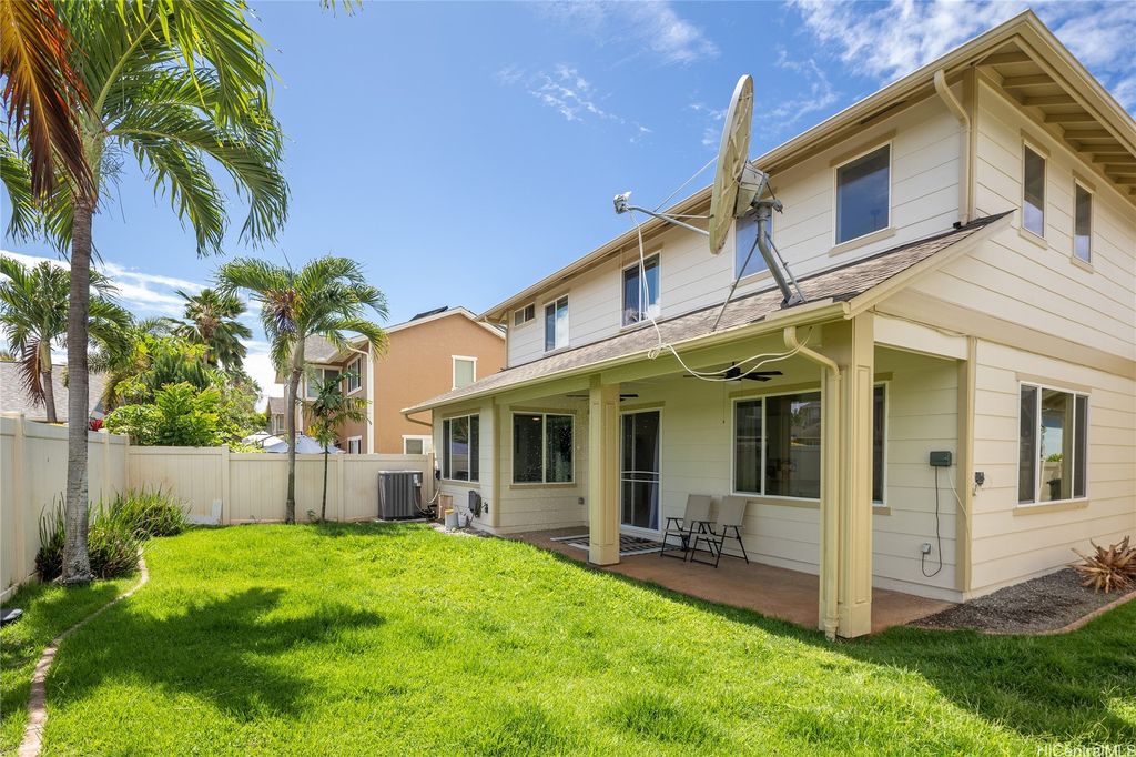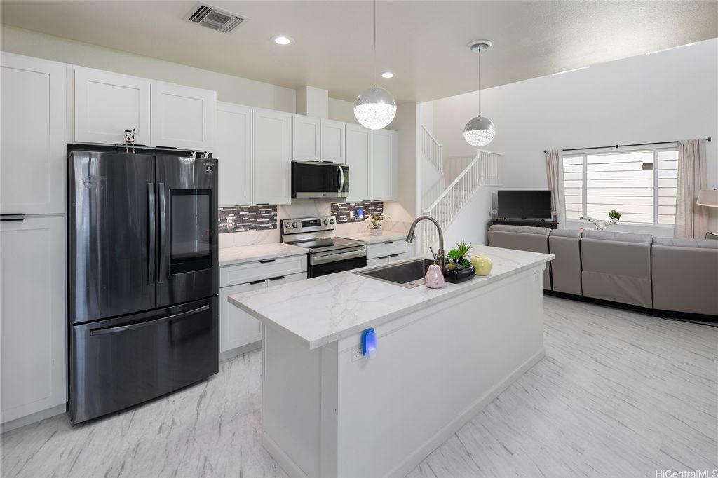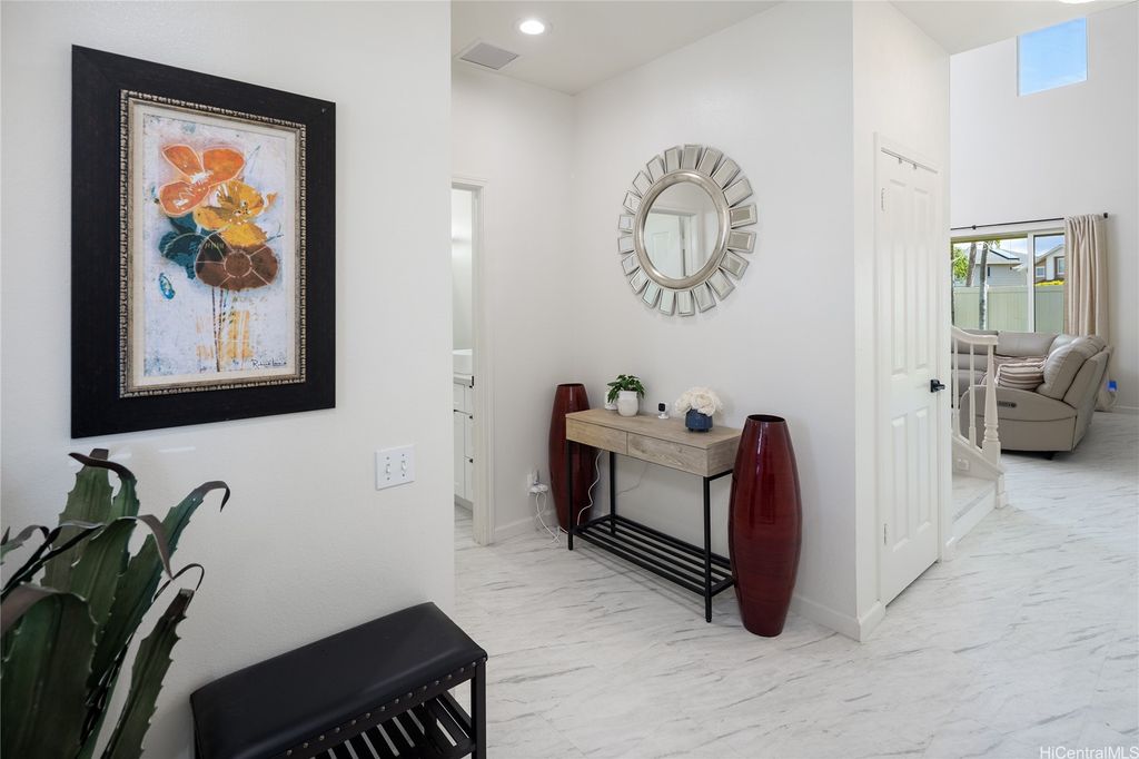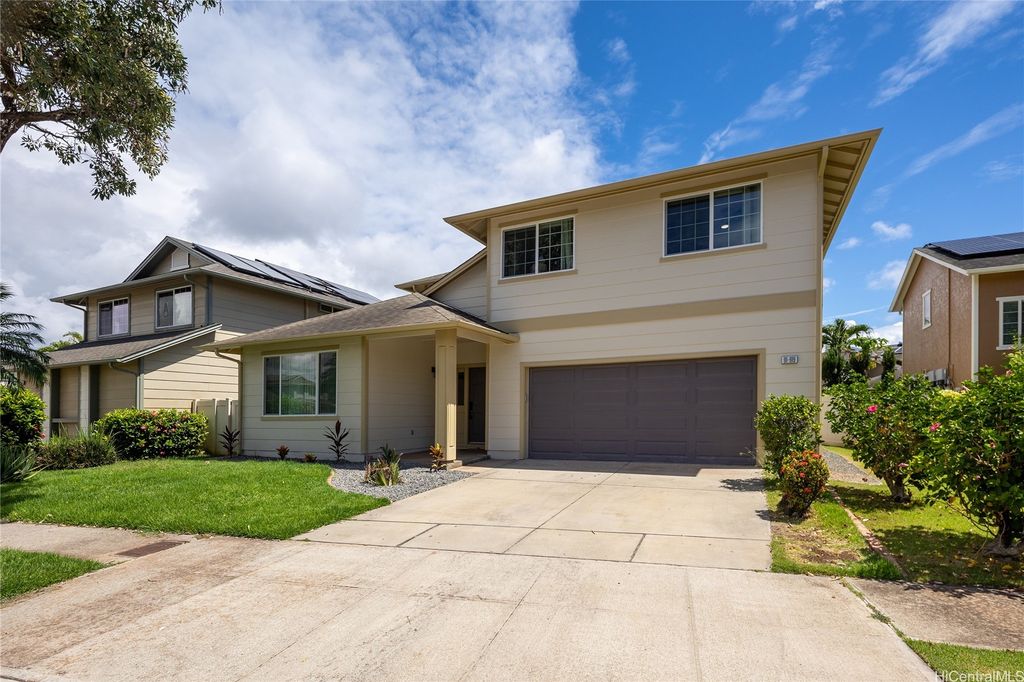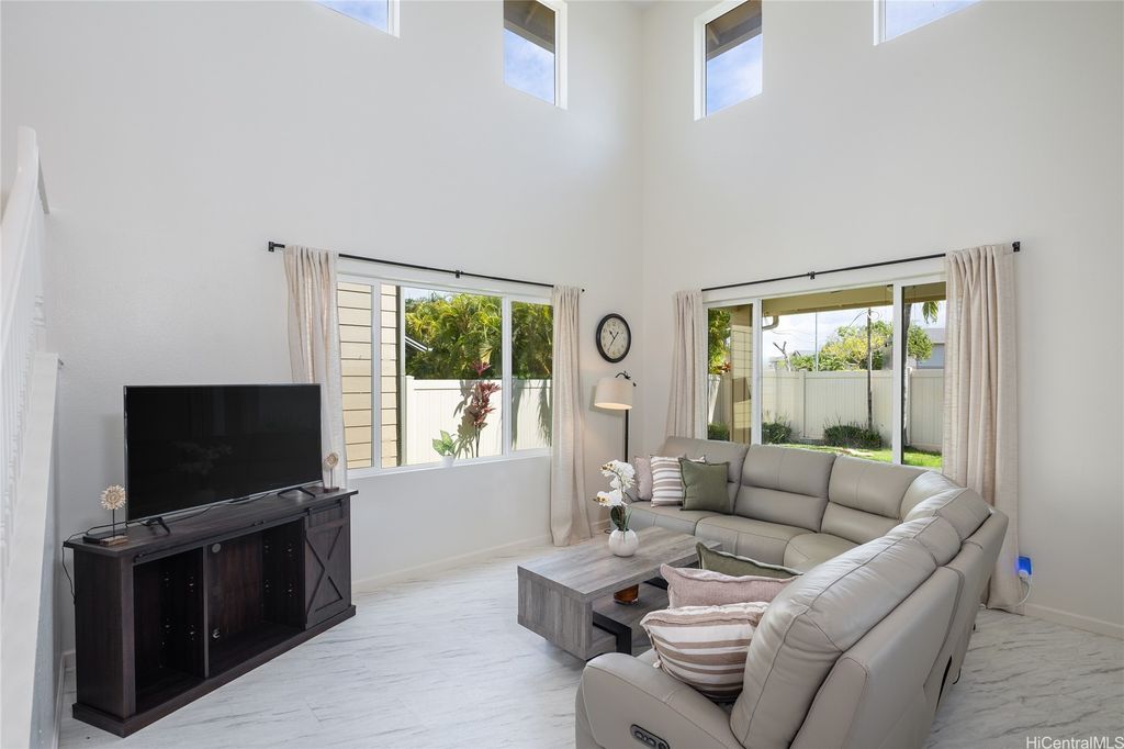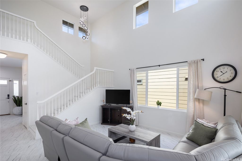 Stunning and fully upgraded, this Ewa Beach home is ready to impress. With NO MAINTENANCE FEES, it offers modern style and everyday convenience. The kitchen has been completely remodeled with custom cabinetry and sleek counters, creating a centerpiece that is both beautiful and functional. The living room opens to soaring two-story ceilings that fill the home with natural light and highlight the elegance of the open layout. Bathrooms have been thoughtfully redone with stylish vanities, tile, and fixtures, giving each space a fresh and refined feel. A BEDROOM and FULL BATH on the GROUND FLOOR provide comfort and flexibility. All NEW WINDOWS were just installed, adding style and reliable functionality throughout the home. Step outside to the spacious covered lanai, perfect for enjoying the beauty of Hawai"˜i, and a generous yard with ample room to make it your own. Parking is easy with an oversized two-car garage and additional driveway space. Located on a cul-de-sac, this home blends upgraded interiors, versatile outdoor living, and a convenient location near shopping, schools, and recreation. All furniture is available for purchase under a separate bill of sale.