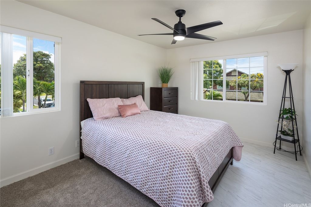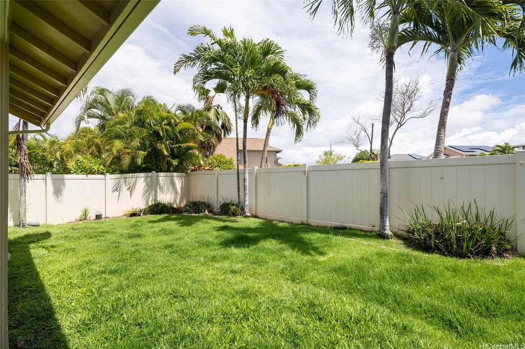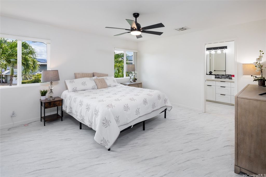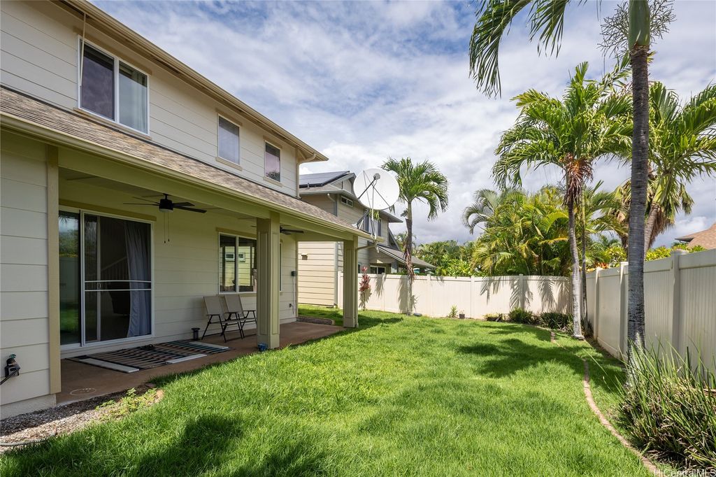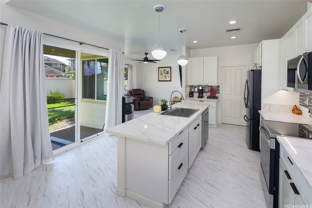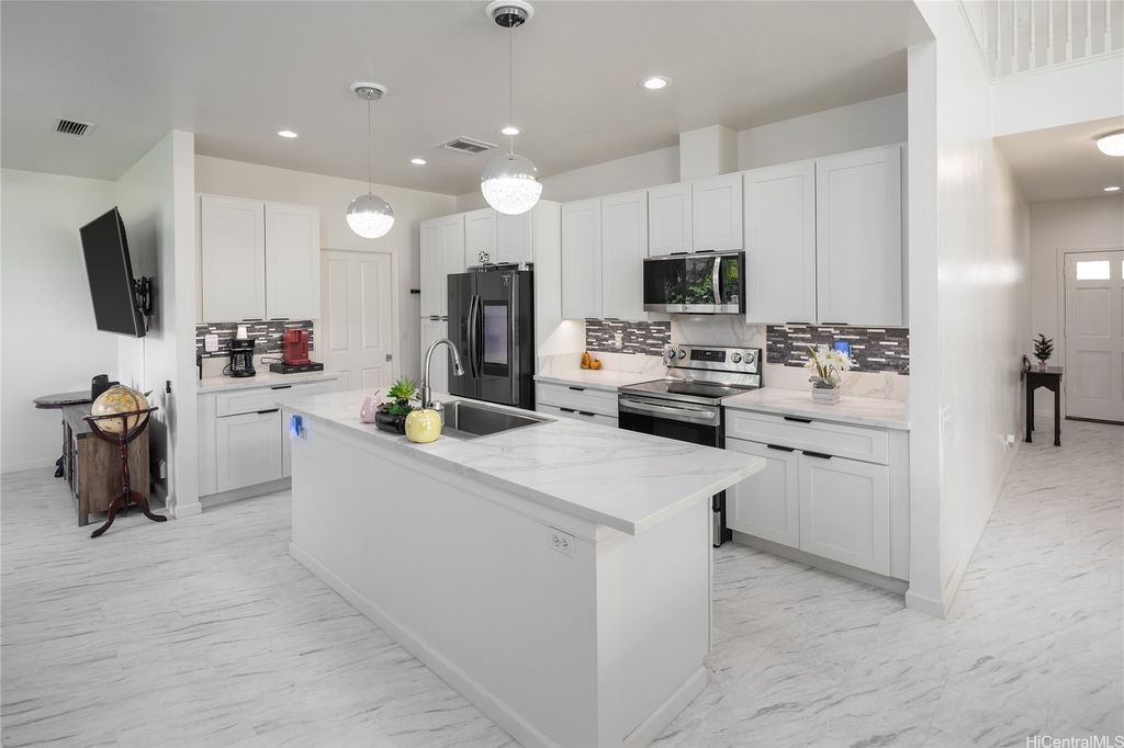 Stunning and fully upgraded, this Ewa Beach home is ready to impress. With NO MAINTENANCE FEES, it offers modern style and everyday convenience. The kitchen has been completely remodeled with custom cabinetry and sleek counters, creating a centerpiece that is both beautiful and functional. The living room opens to soaring two-story ceilings that fill the home with natural light and highlight the elegance of the open layout. Bathrooms have been thoughtfully redone with stylish vanities, tile, and fixtures, giving each space a fresh and refined feel. A BEDROOM and FULL BATH on the GROUND FLOOR provide comfort and flexibility. All NEW WINDOWS were just installed, adding style and reliable functionality throughout the home. Step outside to the spacious covered lanai, perfect for enjoying the beauty of Hawai"˜i, and a generous yard with ample room to make it your own. Parking is easy with an oversized two-car garage and additional driveway space. Located on a cul-de-sac, this home blends upgraded interiors, versatile outdoor living, and a convenient location near shopping, schools, and recreation. All furniture is available for purchase under a separate bill of sale.