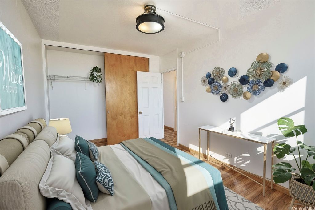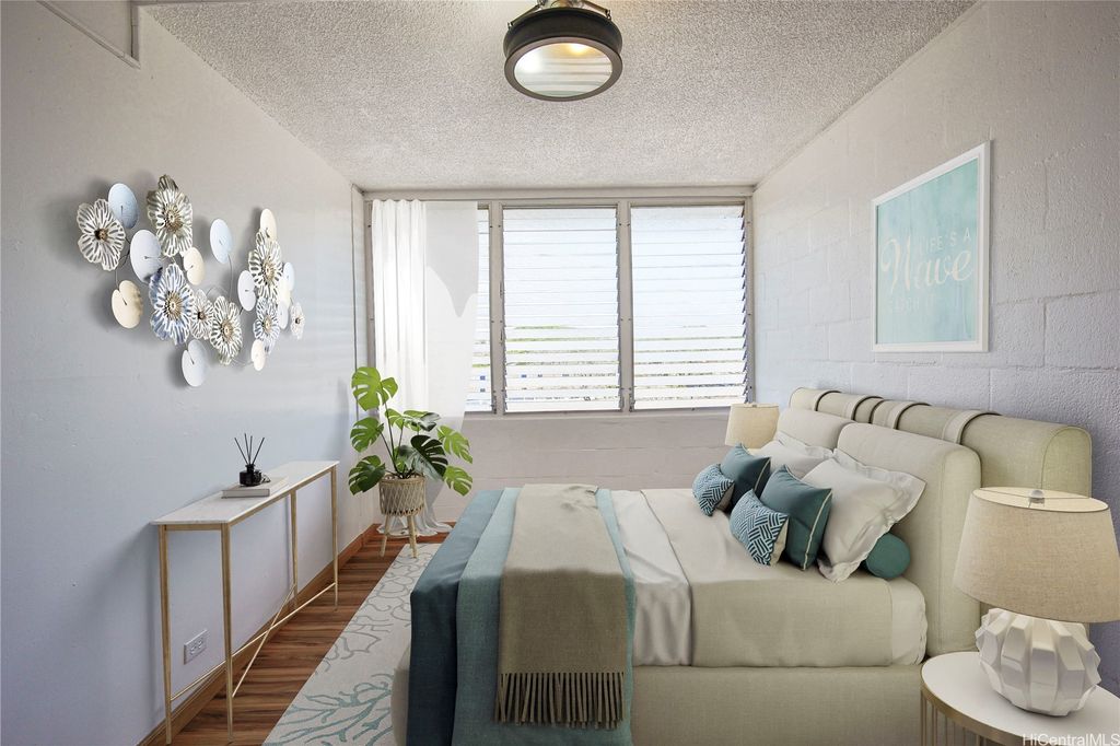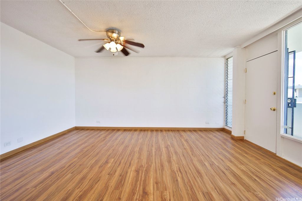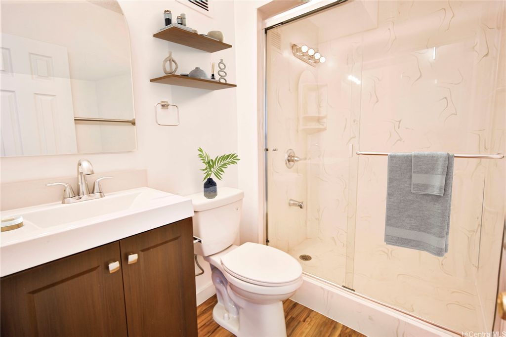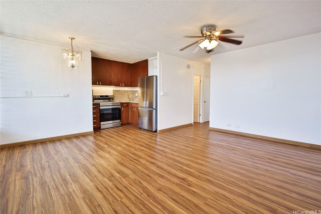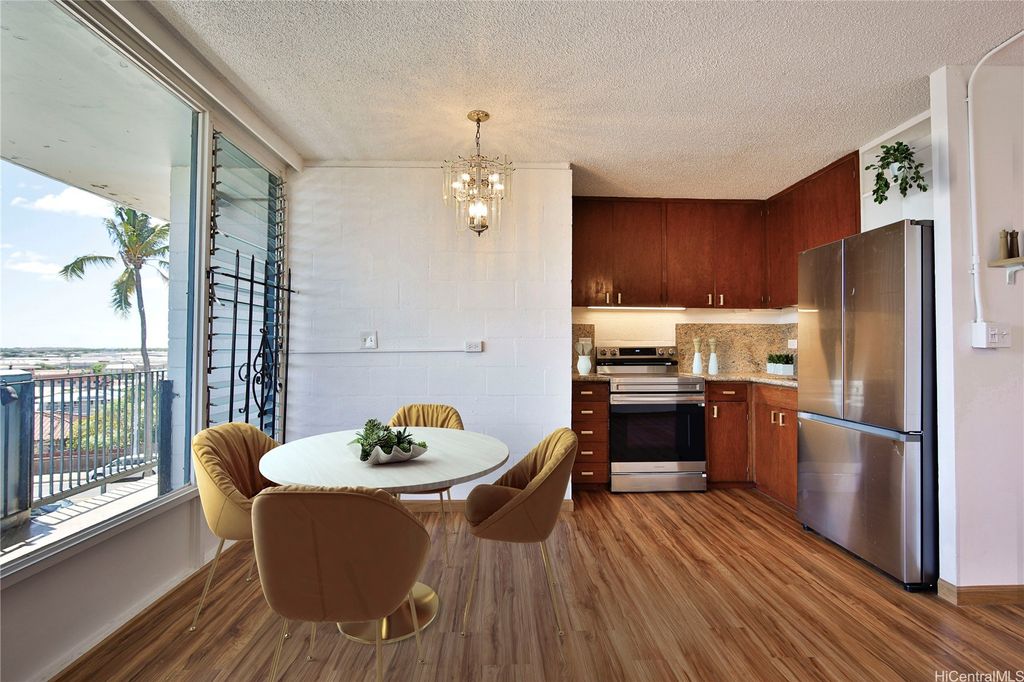 Bright and cool 2 Bedroom, 1 Bath unit situated on top floor with no unit above, remodeled kitchen with granite counter tops, new appliances, totally remodeled bathroom and new vinyl plank flooring throughout. One assigned open parking stall is located nearby at rear of building and 3 guest stalls at center of project. Monthly maintenance fee includes electricity, water, sewer and common areas. Private, gated front lanai entry for exclusive use. Photo Voltaic panels on roof assist with keeping utility costs lower.