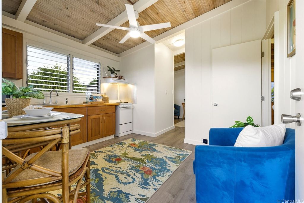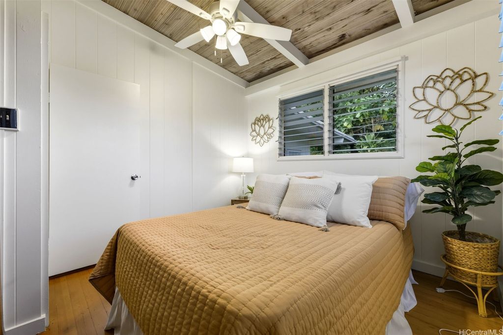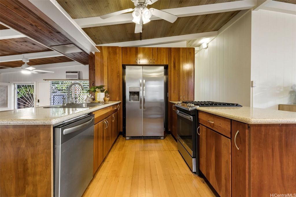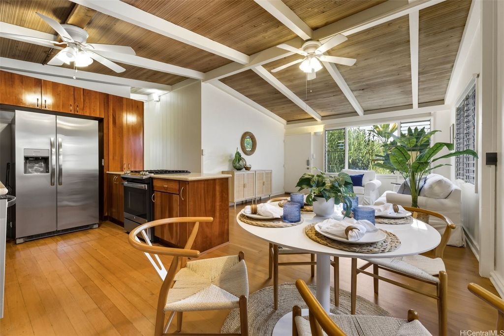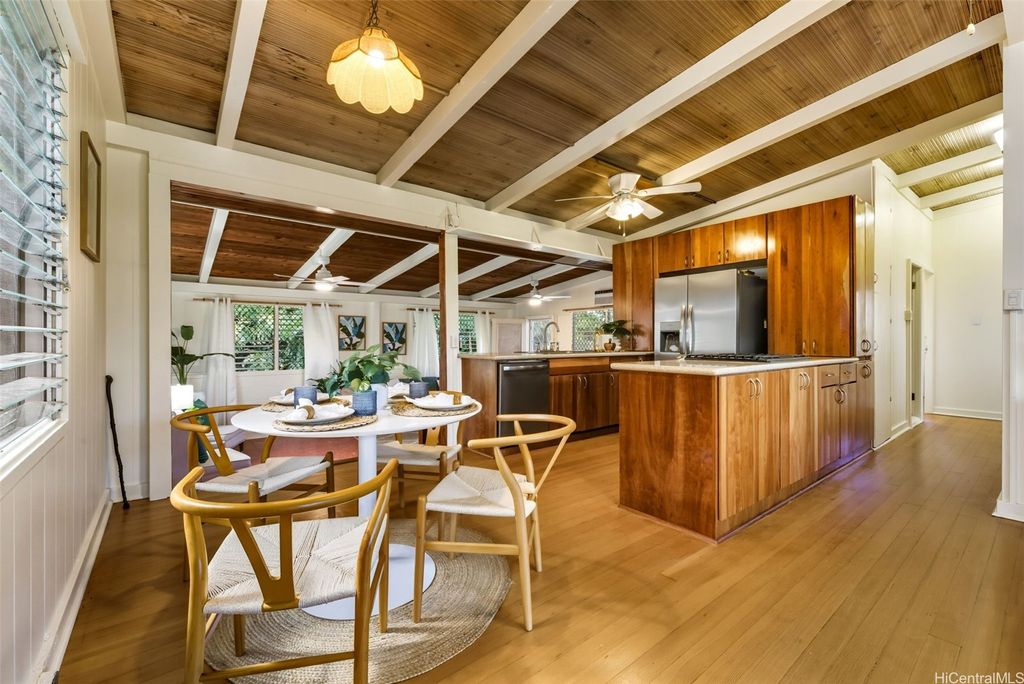 This 3-bed, 2-bath home blends classic island charm with thoughtful updates and flexible living. The expanded layout creates the perfect opportunity for an in-law suite, ideal for multi-generational living or visiting guests. The interior is full of warm, inviting details - from the white-washed combed pine ceilings to the stunning Douglas Fir hardwood floors that run through the main living areas. At the heart of the home is a kitchen that's both functional and beautiful. Solid cherry wood cabinets, composite stone countertops, a gas stove, and a brand-new refrigerator and dishwasher all come together in a layout that makes cooking and entertaining a joy. Enjoy excellent airflow with 7 ceiling fans, 2 AC units, and the added bonus of 24 OWNED solar PV panels. The yard is a true retreat. Both front and back yards offer plenty of space to relax, unwind, or entertain. Plus, a curated garden of native Hawaiian plants, herbs, and fruit trees"”including mango, guava, and avocado. If you've been looking for a Kailua home that offers character, functionality, and charm, this one is definitely worth a look.
