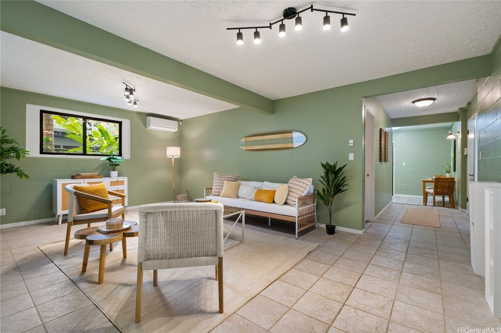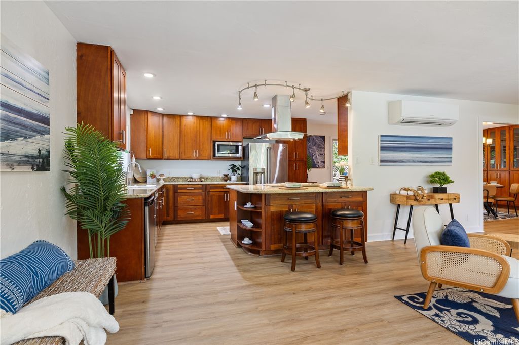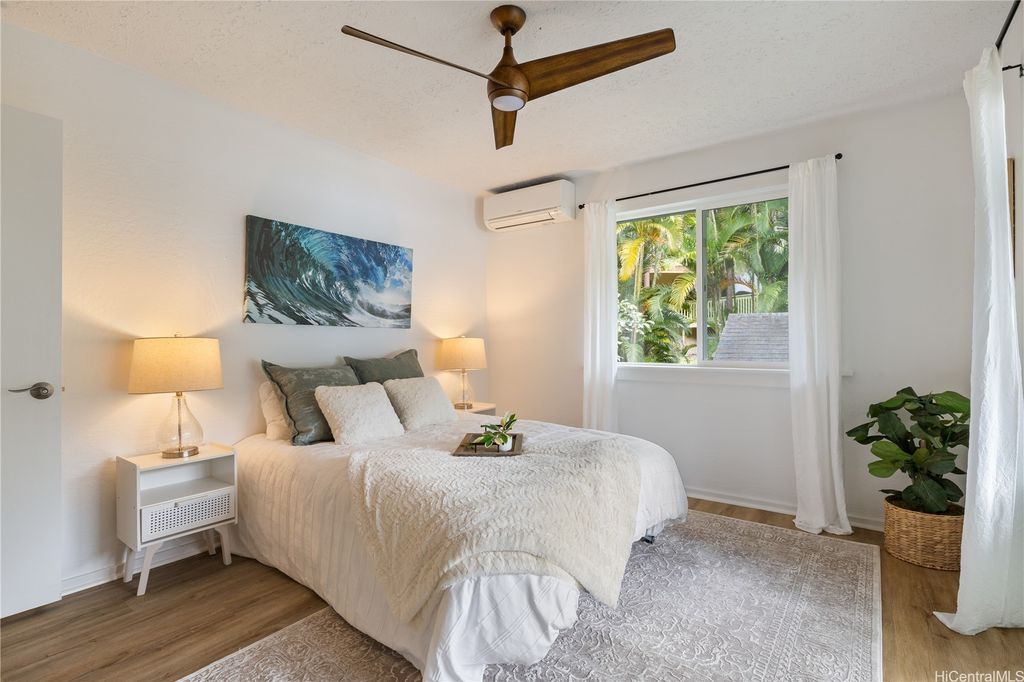This unique, multi-generational property features a total of 5 bdrm and 4.5 bth, offering an incredible opportunity for both comfortable living and rental income. The main house boasts a spacious layout with 3 large bedrooms and 2.5 bathrooms. Two of the bedrooms enjoy their own private outdoor space. In addition, you can utilize two separate 1-bdrm rentals, each equipped with its own kitchenette, perfect for family, guests, or as an income-generating investment. Sustainability and luxury meet with 76 owned PV panels and three tesla powerwalls, solar and tankless hotwater system reducing electric bills while supporting a greener lifestyle. Enjoy summers in comfort with split AC units throughout the home and a Tesla car charger for eco-conscious drivers. Relax on the large covered lanai, where you can take in the lush, serene surroundings, which include two tranquil waterfalls that enhance the landscape. Enjoy breathtaking views of the iconic Koolau mountains framed perfectly from your living room windows, providing an idyllic backdrop for your daily life. Additional features include an oversized two-car garage, a large, gated, fully fenced yard, and a storage shed.