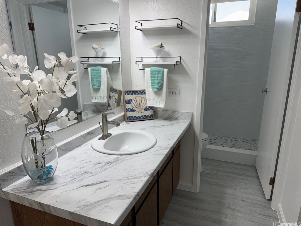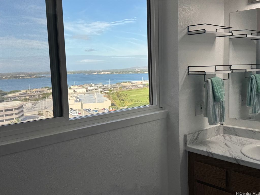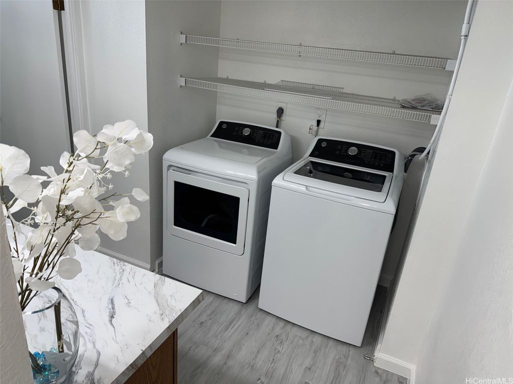 17th floor 2 bdrm/2 bath/2 covered pkg stalls, just renovated with luxury vinyl plank with 73% sound proof underlayment throughout the unit. Both bathrooms were totally renovated with own shutoff valves, new pipes, new toilets and more. New washer/dryer were installed. Split system AC with two unit (Living room/Primary/Main bedroom). Both bedrooms' window were replaced with newer UV control windows. No more popcorn ceiling and new paints throughout. Beautiful Pearl Harbor View from both bedrooms and Lanai area. Very bright and cool unit. Split system AC was recently service by Hydrokleen. Fire sprinklers are in the unit and currently Emergency Radio System is also installed soon-(A and B building are done). 100% Hurricane insured. Great Amenities with Pool, Jacuzzi and 2 tennis courts and 2 areas of BBQ with private grassy parks. Surrounding by beautiful Plumeria trees in Koauka Loop. Across from Pearl Ridge Mall, Longs Drug store, Bus stop and Bank and Pali Momi/Kaiser hospitals and many restaurants in neighborhood.