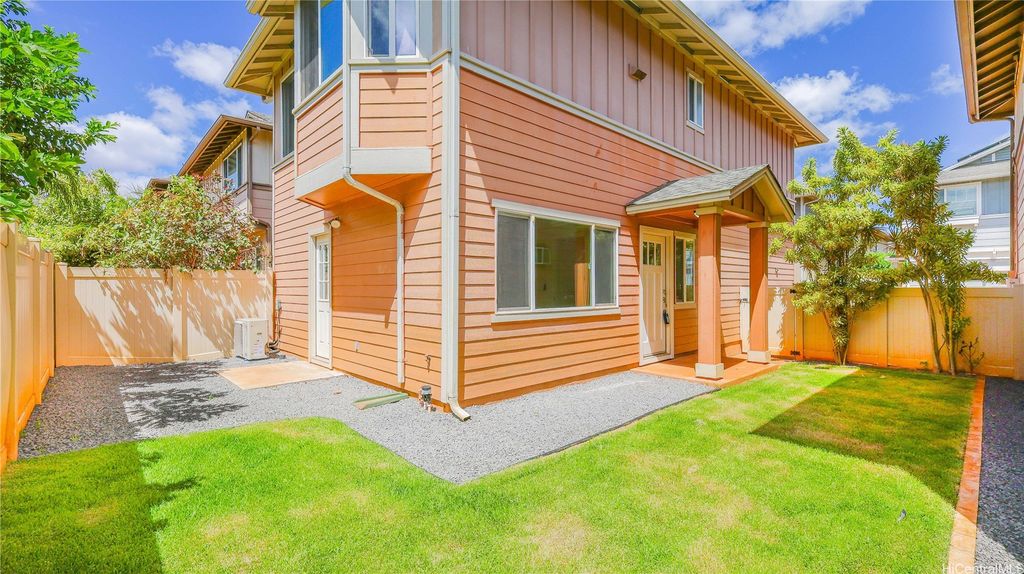 Beautifully maintained 3-bdm, 2-bath, 2-story home available for rent in the highly desirable Montecito/Tuscany community of Ewa by Gentry. This 1,136 sq. ft. home features the floor plan with the primary bedroom suite with spacious walk-in closet located on the ground floor, while the kitchen, living room, and additional bedrooms are upstairs. The new central AC system will keep you cool. The backyard has been freshly landscaped and includes a sprinkler system"”yard care is included for your convenience. Enjoy the benefits of a 2-car garage with built-in storage cabinets plus an additional third parking stall. One small pet may be considered with excellent references, renter's insurance, and a pet deposit. Ideally located near the community pool and just steps from a beautiful community park outside the complex. This home offers comfort, convenience, and a welcoming neighborhood atmosphere. Water & Sewer included in rent. Tenant pays Electricity, Cable, Internet & Phone. Minimum 1 yr rental agreement, good credit, excellent references, and renter's insurance are required. $30.00 application fee per adult.