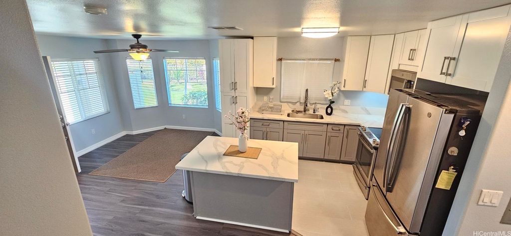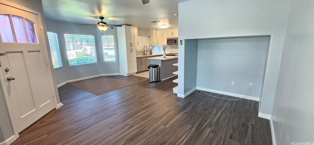 Corner End Unit, Pet Friendly, Central AC, Photovoltaic Solar, Excellent Condition! This beautifully renovated Spinnaker home was updated in 2024 and offers modern, high-quality finishes throughout. The kitchen features custom shaker cabinets, quartz countertops, stainless steel appliances, and new vinyl/tile flooring. The home remains comfortably cool year-round with central air conditioning, powered by PV solar, resulting in electricity bills as low as $30 per month, PLUS, water and trash is included. The main bedroom includes a spacious walk-in closet, a mounted TV, and a generously sized en-suite bathroom with a walk-in shower designed for ease and comfort. The second bedroom is equipped with custom shelving and a built-in desk, ideal for an office or gaming room. The third bedroom is furnished with a built-in Murphy bed, maximizing space and functionality. Half bathroom downstairs comes with a toilet and a urinal. The home also includes a FOB key granting access to the resort-style pool and community area. Lots of nearby guest parking. Please text for showings and questions 808*492*2946.