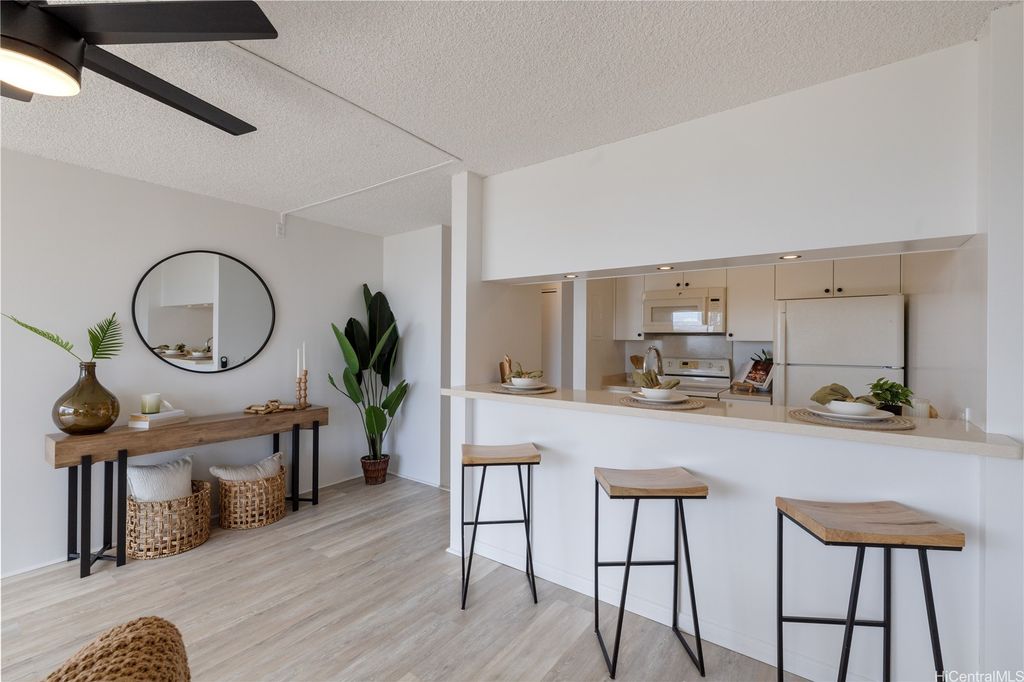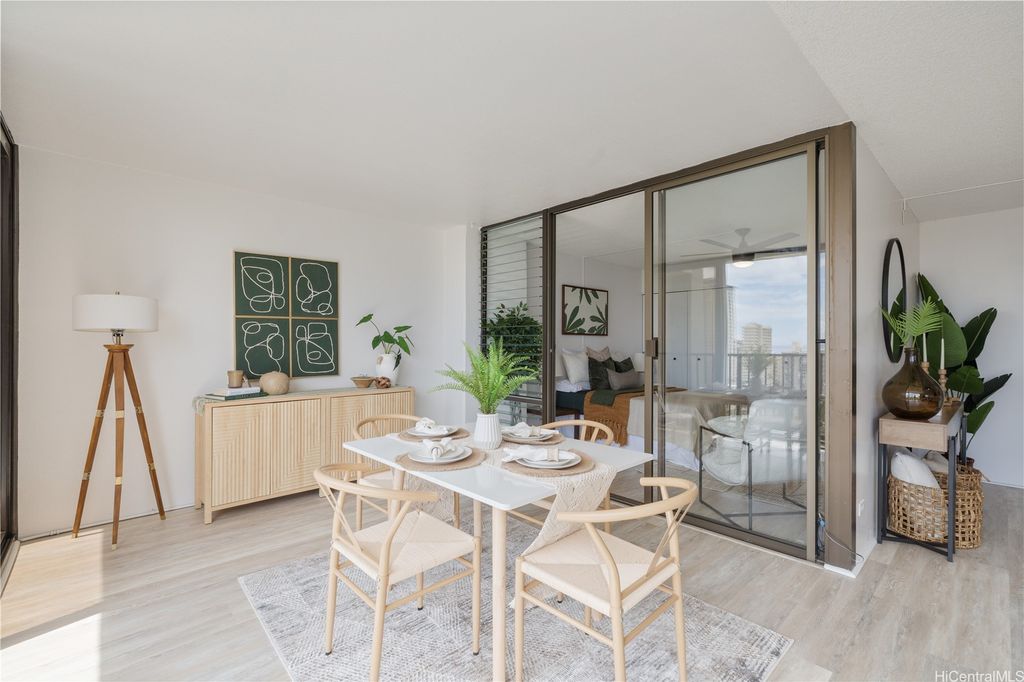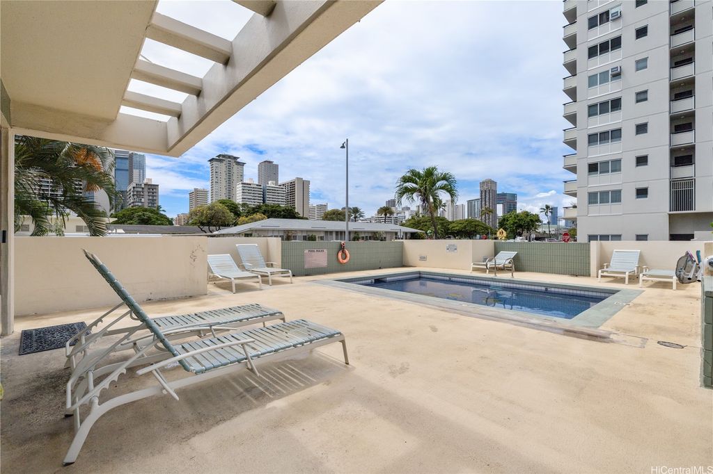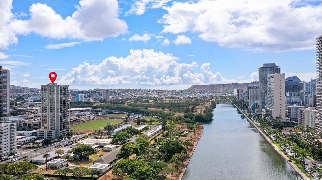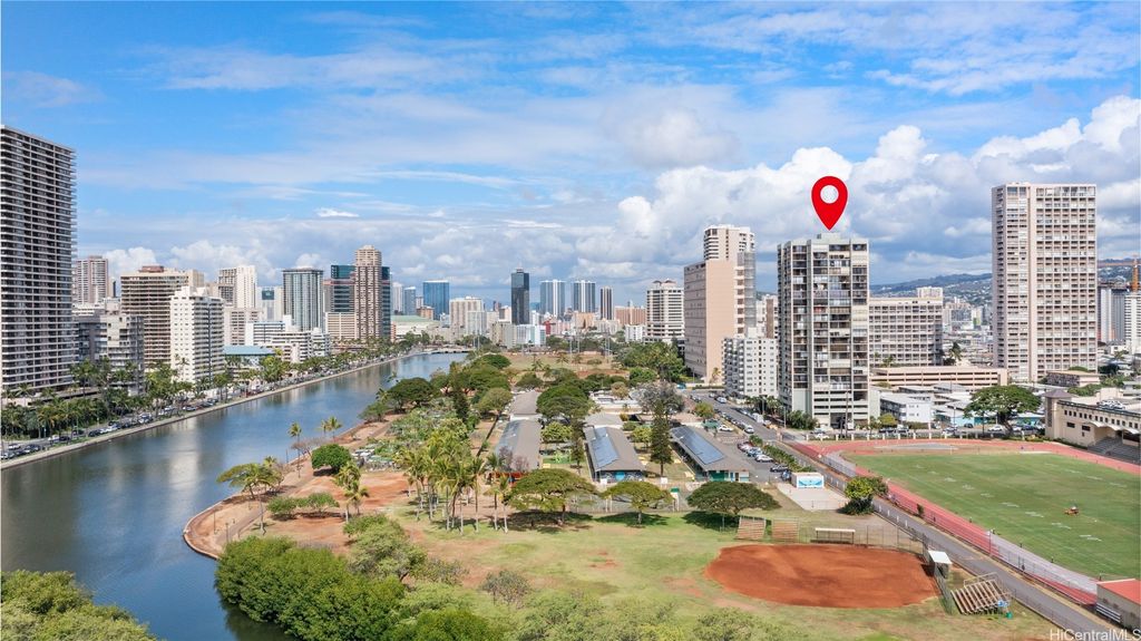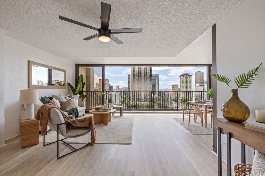 Wake up every day to the beauty of Honolulu in this captivating 1-bedroom, 1-bath home at Kaimana Lanais. With 810 sq. ft. of expanded interior space, the enclosed lanai creates an airy, open layout designed for both relaxation and entertaining. Freshly updated with luxury vinyl flooring, new light fixtures, sleek Corian countertops, and crisp paint, this residence blends modern comfort with timeless island style. Floor-to-ceiling multi-slide doors bring in dazzling views of the Waikiki's skyline, vibrant city, ocean, Diamond Head, and spectacular sunsets"”your personal postcard from paradise. The walk-in shower adds a touch of everyday luxury, while building amenities elevate your lifestyle with a pool, recreation room, surfboard racks, secure entry, and pet-friendly living. Perfectly located in Kapiolani, you're minutes from Waikiki, Ala Wai Golf Course, UH, beaches, parks, shopping, and entertainment. Move-in ready, meticulously maintained, and waiting for you"”schedule your showing today!