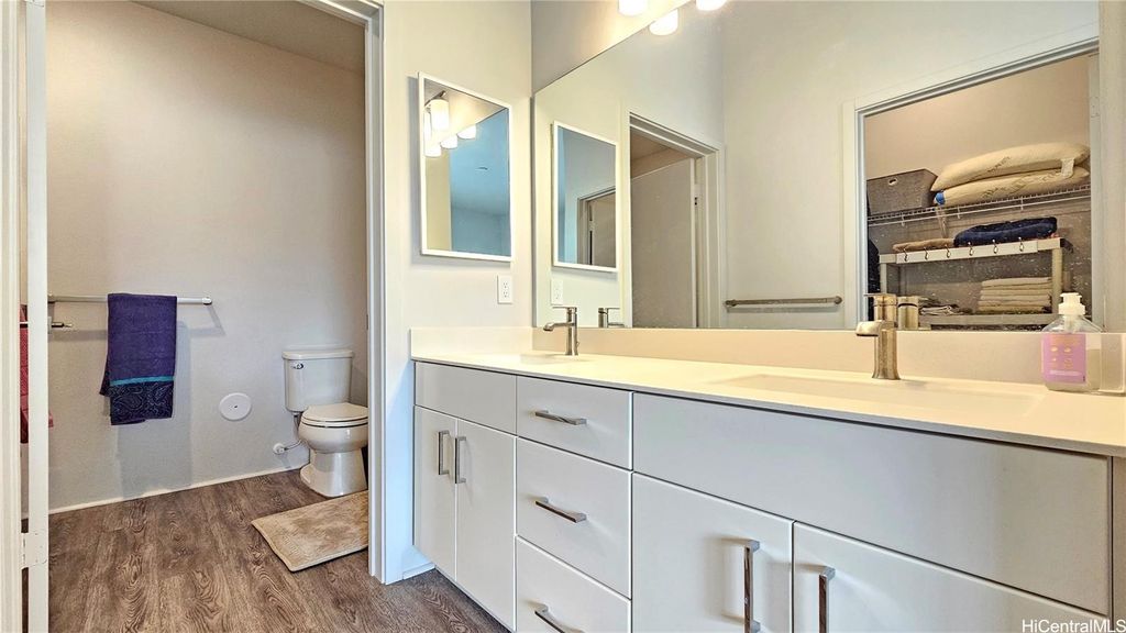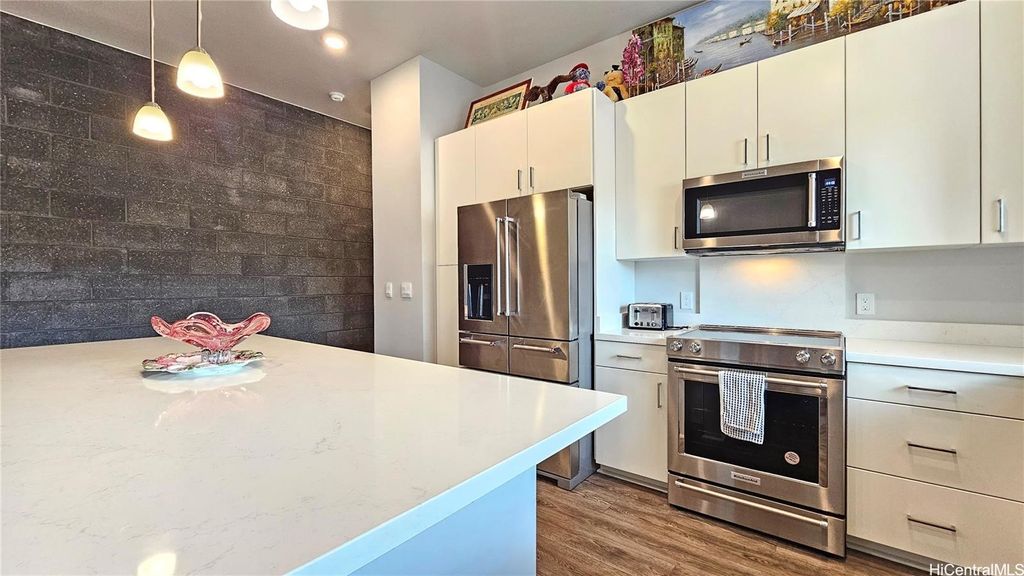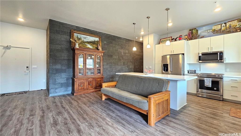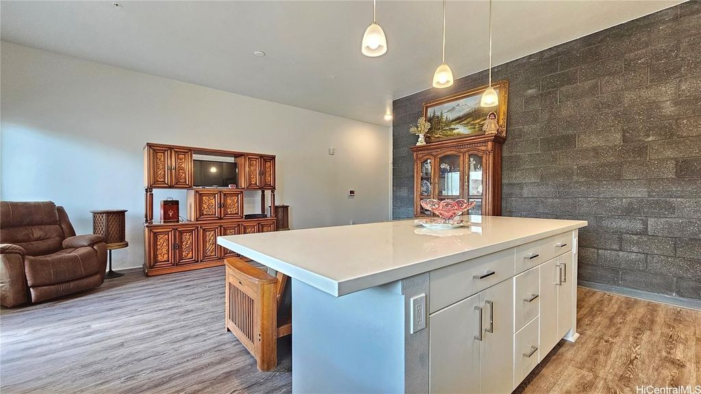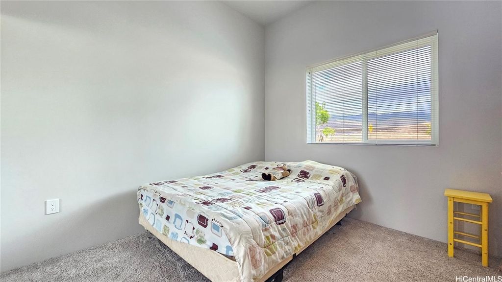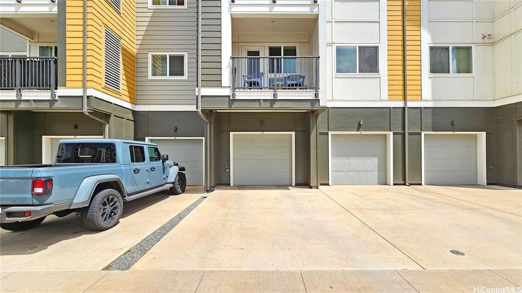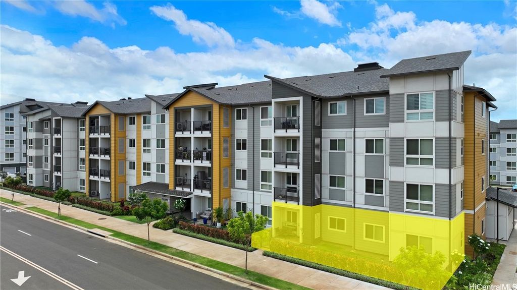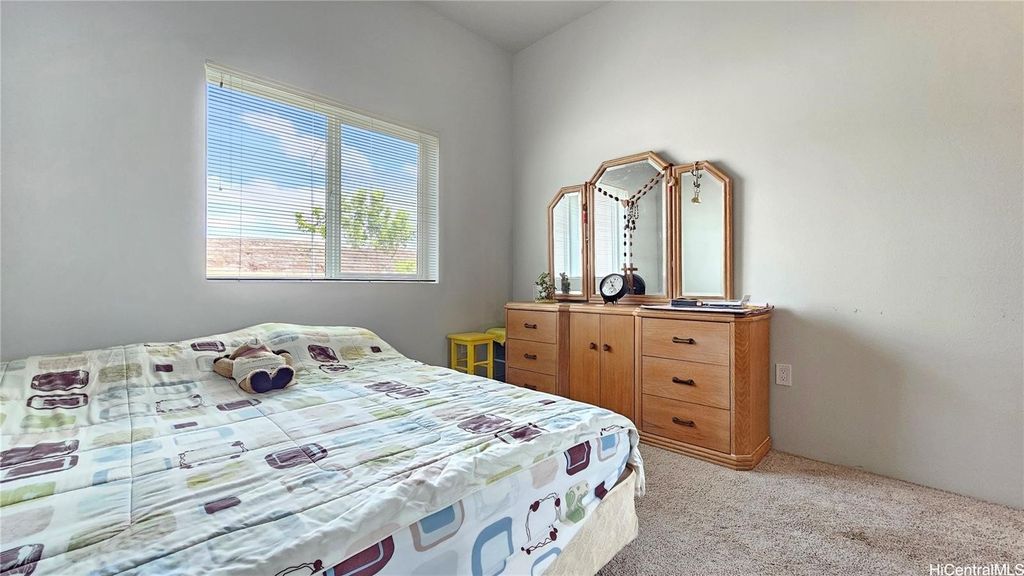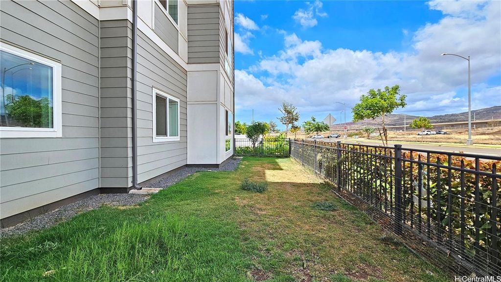 Rarely available single-level, ground-floor, corner unit 3 Bedroom / 2 Bath townhome with a spacious living area and private yard. This corner unit offers an open-concept layout with a kitchen island, ideal for both daily living and entertaining guests. The primary bedroom includes a walk-in closet and a private ensuite bathroom with dual sinks and shower. A second bathroom comes equipped with a full-size bathtub. Extra windows throughout the unit bring in abundant natural light. Modern comforts include air conditioning and a full suite of appliances: range/oven, microwave hood, dishwasher, refrigerator, and in-unit washer and dryer. Conveniently located just one block from the Hoopili rail station. The community features a variety of amenities, including a pool, parks, a dog park, soccer fields, and more!